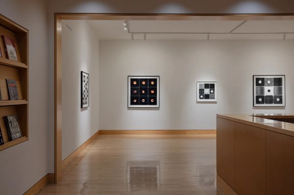 In eleven new works on paper, Marclay inks the sleeves and covers from 7”, 10”, and 12” vinyl records, printing them as monotypes. Unlike etchings or lithographs, the monotype process creates a single unique impression, capturing the folds, creases, and surface wear of these objects and revealing their tactile histories as carriers of both sound and memory. Each work comprises a grid made up of nine or sixteen printed elements, varying in tone from pale gray to deep black. In some, the printing technique reproduces a faint transfer of the album art on the original cover. In others, a round void at the center of the sleeve leaves a white circle where the record’s label would have been visible through the cutout—a feature designed to reveal the label without removing the vinyl. The prints preserve traces of handling and use, transforming everyday cultural artifacts into meditations on materiality, repetition, and the passage of time.