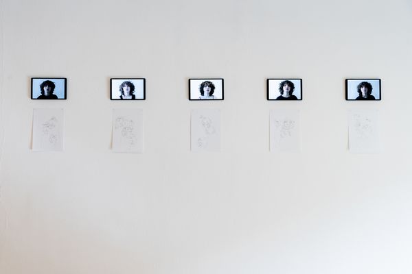 During especially intense episodes of derealization, the artist sat in front of a mirror, positioned a video camera in front of it, looked at herself, and drew what she observed. She thought: If I move and my reflection moves, then it must be me.