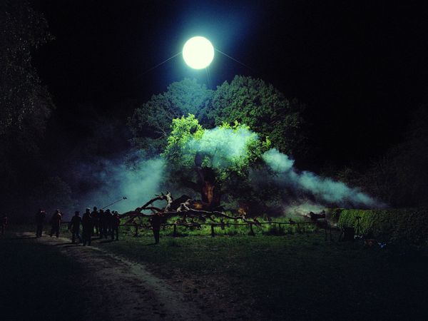 Another focus of the exhibition is the examination of history and ideologies. Rosefeldt frequently reflects on the traces of the Nazi era that extend into the present as well as the translation of political and social narratives. In the four-channel installation Meine Heimat ist ein düsteres, wolkenverhangenes Land (My Home Is a Dark and Cloud-Hung Land; 2011), he surveys the German concept of Heimat, meaning “home” or “homeland,” and challenges the ideological charge of landscape and national sentiment.