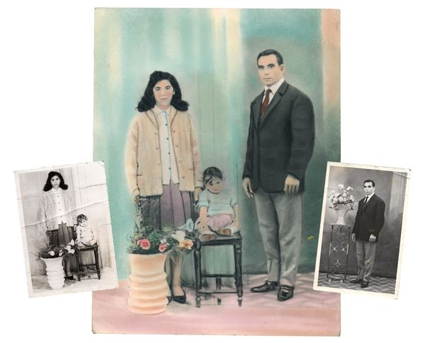 The photographs include official passport photos showing serious-looking individuals in formal dress as well as portraits of elegantly clad figures presenting themselves against backdrops with props such as flowers and ornamental screens. Finally, there are hand-painted photomontages creating family portraits of people separated by the Mediterranean. Some photographs had been abandoned following an unexpected departure following a long-awaited work contract marking the next stage of a journey. Despite their anonymity as a group, the collection reveals individuals and their unique stories, even though these can only be guessed. Most of the photographs bear neither names nor dates.