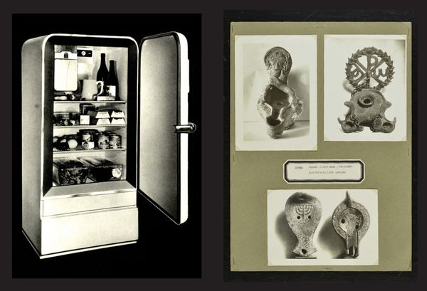 These compositions include reproductions from the Eranos Archive combined with materials drawn from Batia Suter’s own collection of images, particularly advertisements and printed matter related to industrially manufactured objects from the same period in which Fröbe-Kapteyn gathered her archetypal imagery. This collection of advertising prints, or images from scientific and engineering publications, comes from all over the world and has been assembled over many years by Batia Suter, a difficult process due to the fragility of these prints, which are often poorly preserved because they have no commercial value.