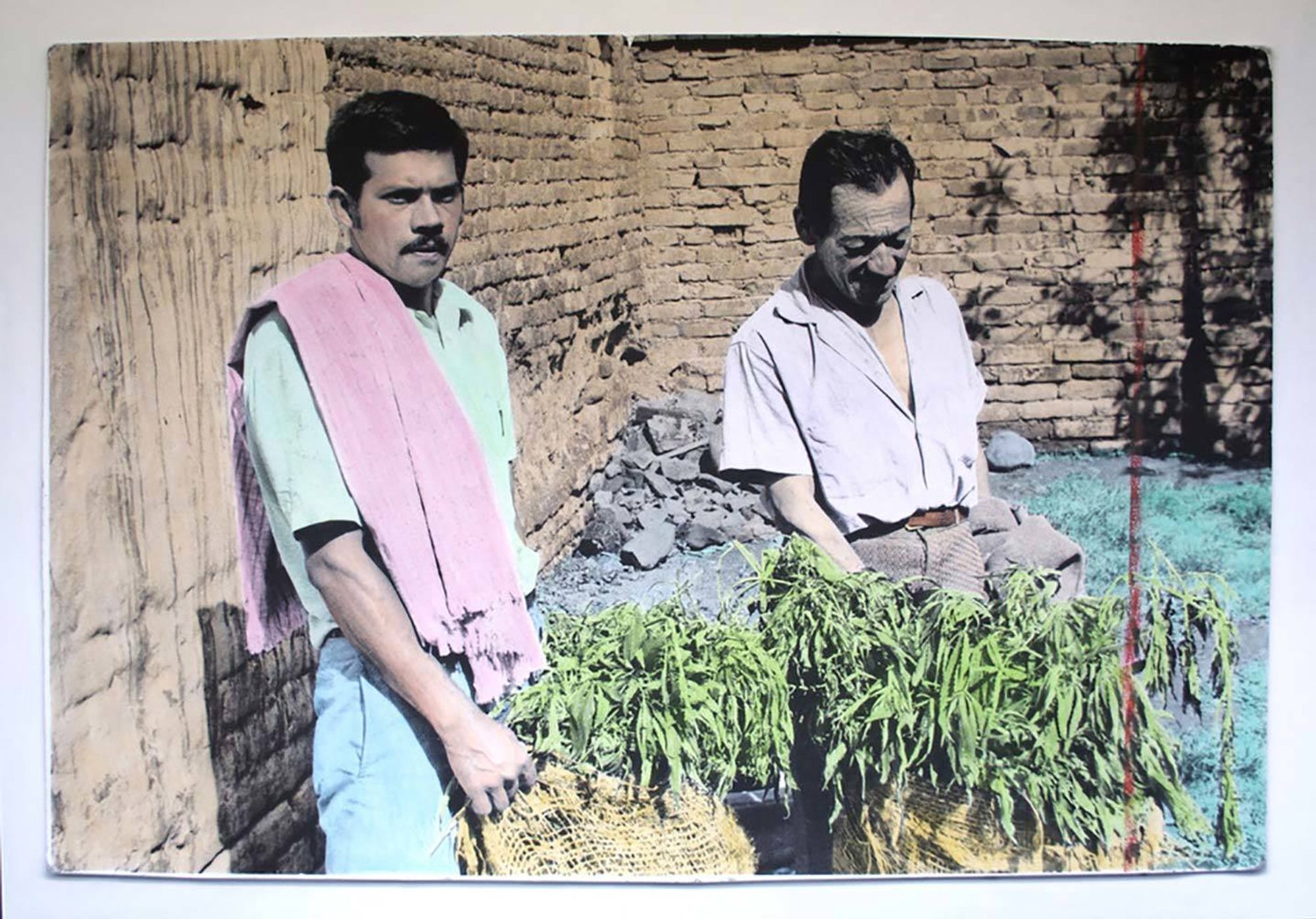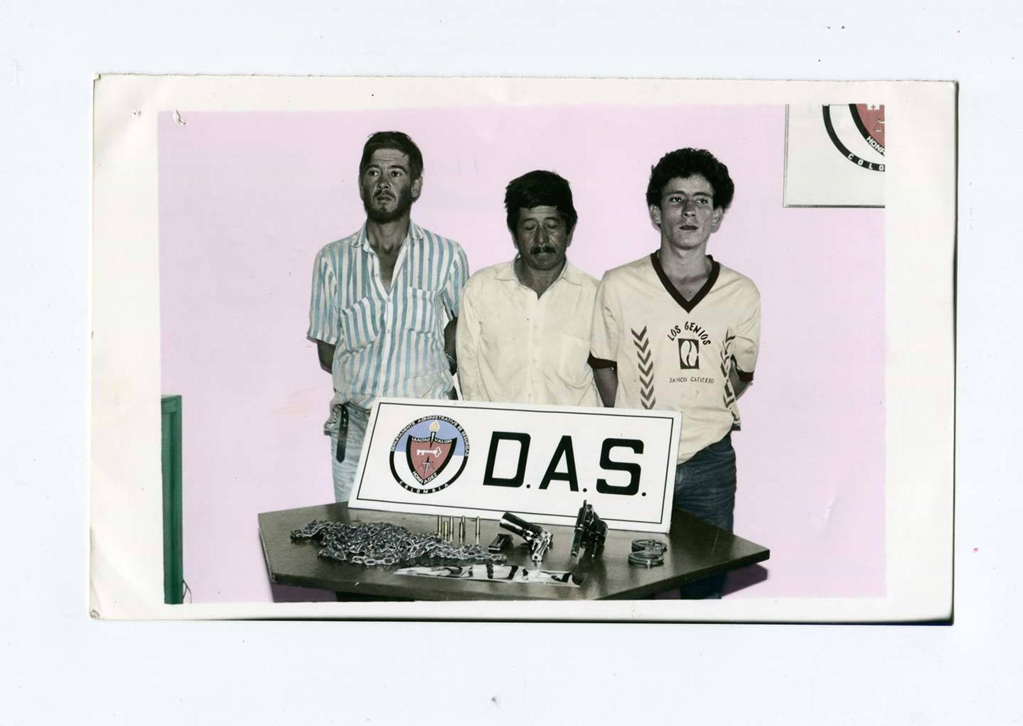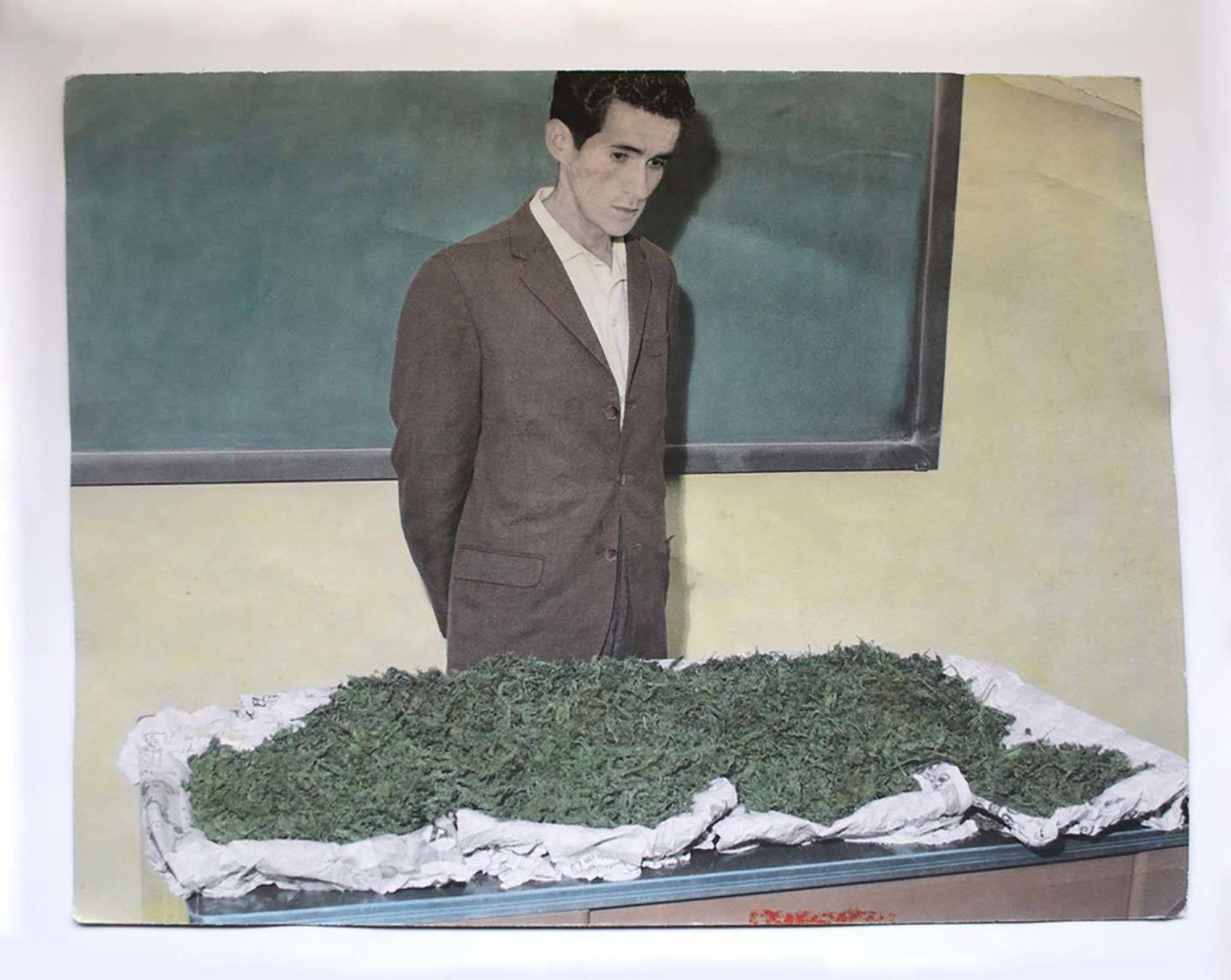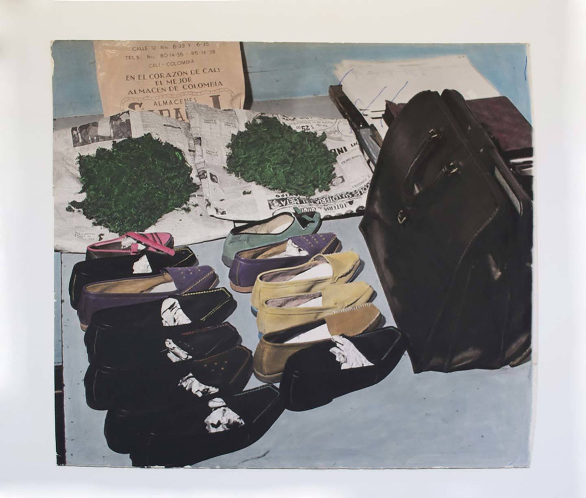 Orjuela managed to salvage a number of the old photographs. These images are replete with historical details originally produced not for their visual interest but as evidence. Curiously enough, in many cases, the inscriptions on the back of the photos do not seem to match the images on the front. In Coca Traffickers (2013), two men stand with bags stuffed with marijuana. On the label, an original typewritten inscription describes the haul of marijuana that was brought in, but this text is crossed out and in coloured pencil the words “traficantes de coca” (coca traffickers) are inscribed. Apparently the evidence needed to be altered to fit the accusation.