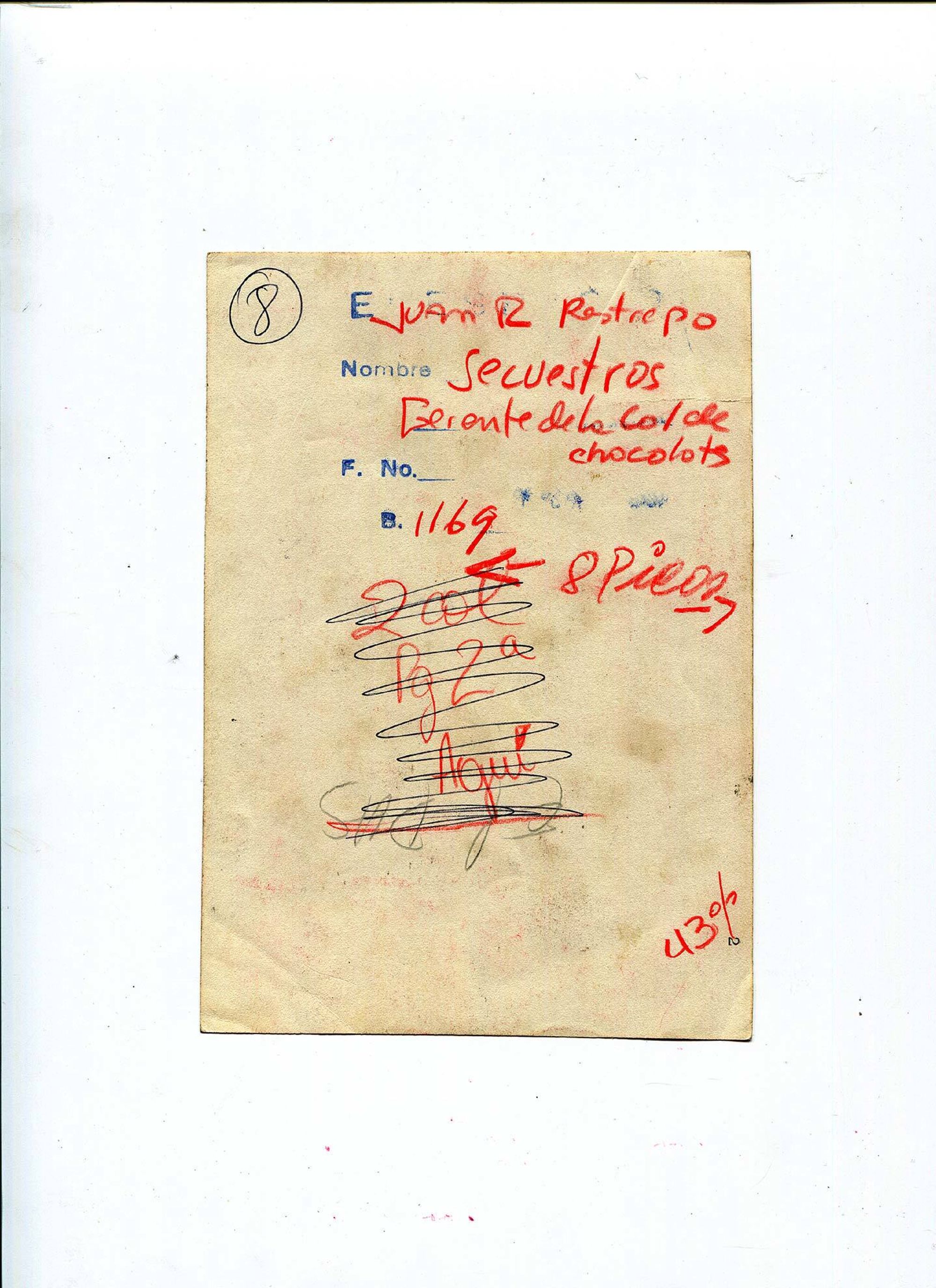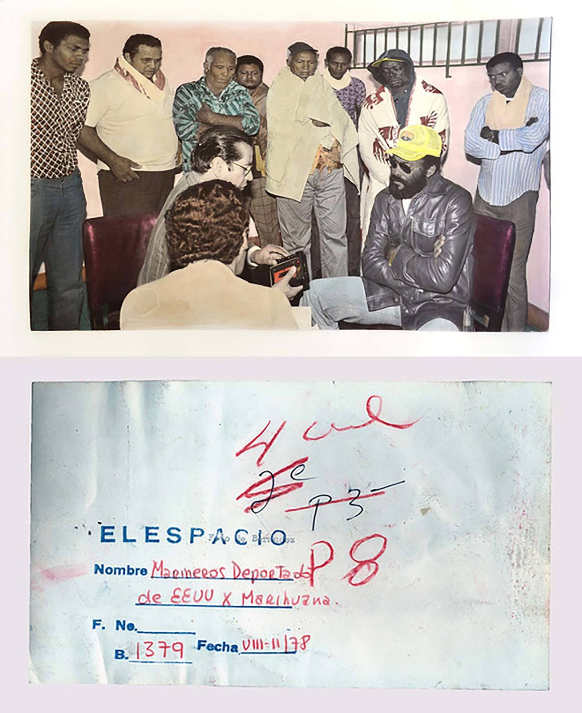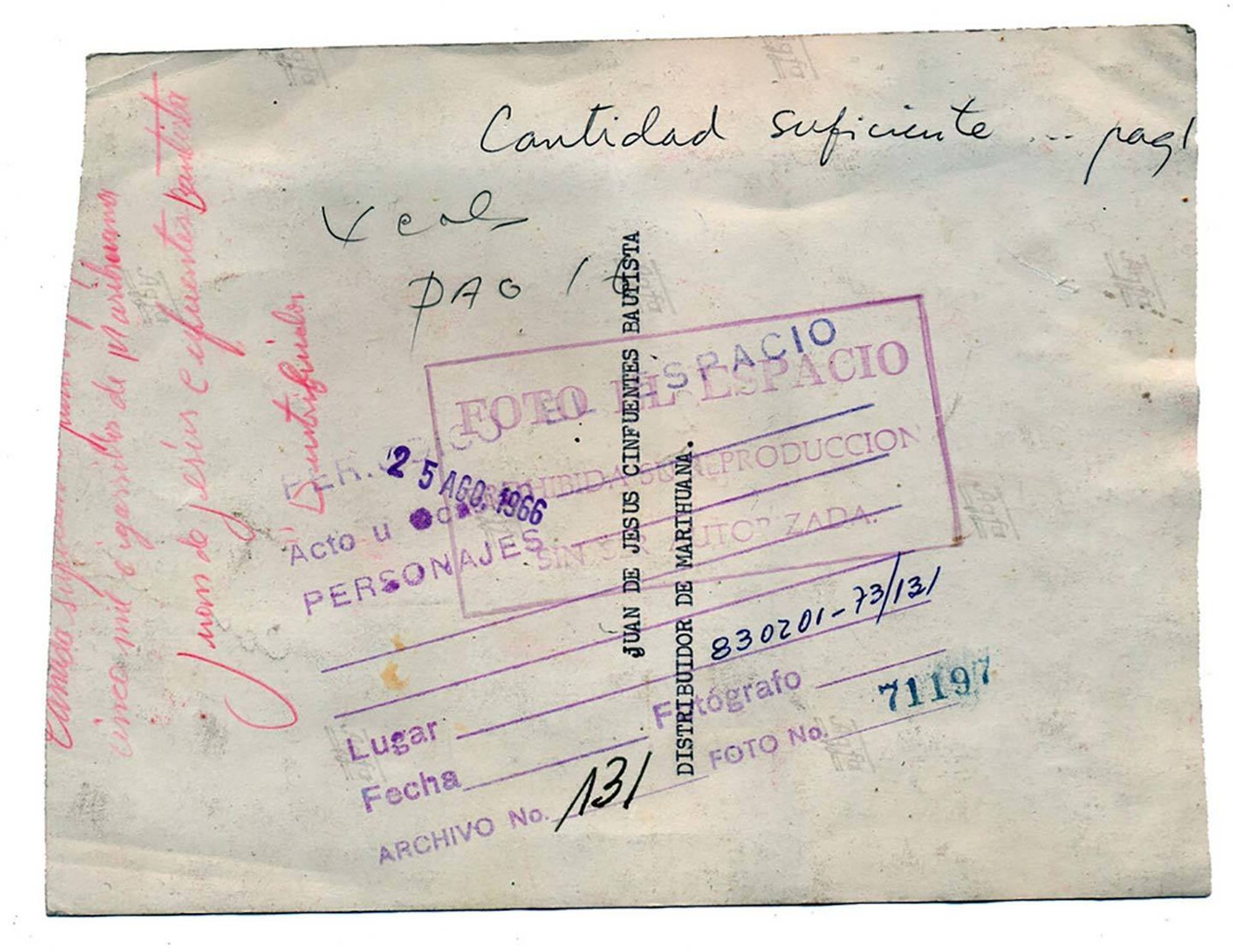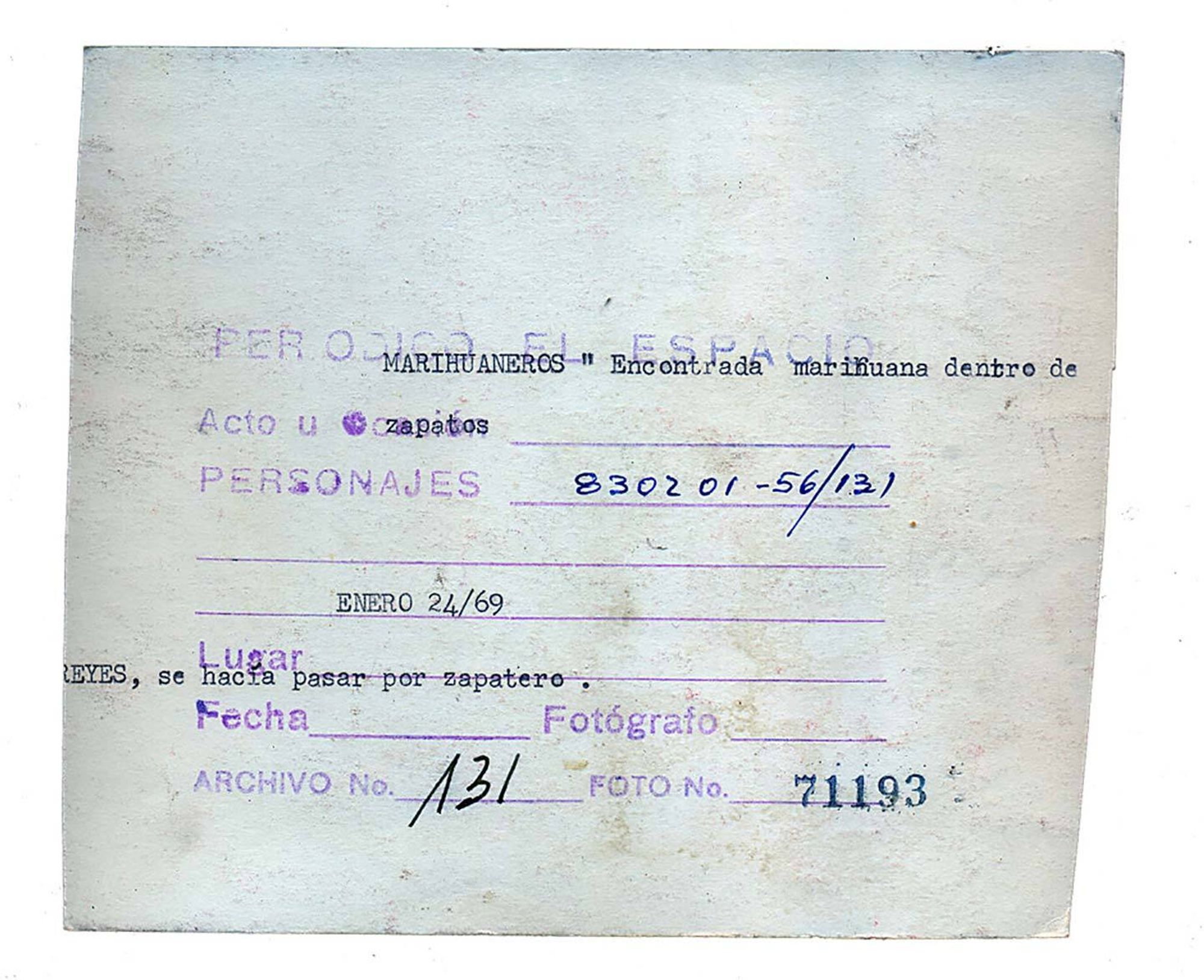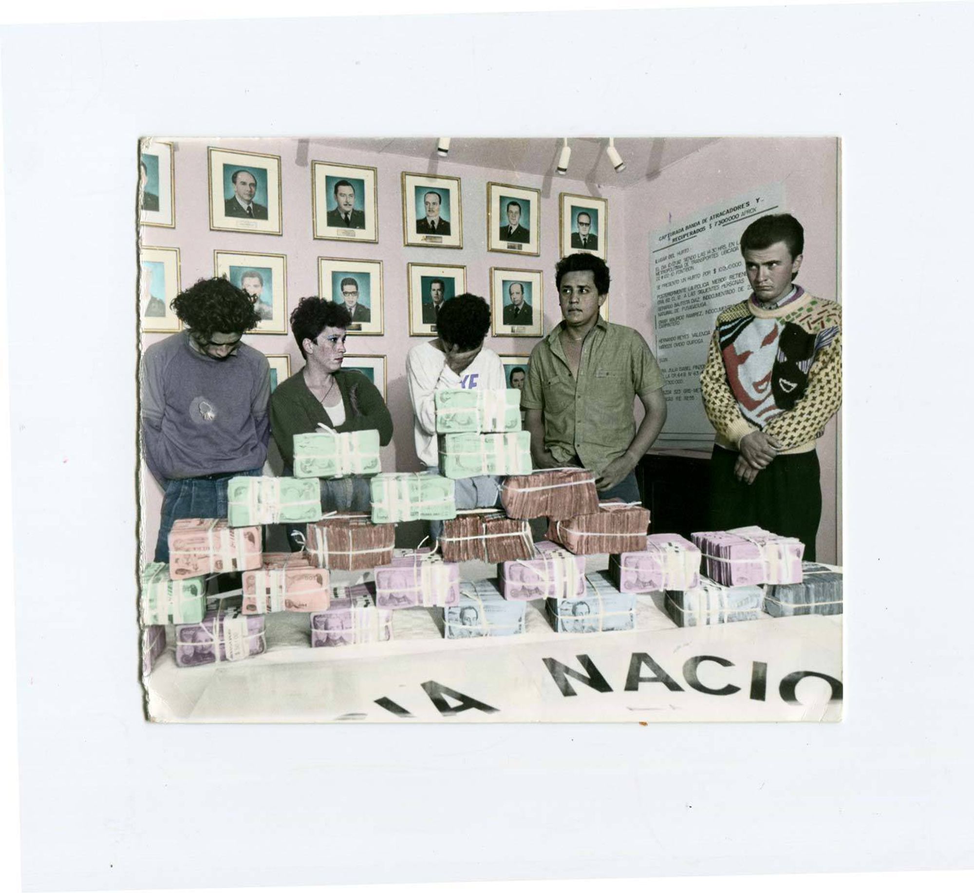 Orjuela managed to salvage a number of the old photographs. These images are replete with historical details originally produced not for their visual interest but as evidence. Curiously enough, in many cases, the inscriptions on the back of the photos do not seem to match the images on the front. In Coca Traffickers (2013), two men stand with bags stuffed with marijuana. On the label, an original typewritten inscription describes the haul of marijuana that was brought in, but this text is crossed out and in coloured pencil the words “traficantes de coca” (coca traffickers) are inscribed. Apparently the evidence needed to be altered to fit the accusation.