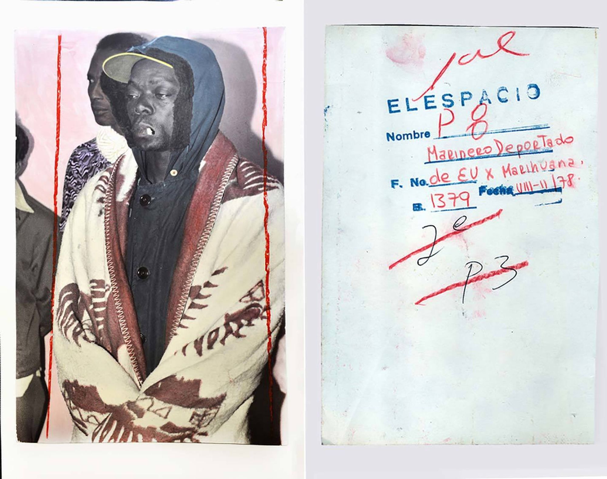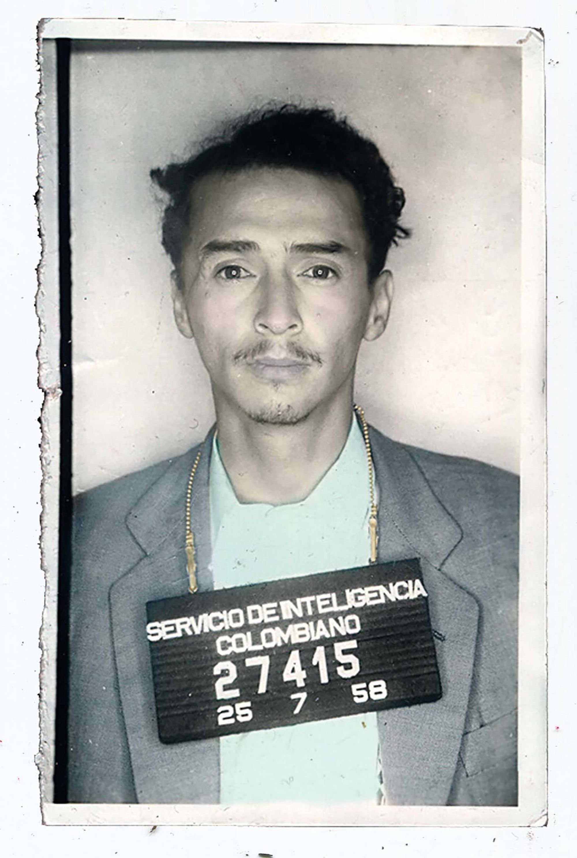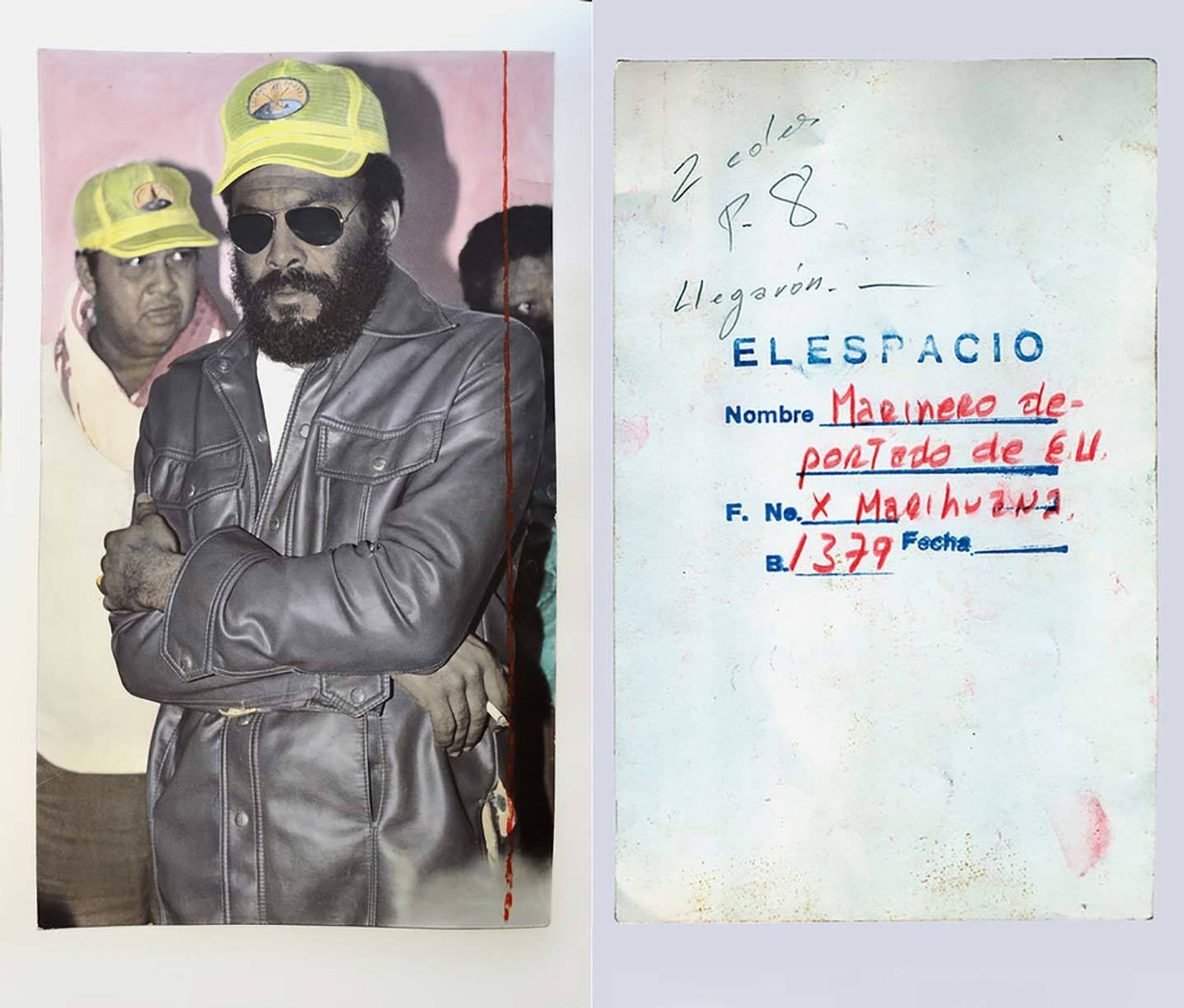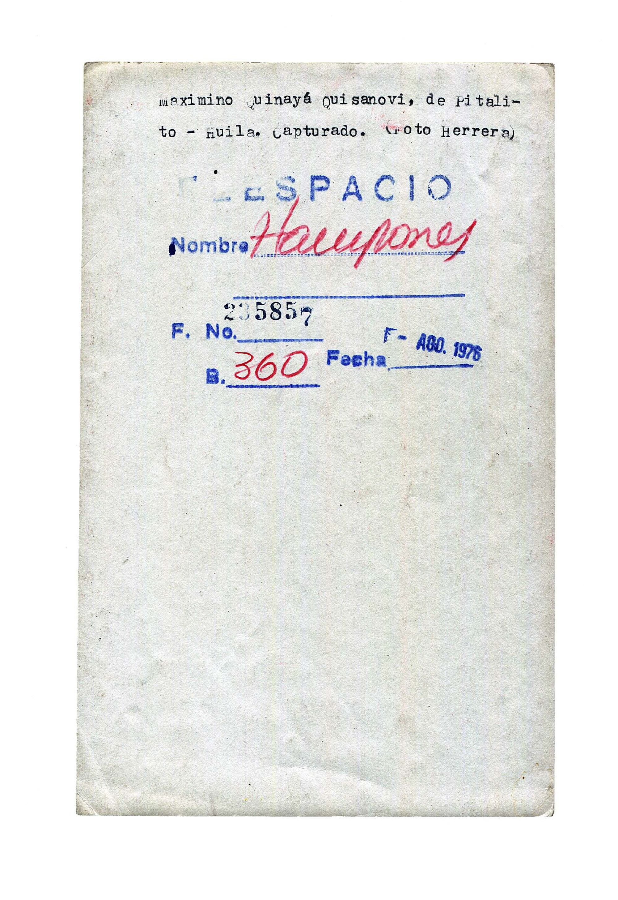 Orjuela managed to salvage a number of the old photographs. These images are replete with historical details originally produced not for their visual interest but as evidence. Curiously enough, in many cases, the inscriptions on the back of the photos do not seem to match the images on the front. In Coca Traffickers (2013), two men stand with bags stuffed with marijuana. On the label, an original typewritten inscription describes the haul of marijuana that was brought in, but this text is crossed out and in coloured pencil the words “traficantes de coca” (coca traffickers) are inscribed. Apparently the evidence needed to be altered to fit the accusation.