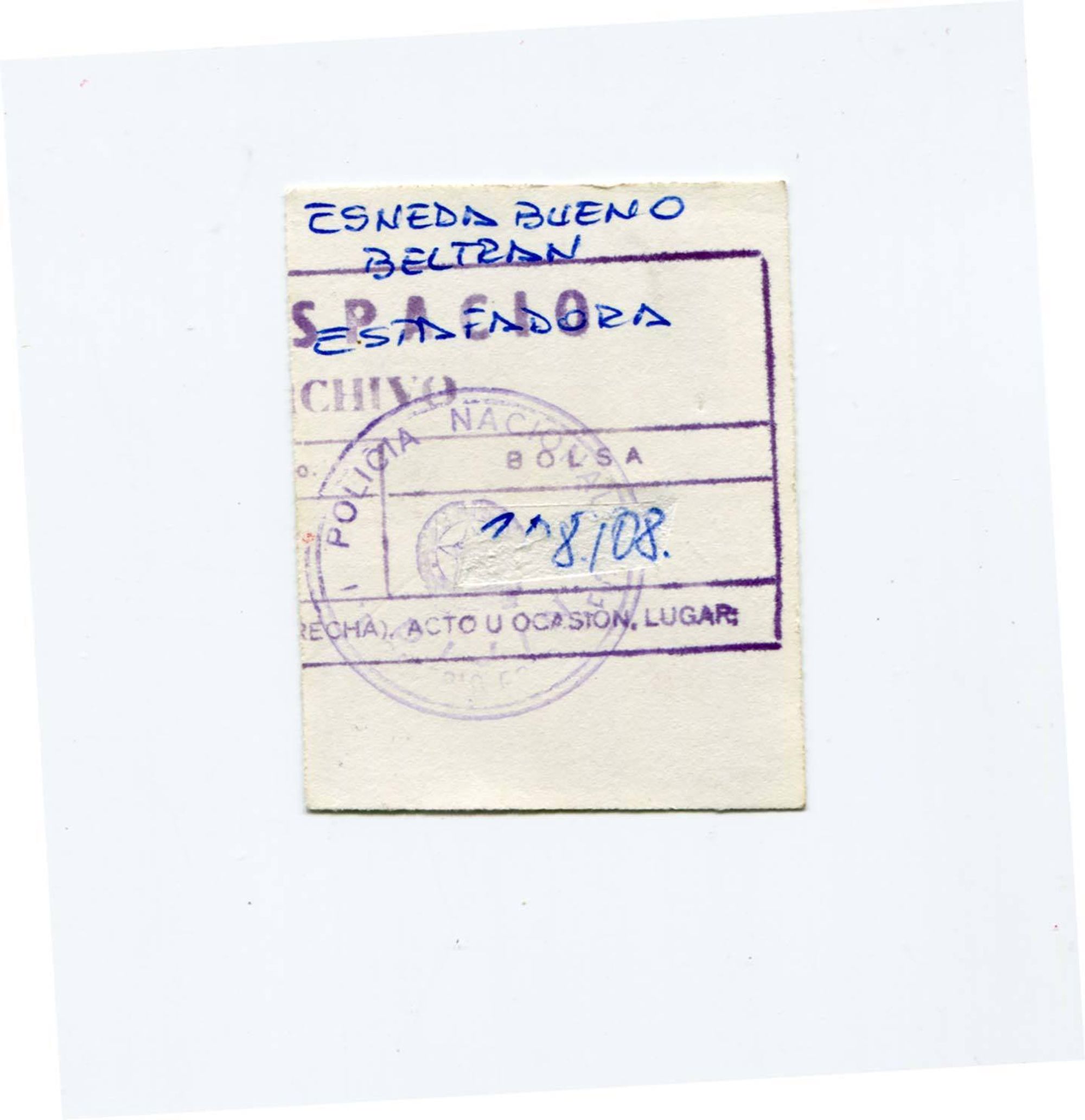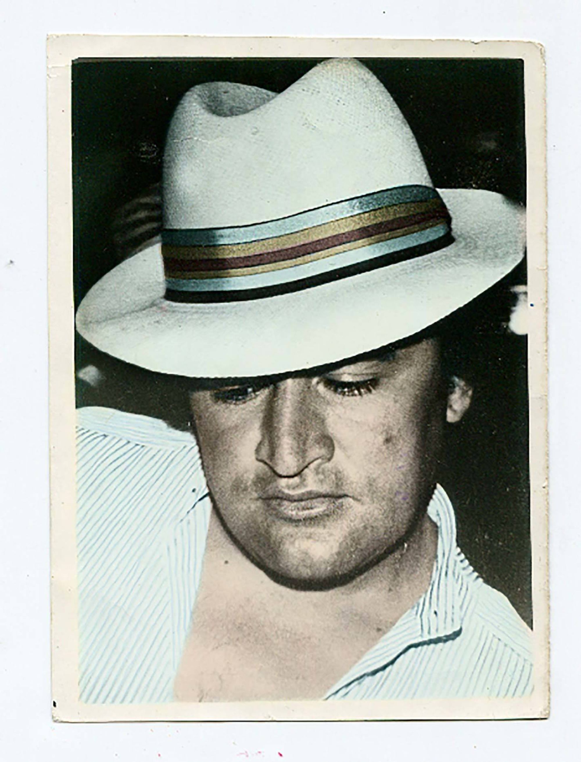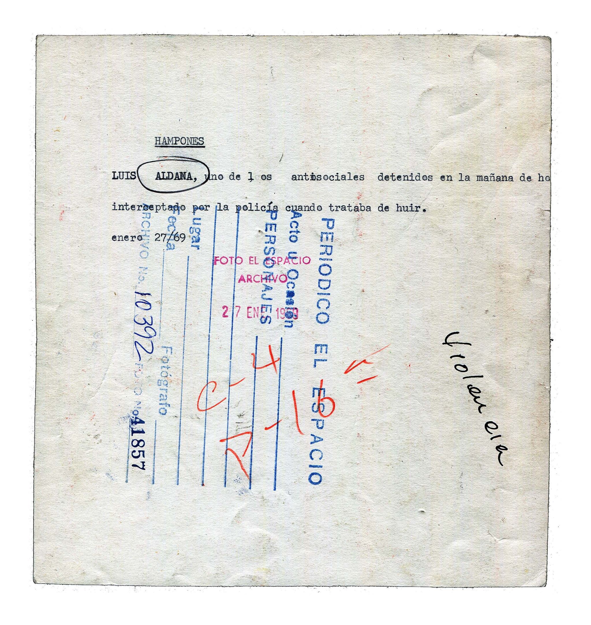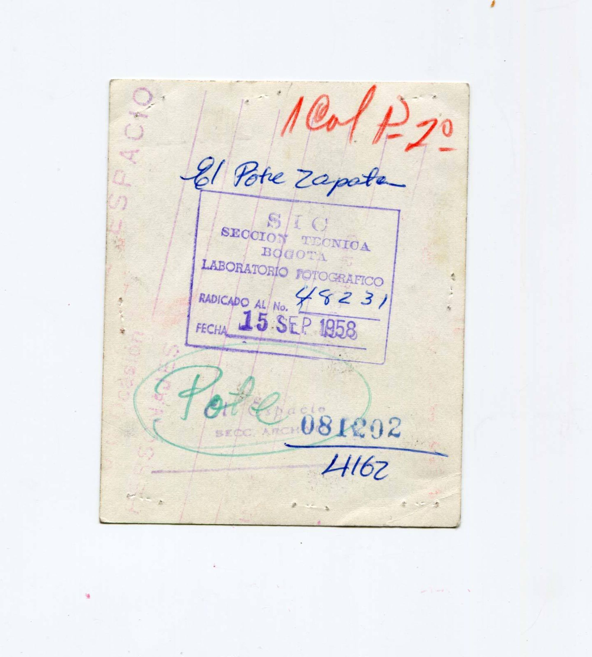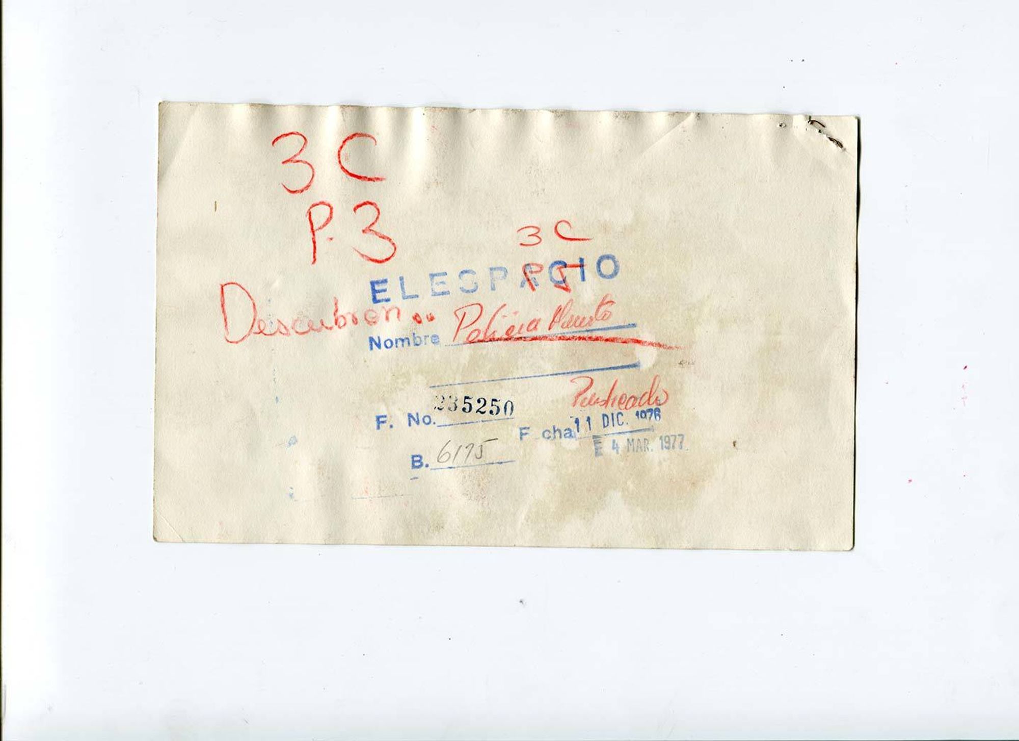 Orjuela managed to salvage a number of the old photographs. These images are replete with historical details originally produced not for their visual interest but as evidence. Curiously enough, in many cases, the inscriptions on the back of the photos do not seem to match the images on the front. In Coca Traffickers (2013), two men stand with bags stuffed with marijuana. On the label, an original typewritten inscription describes the haul of marijuana that was brought in, but this text is crossed out and in coloured pencil the words “traficantes de coca” (coca traffickers) are inscribed. Apparently the evidence needed to be altered to fit the accusation.