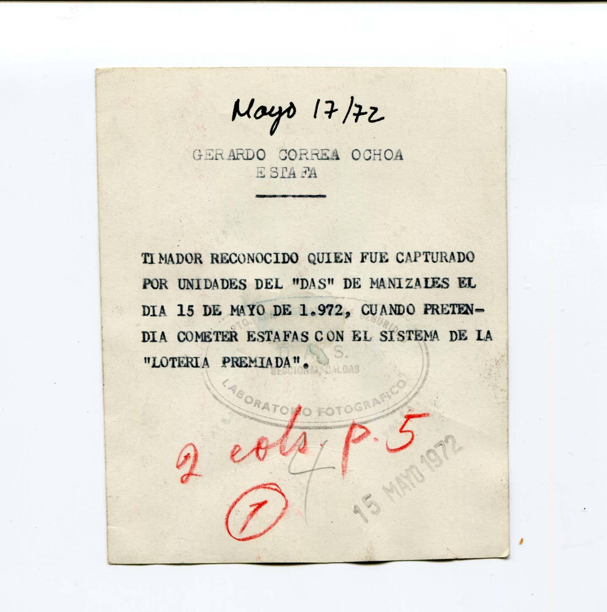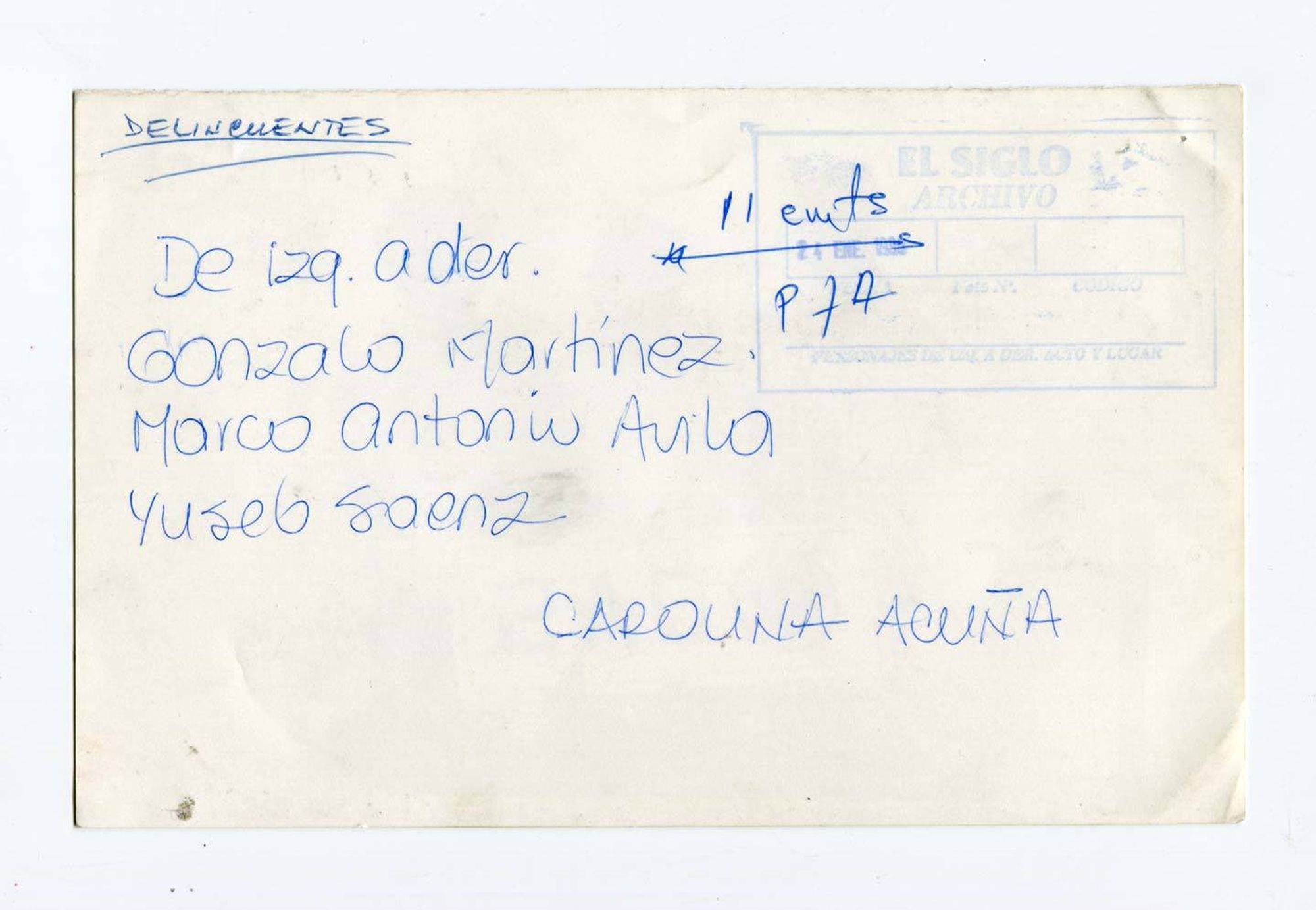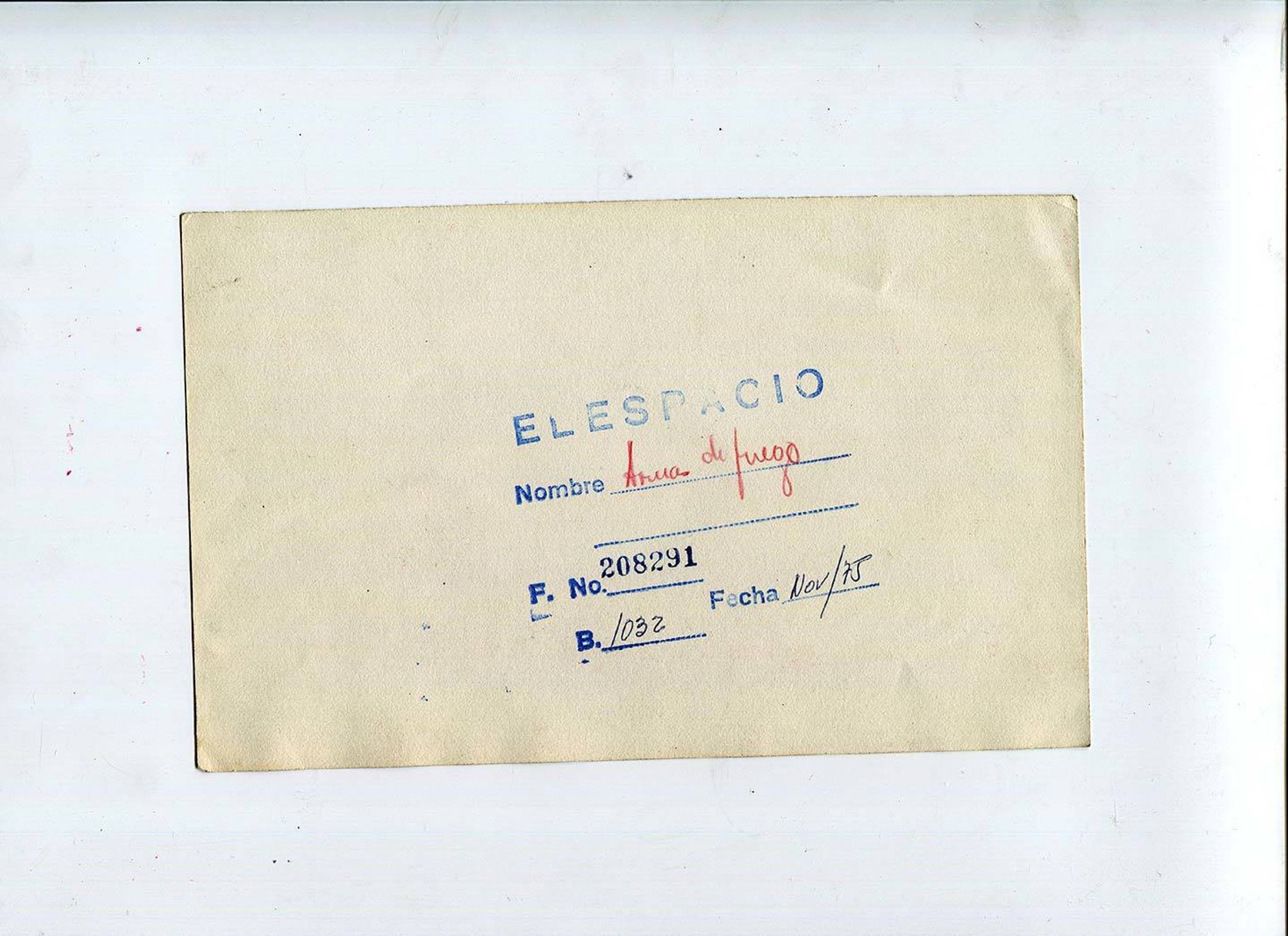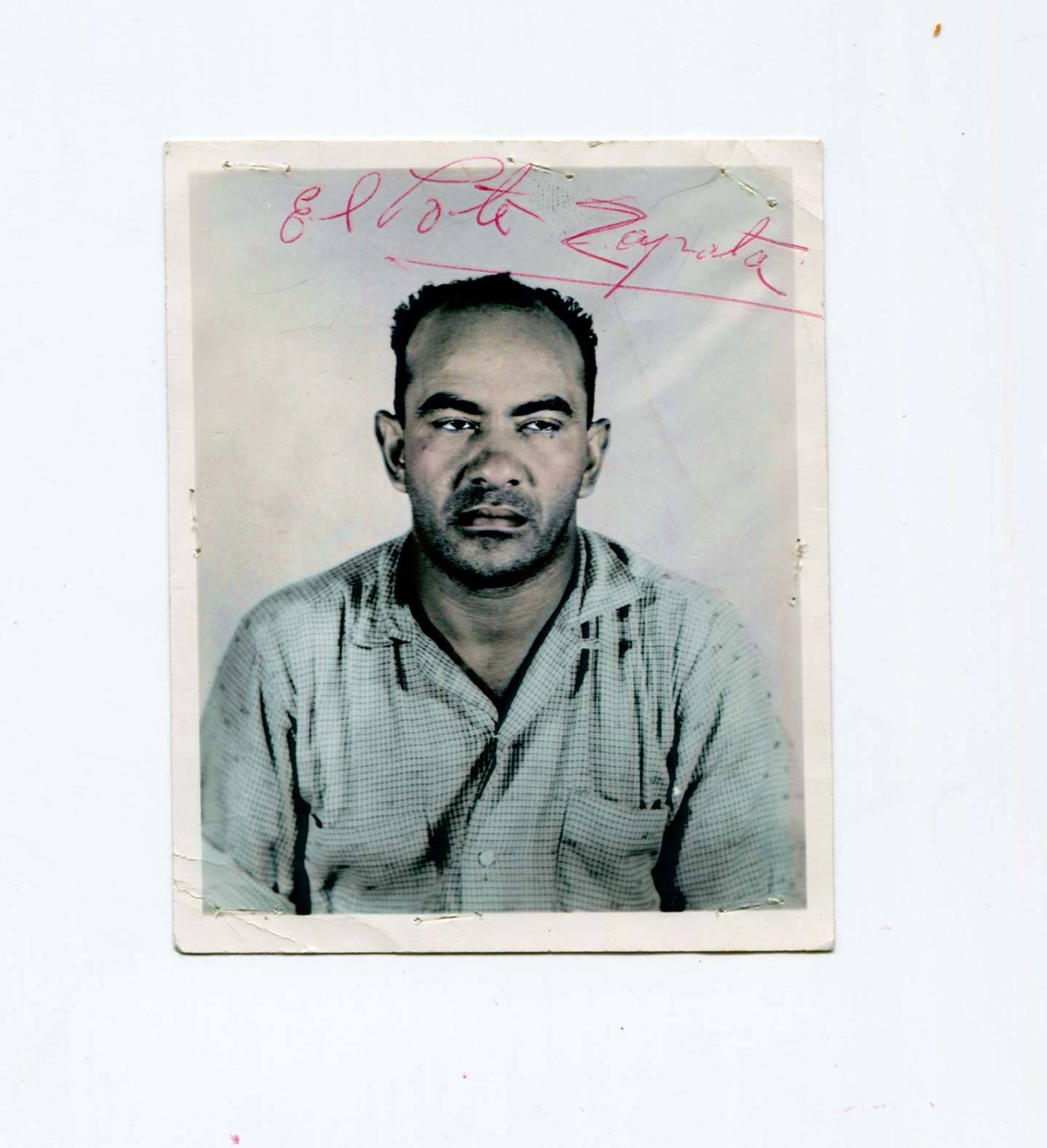 Orjuela managed to salvage a number of the old photographs. These images are replete with historical details originally produced not for their visual interest but as evidence. Curiously enough, in many cases, the inscriptions on the back of the photos do not seem to match the images on the front. In Coca Traffickers (2013), two men stand with bags stuffed with marijuana. On the label, an original typewritten inscription describes the haul of marijuana that was brought in, but this text is crossed out and in coloured pencil the words “traficantes de coca” (coca traffickers) are inscribed. Apparently the evidence needed to be altered to fit the accusation.