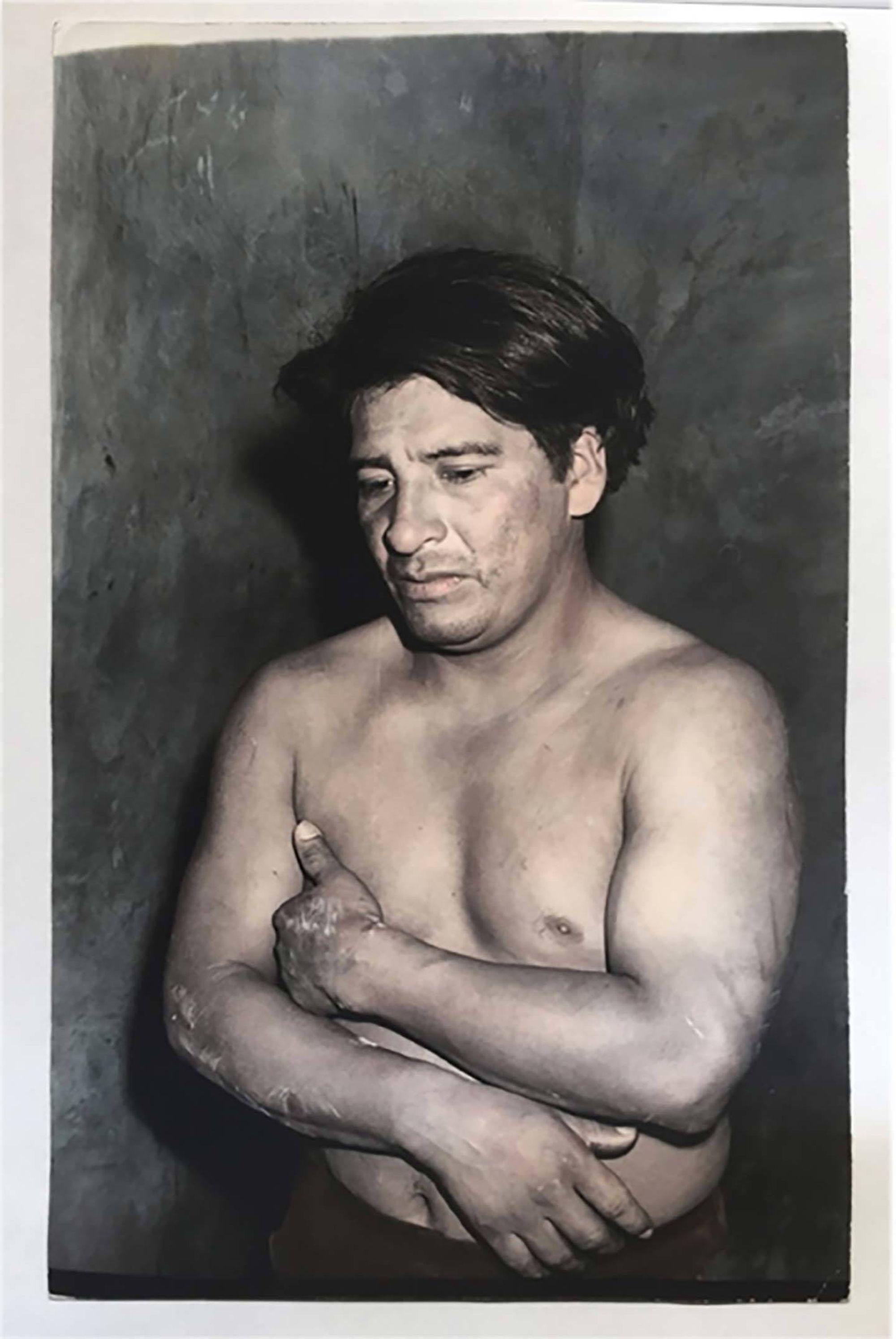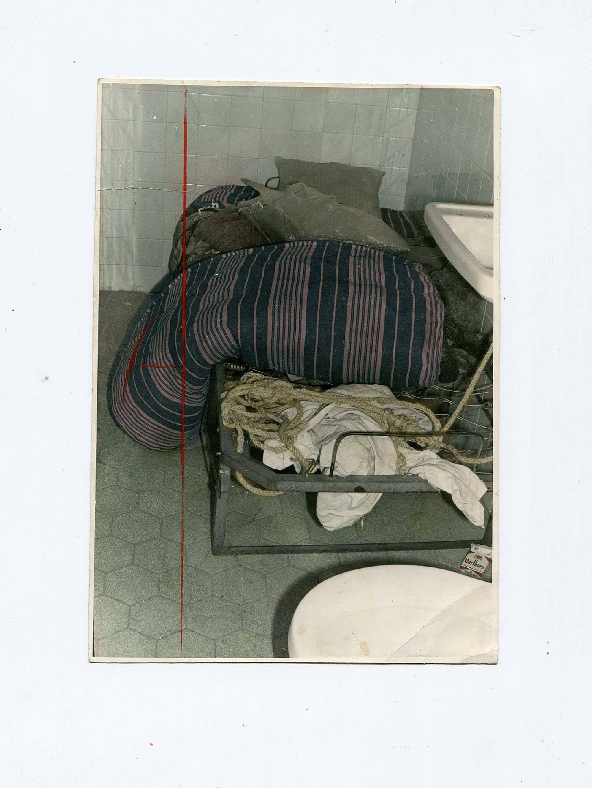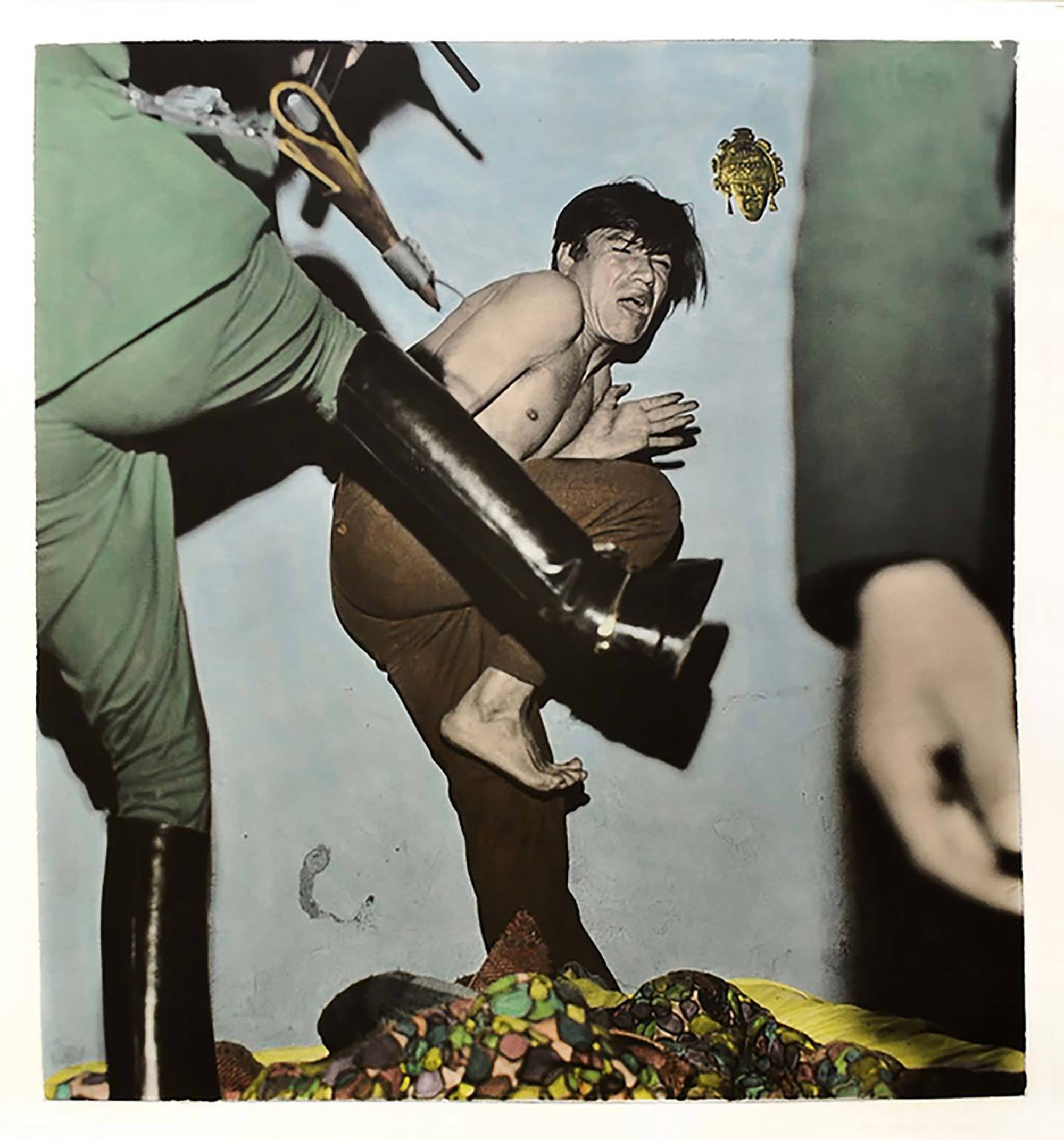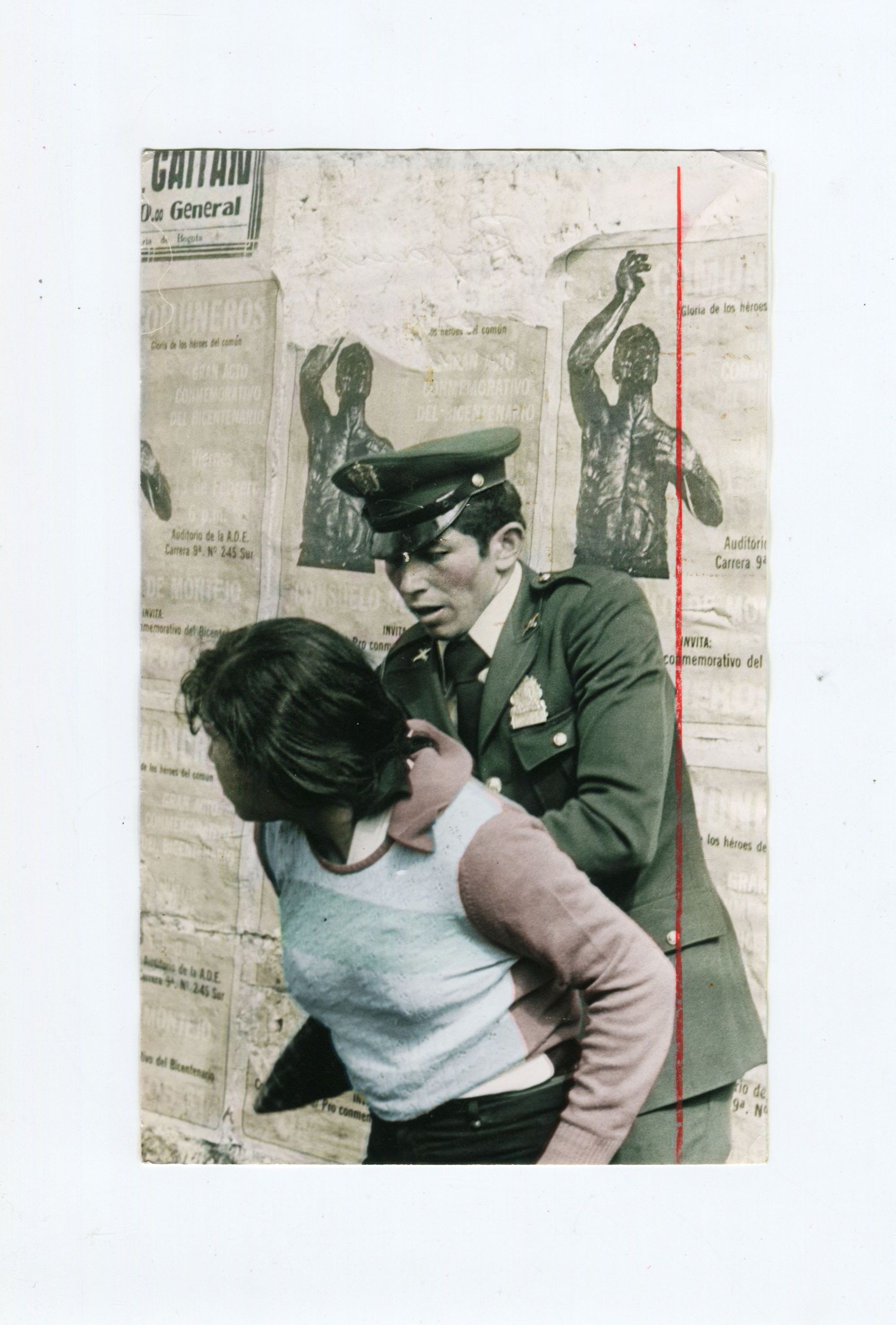 Orjuela uses a hand-colouring technique that gives the prints a nostalgic air despite their unpleasant subject matter. In another work - a photograph of a subject who was jailed for resisting arrest - the viewer sees a uniformed leg being raised against a man cowering in his underwear behind his bed. The image raises the issue of the militarisation of Colombia beginning in the 1960s, but the gap between the subject of the photograph, police brutality, and the colouring of the image produces a sense of discomfort. The image becomes almost theatrical like a Mise en scène.
