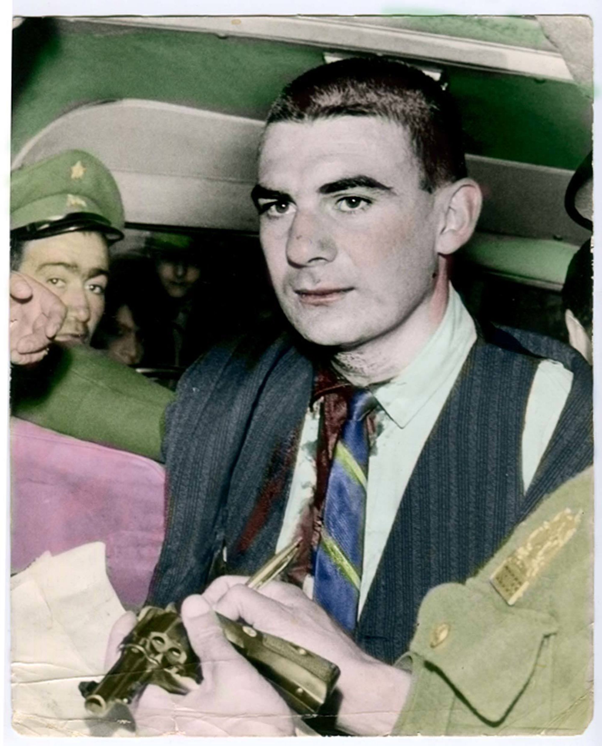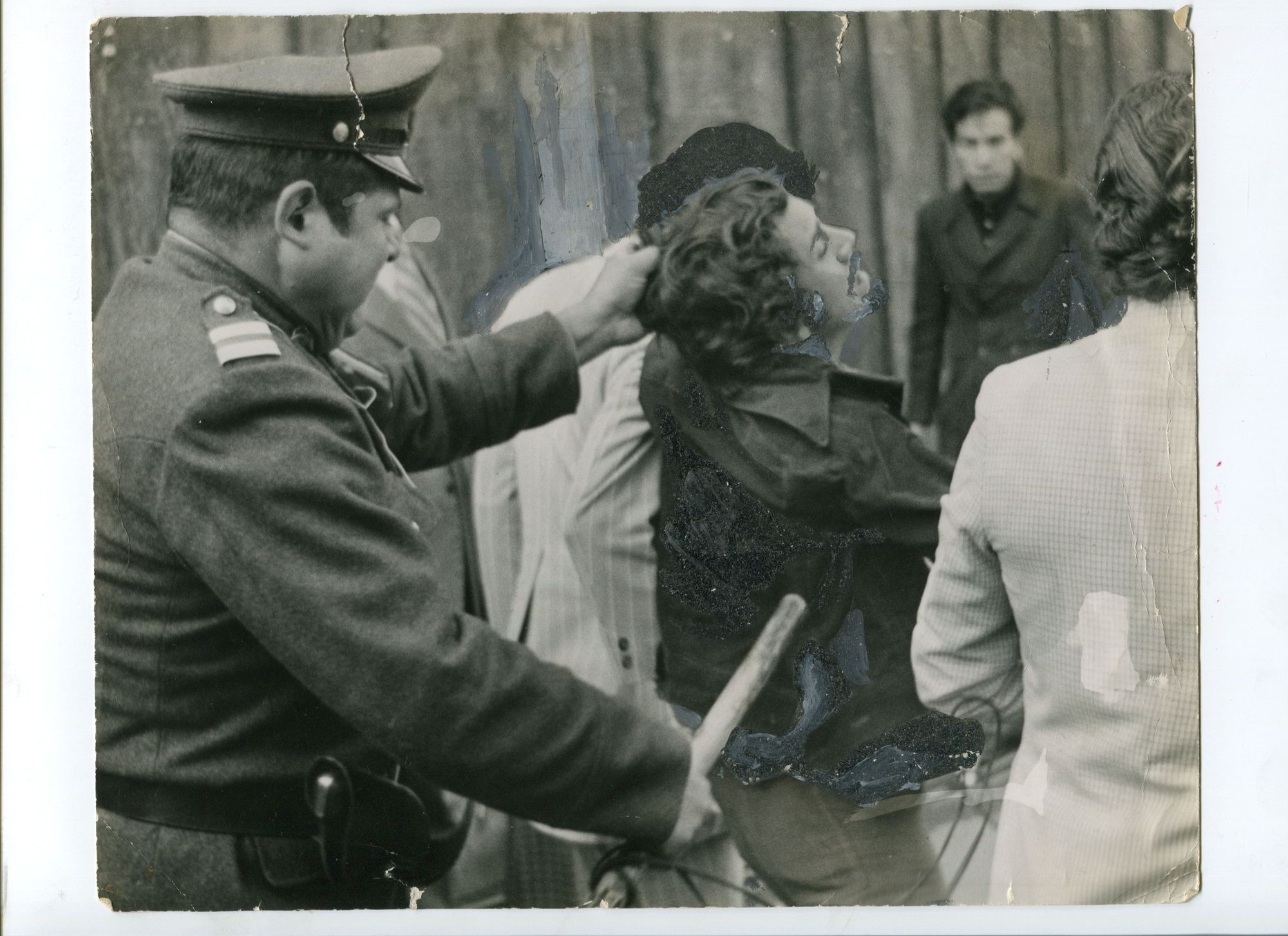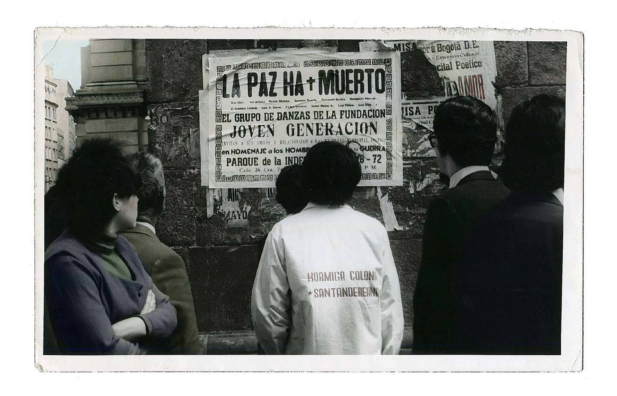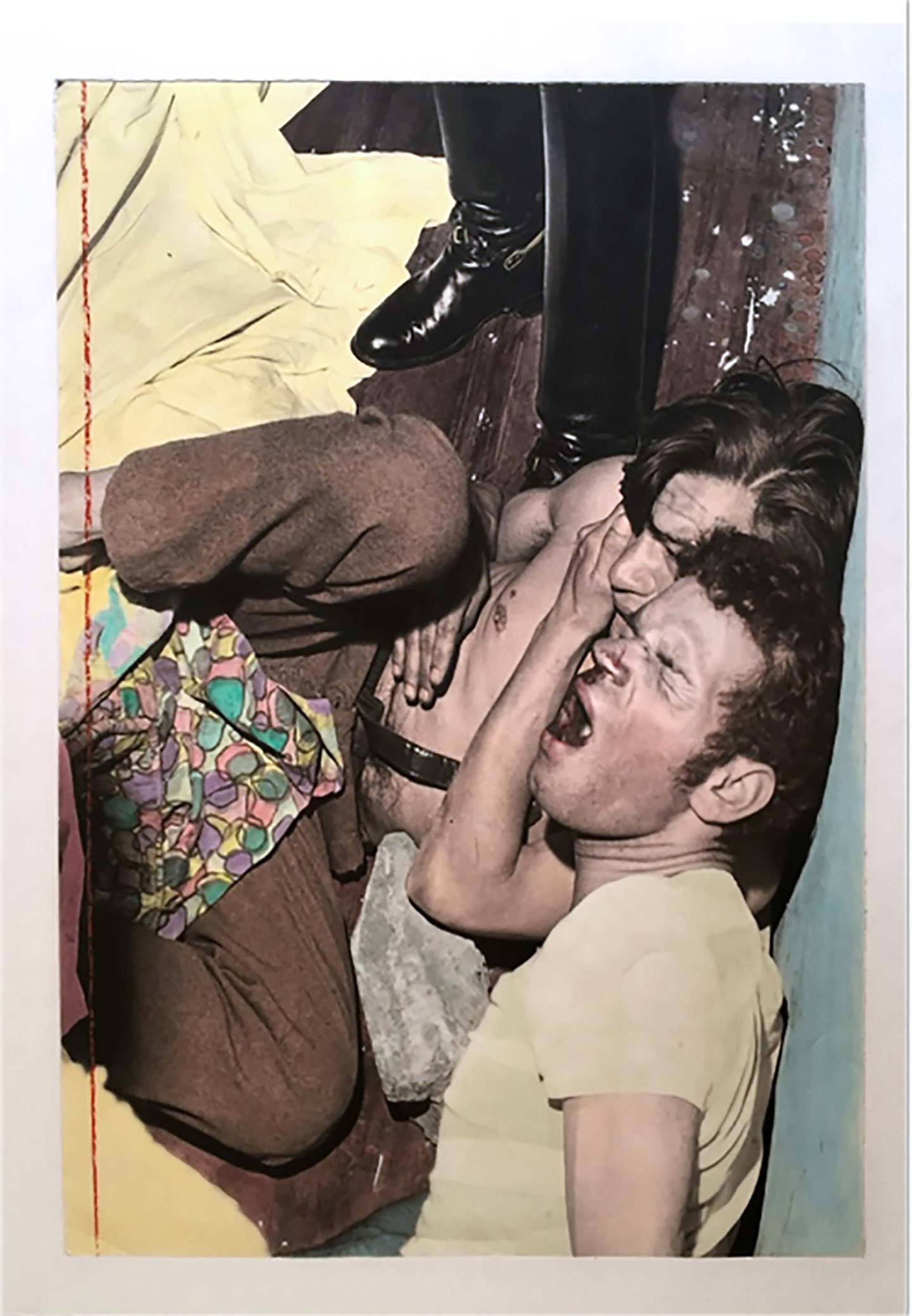 Orjuela uses a hand-colouring technique that gives the prints a nostalgic air despite their unpleasant subject matter. In another work - a photograph of a subject who was jailed for resisting arrest - the viewer sees a uniformed leg being raised against a man cowering in his underwear behind his bed. The image raises the issue of the militarisation of Colombia beginning in the 1960s, but the gap between the subject of the photograph, police brutality, and the colouring of the image produces a sense of discomfort. The image becomes almost theatrical like a Mise en scène.