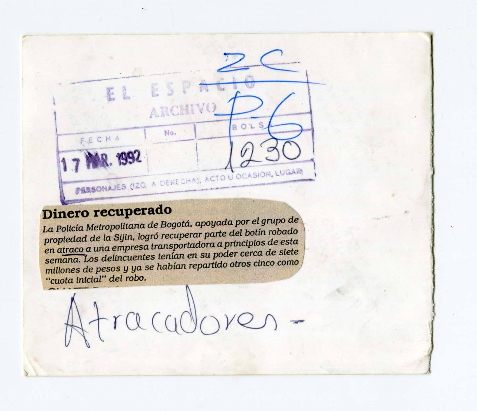 Orjuela's artwork is about the memory and the rescue of historical documents. In Archivo Muerto he looks at the archive of the most famous tabloid newspaper in Bogota, Colombia when it entered bankruptcy and closed its doors, leaving on the street 50 years of photographic history.
