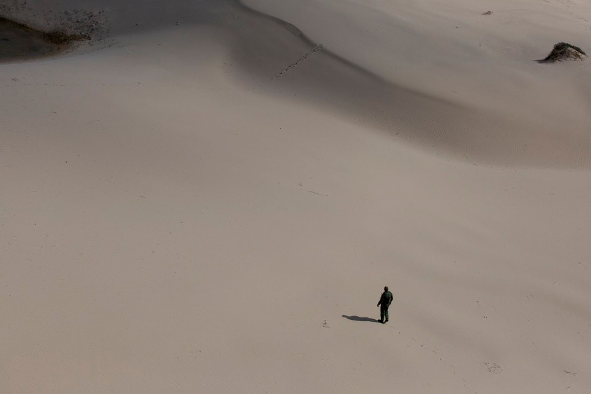 A Border Patrol agents pursues a group of migrants through sand dunes outside of Kingsville, Texas.