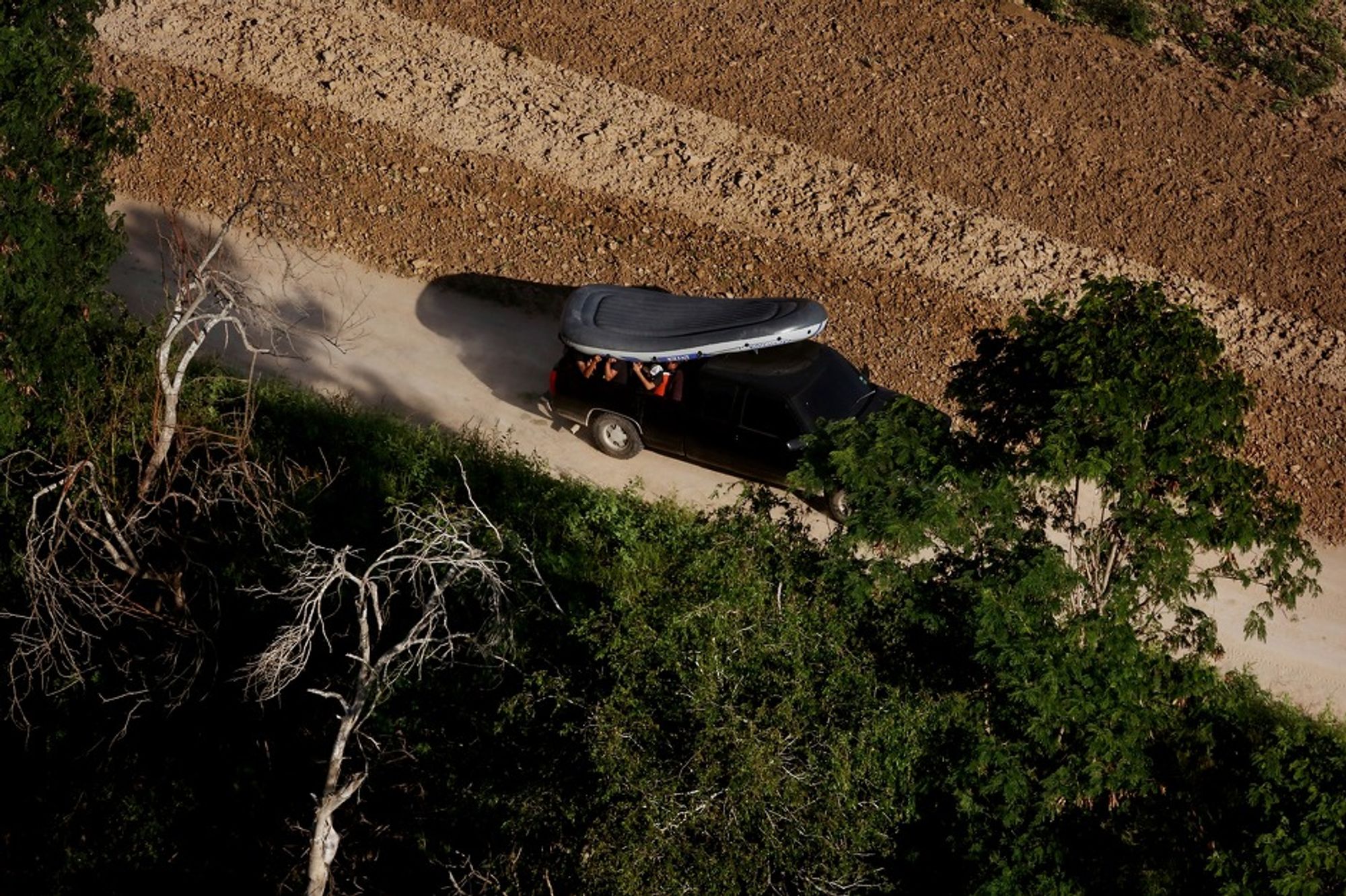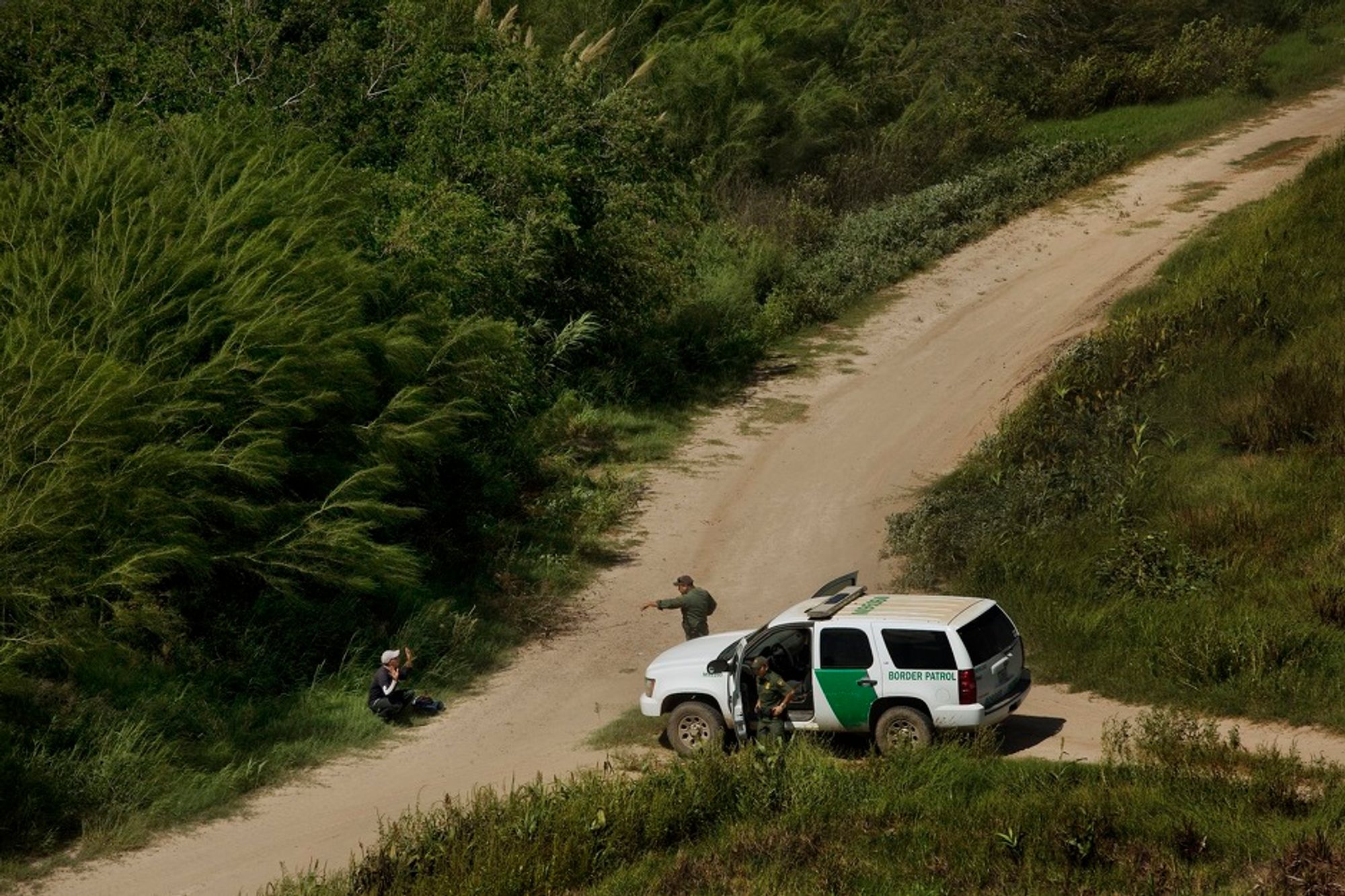 Border Patrol agents search for the driver of a vehicle bailout in La Joya, Texas. When a vehicle carrying drugs or migrants is stopped by police, the occupants often flee and the agents must search for them by tracking their footprints. Migrants have died from the heat in these situations.