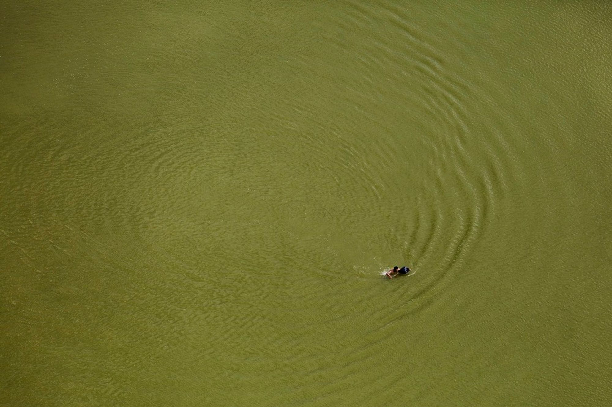 A solitary smuggler calmly swims back to Mexico with his clothing in a garbage bag. Once smugglers or migrants enter the Rio Grande river, they are out of the jurisdiction of the Border Patrol and savvy smugglers take advantage of this.