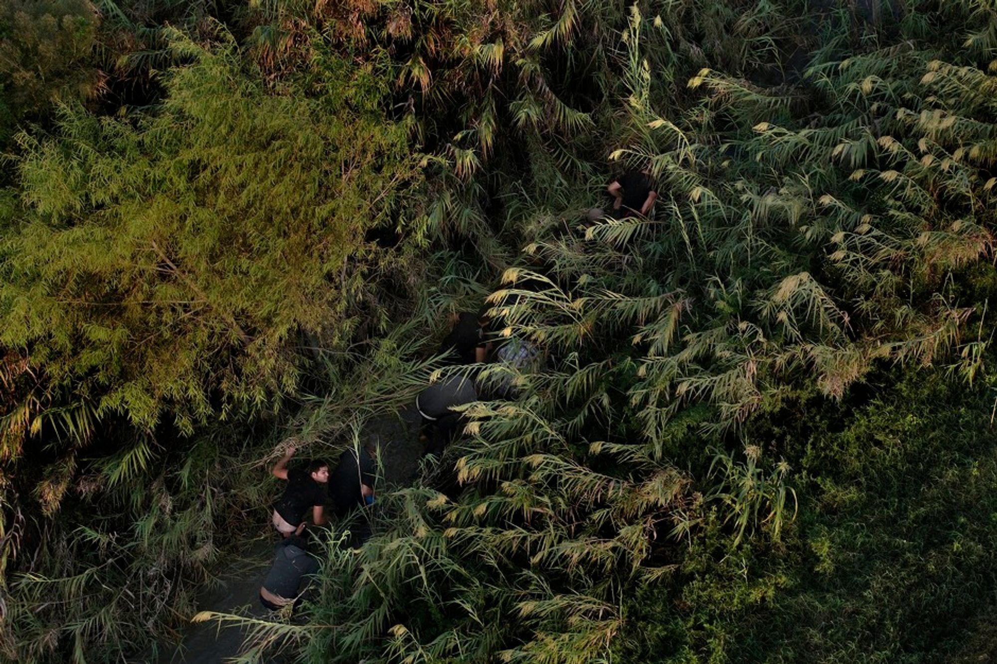 Twenty-two suspected migrants turn back to Miguel Aleman, Mexico after being pursued by agents on the riverbank south of Roma, Texas. These people are called "turnbacks." Border Patrol and other American law enforcement cannot pursue migrants or smugglers back into Mexico.