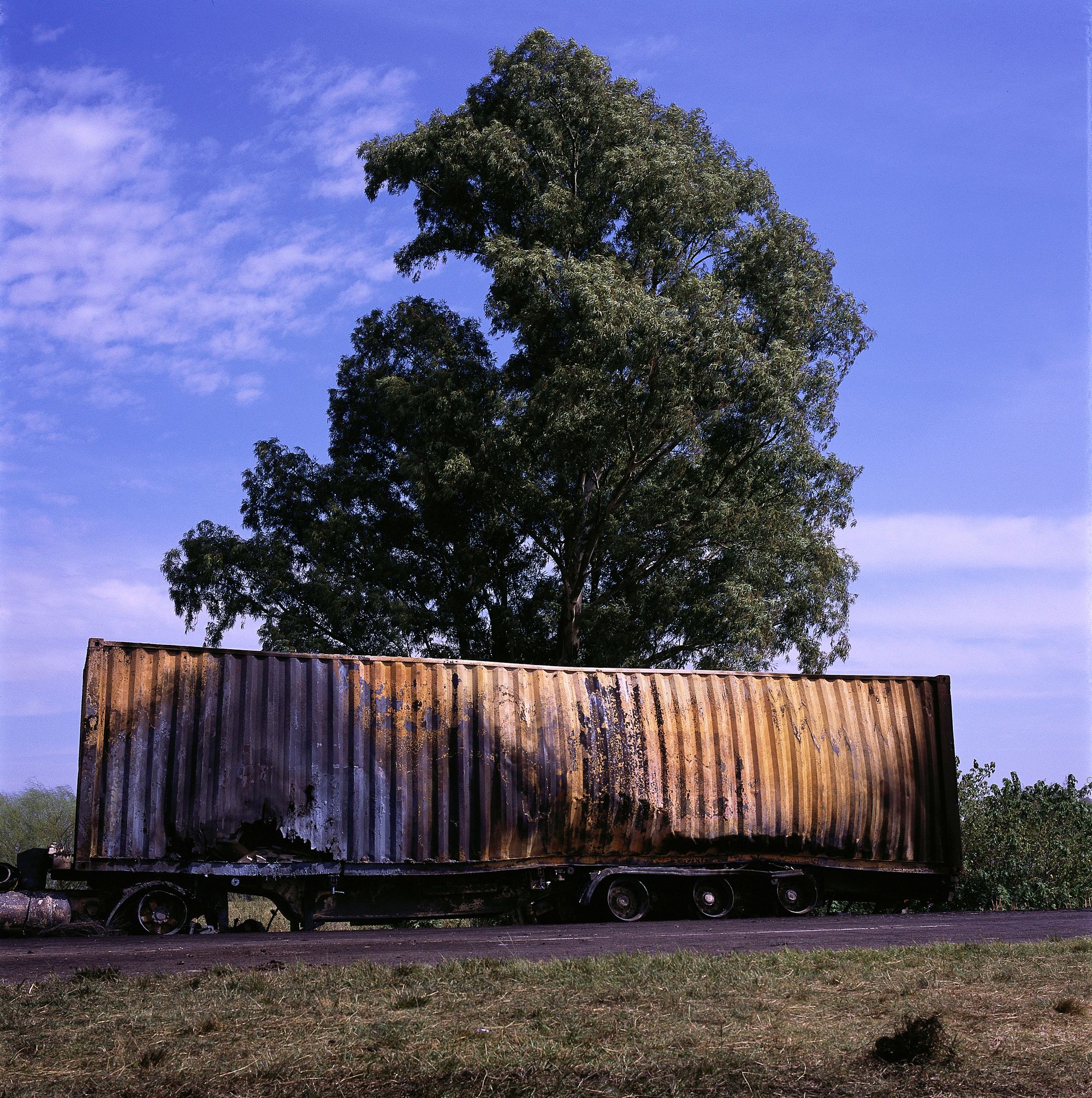 Levy allows his gaze to be seduced by lines and planes, sudden cuts and segmentations, low-angle shots of those enormous trucks that succumb to the gravity of their load, or simply to a momentary distraction. These huge incongruous piles of iron remain in place, whether standing, upturned or sideways, brightly coloured or stained by rust, under skies either of a clear, impassive blue or crisscrossed by clouds like a hyperrealist painting. Fire also persists here, though controlled, still finding something to consume inside the rusted shell of a truck.
