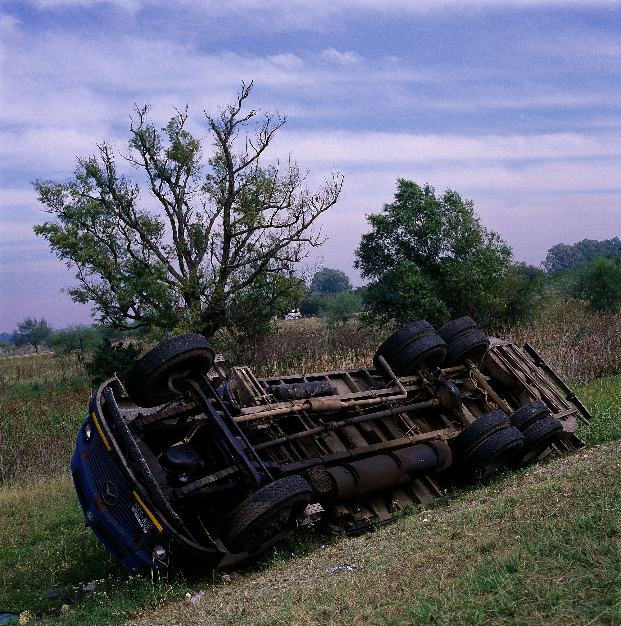 The author of Choques (Collisions) leaves us alone, completely alone, before the picture of an object that, de facto and by contagion, becomes twice as solitary and silent. Subsequent to the uncontrolled beating of the heart and the unstoppable gush of blood, there lies the lifeless, imperturbable heap of twisted metal. Levy shows us the world literally upside-down, reality subverted. A disorder imbues the precarious order of things. Though his photographs are usually long shots, Diego Levy is also fond of fragments or details of the disaster: the creases resulting from the compression of the steel body of an upturned truck, a windshield smashed into a cobweb-like design. Or else, he represents the whole by its parts: a ripped-out seat left by the roadside, a rearview mirror abandoned in a vacant lot.