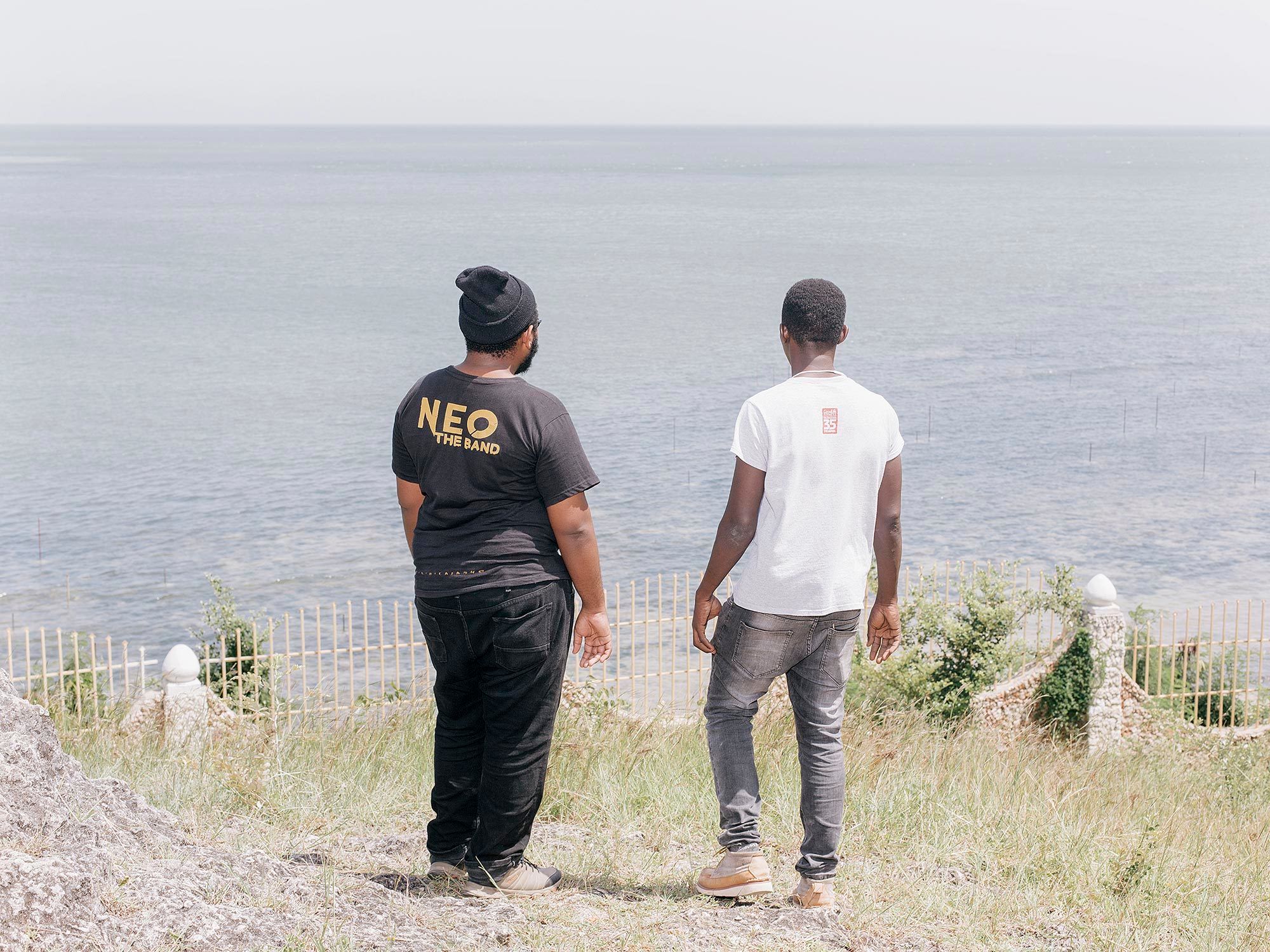 Two software engineers look at the spot where the submarine fiberoptic cable reaches the mainland in Mombasa