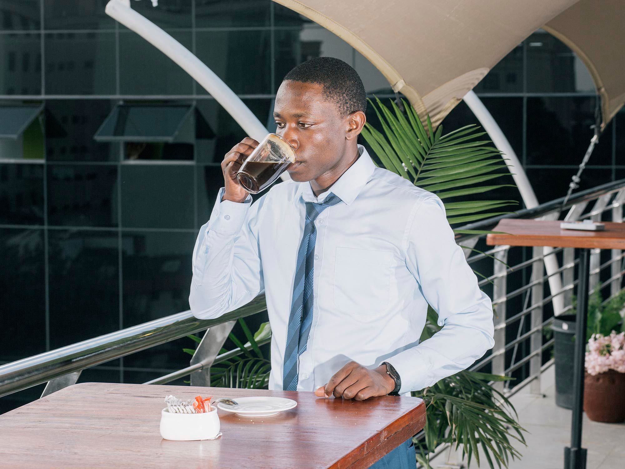 Web developer Kevin Barasa having his lunch break. The arrival of the submarine cable has established an increasing coffee culture in the Kenyan middle class