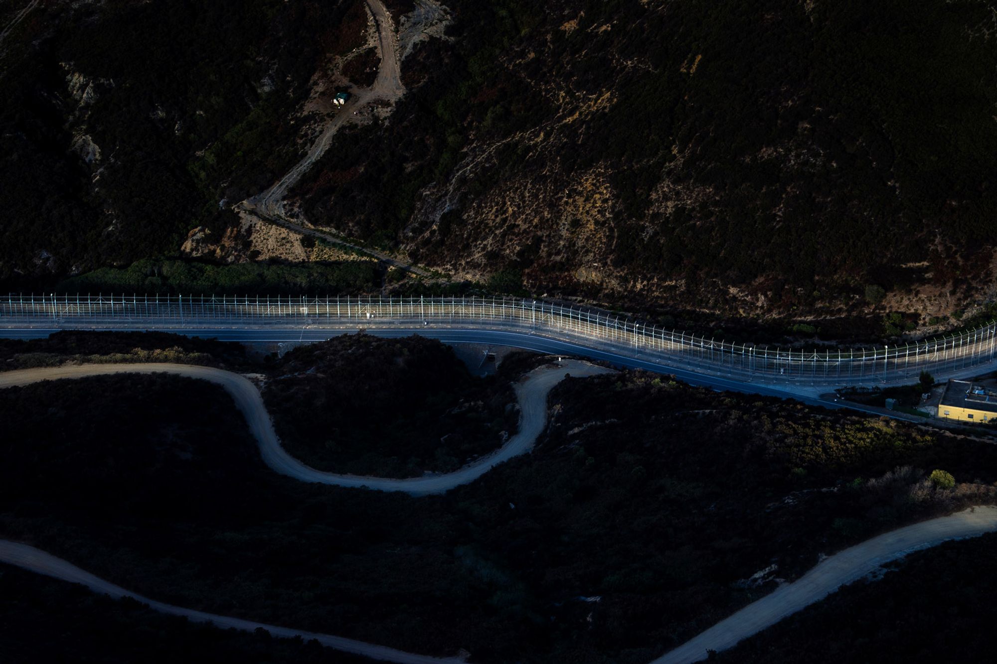 The borderfence in Ceuta, Spain early morning 7. September 2016. The fence is a 6 meterhigh parallel fence towards Morocco keeping sub-Saharan migrants and refugees out. Thefence has barbed wire, watchposts, sound sensors, motion sensors, lights, cameras,patrolling guards on foot, in cars, in the hills, at sea in boats. It was first built in 1993, raisedheight in 1995 and again in 2005 to what it is today. Its is the ground zero of EuropeanBorder control.