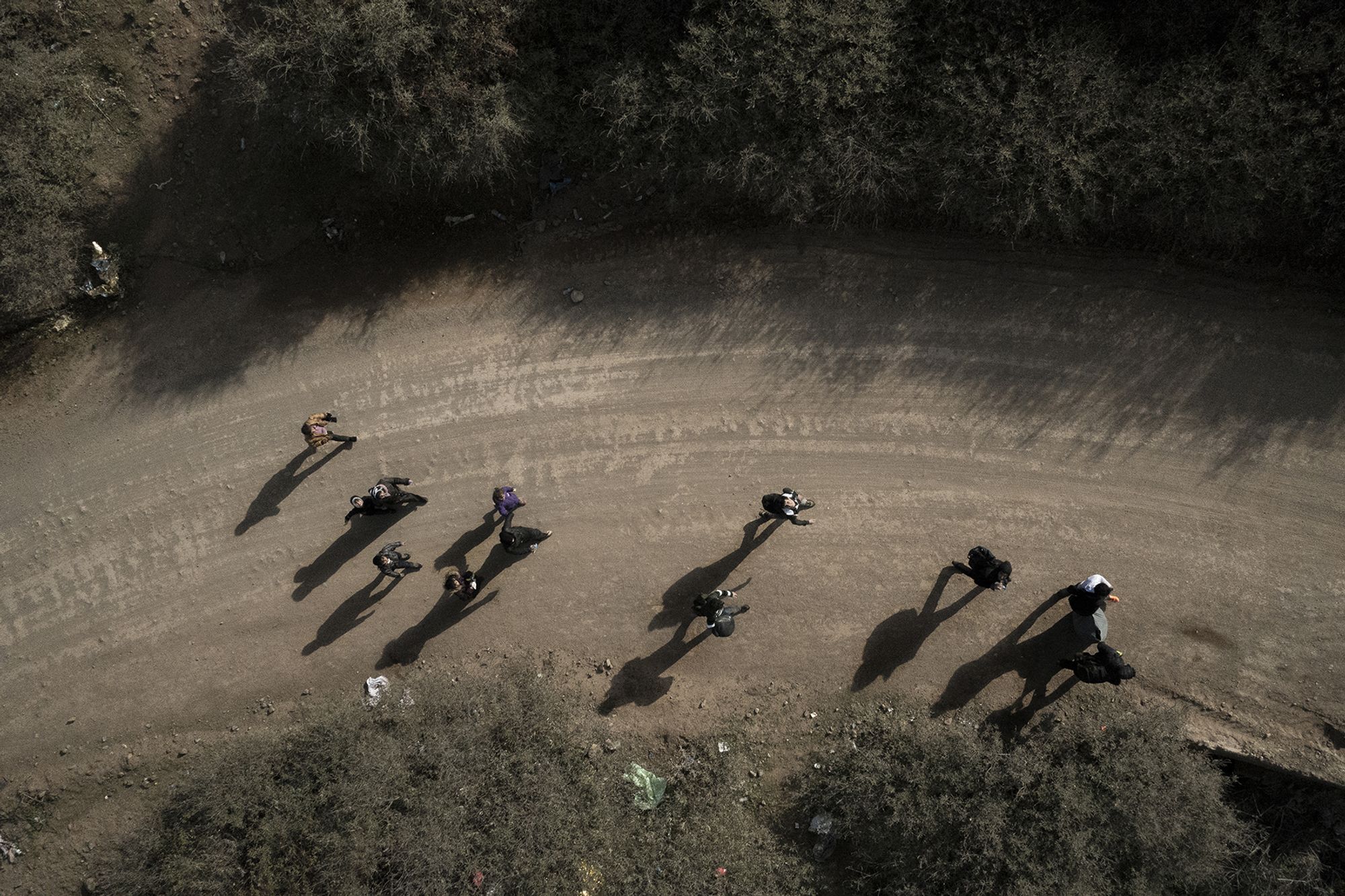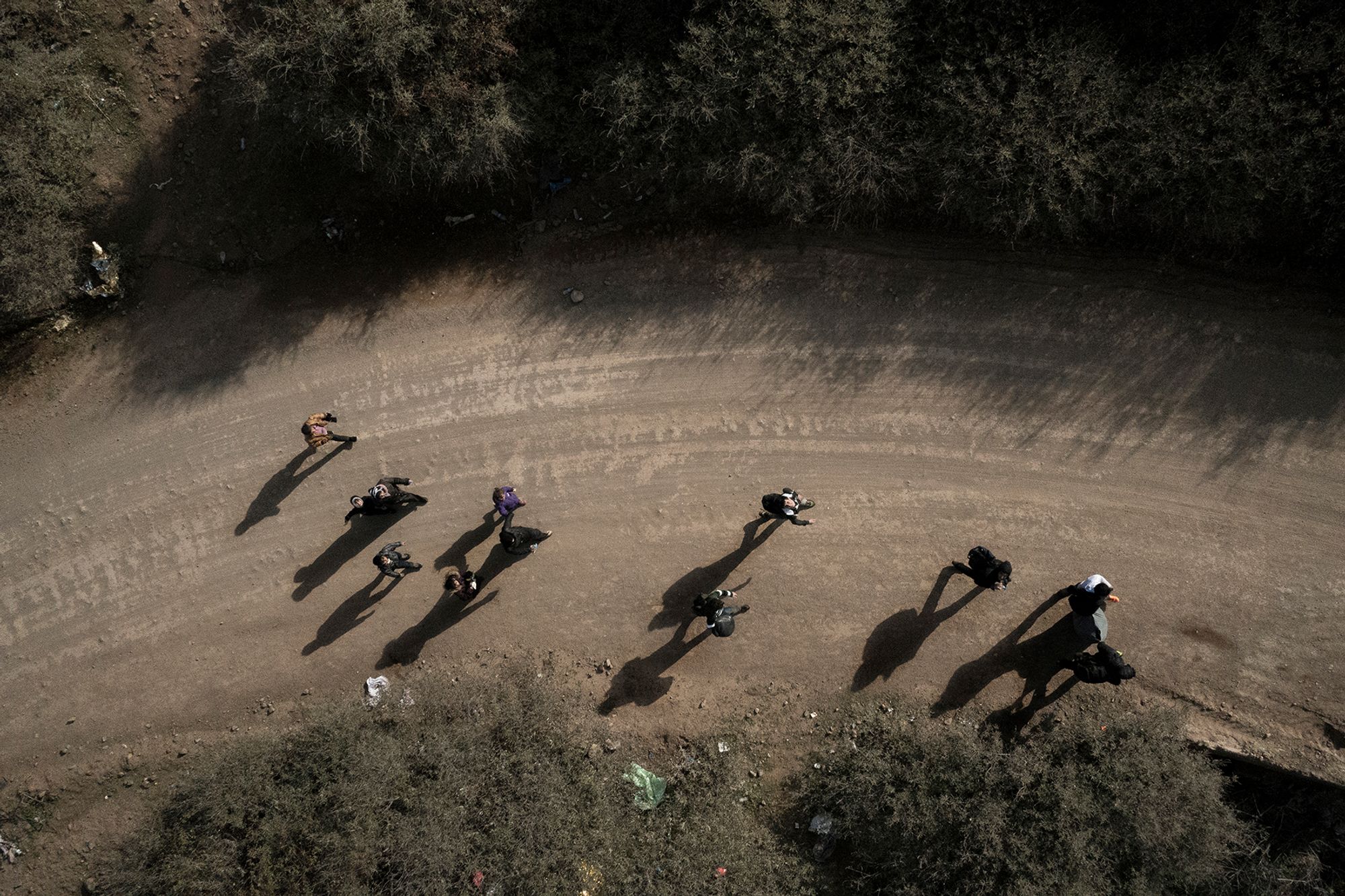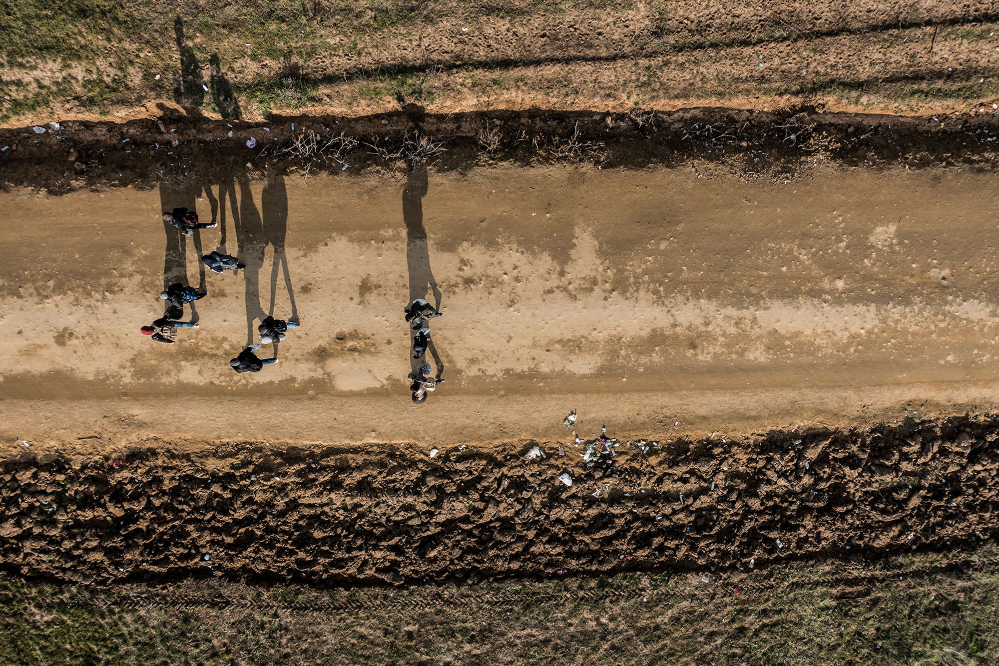 A group of young afghan boys and girls walk along the dirt road after crossing the border into Serbia.