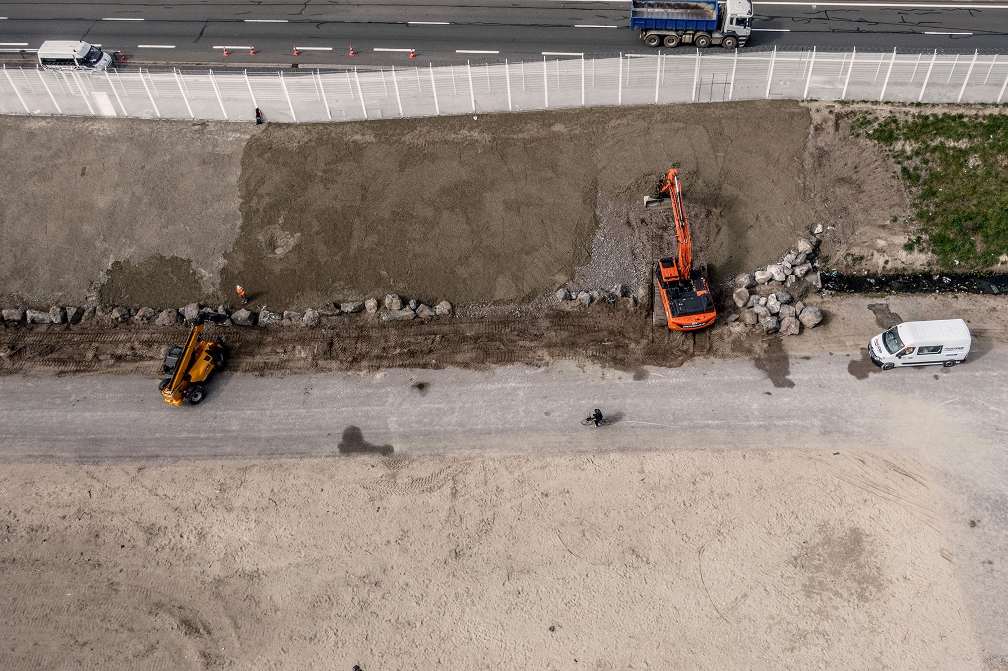 Workers maintain the fence at the edge of The Jungle in Calais. A migrants bikes past.