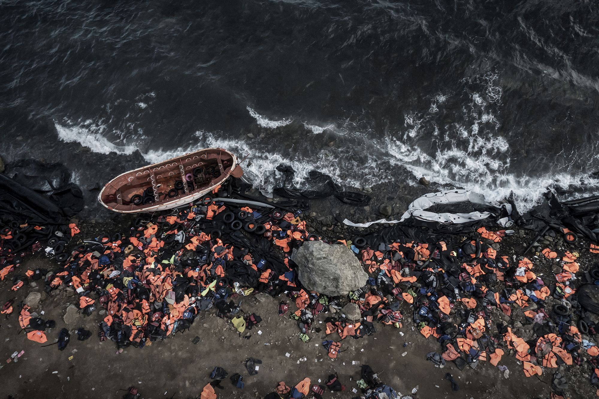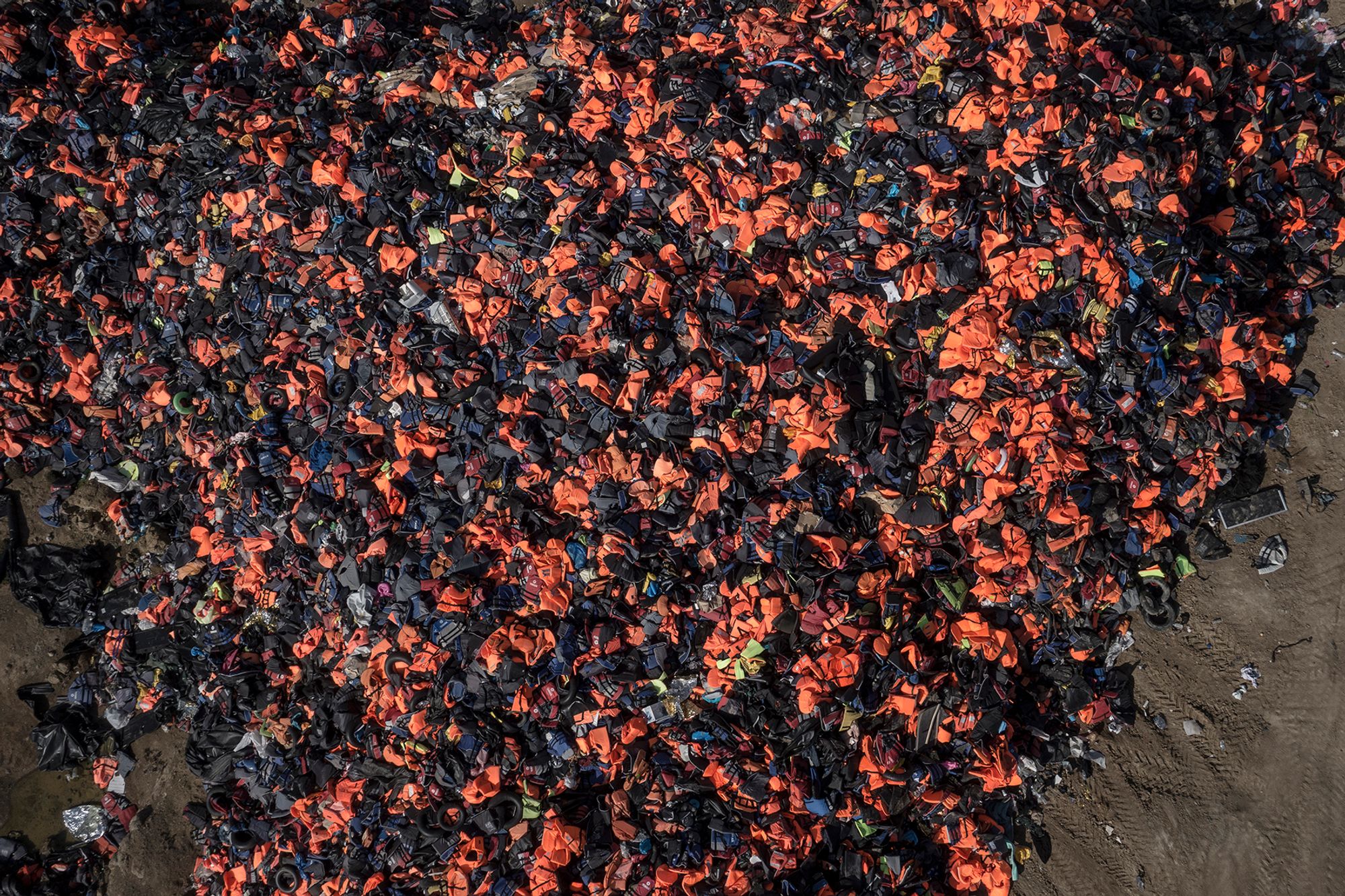 Over 100.000 life vests and rubber boats lie in a almost 10 meter high pile on the island of Lesbos, Greece. in 2015 Greece received well over 800.000 refugees and migrants. All primarily arriving with boat over the Aegean ocean.