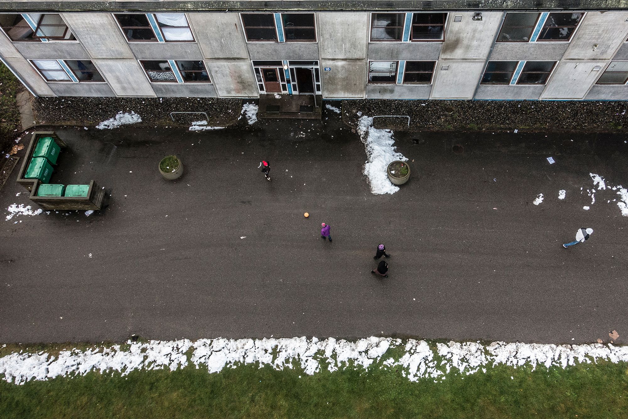 Two asylum seekers play football outside their home at the danish asylum center in Auderød.