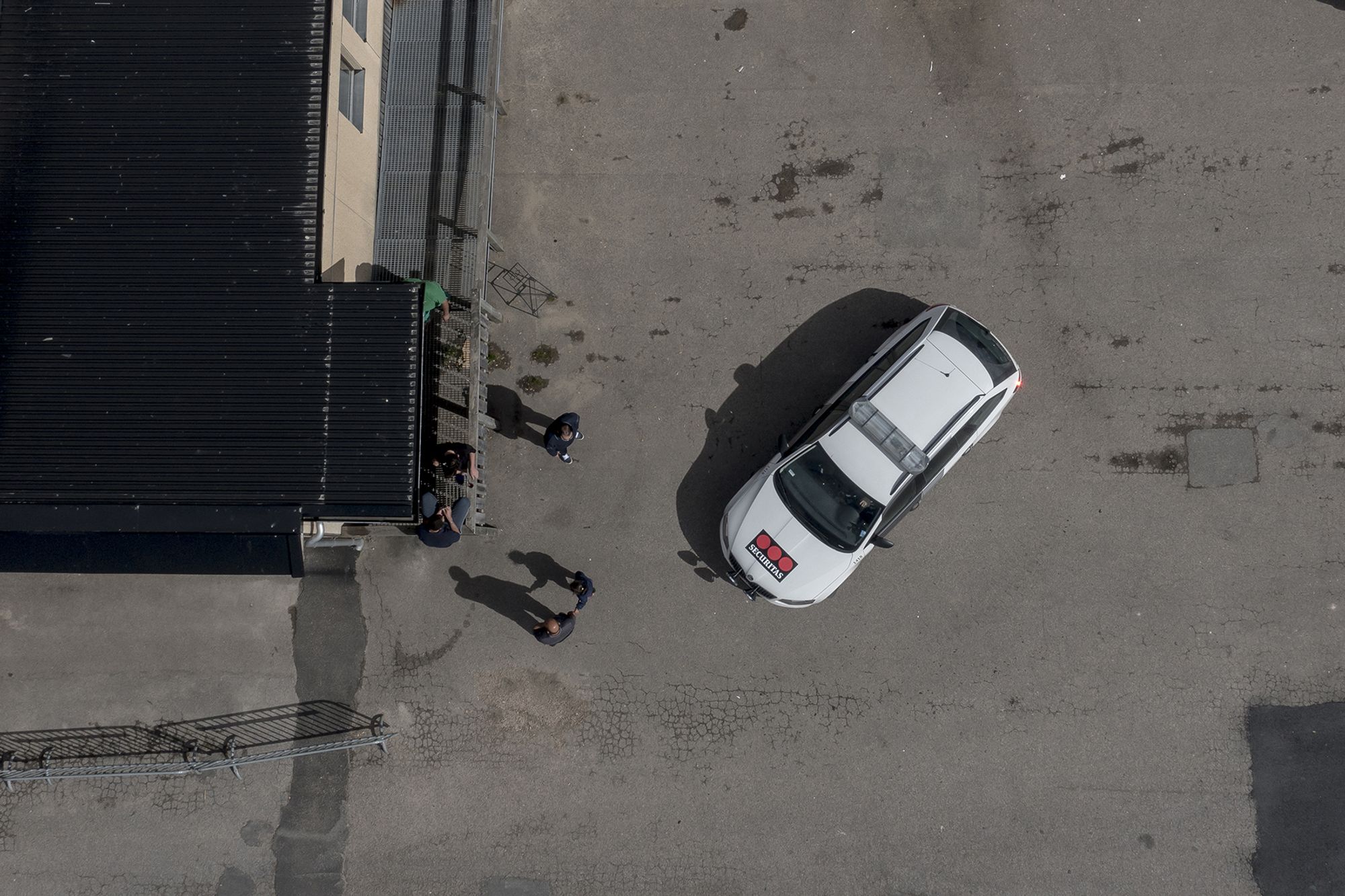 Asylum seekers stand outside their home in High Chaparral theme park, Sweden. A G4S security car patrols the area.