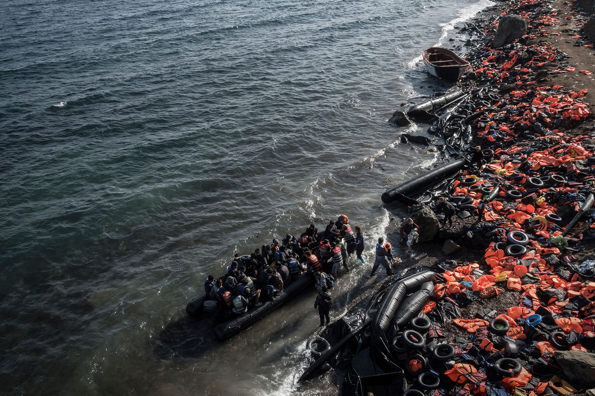A small rubber dinghy arrives on the coast of Greek island Lesbos. The island have seen hundred of thousands of migrants and refugees arrive from Turkey in 2015.