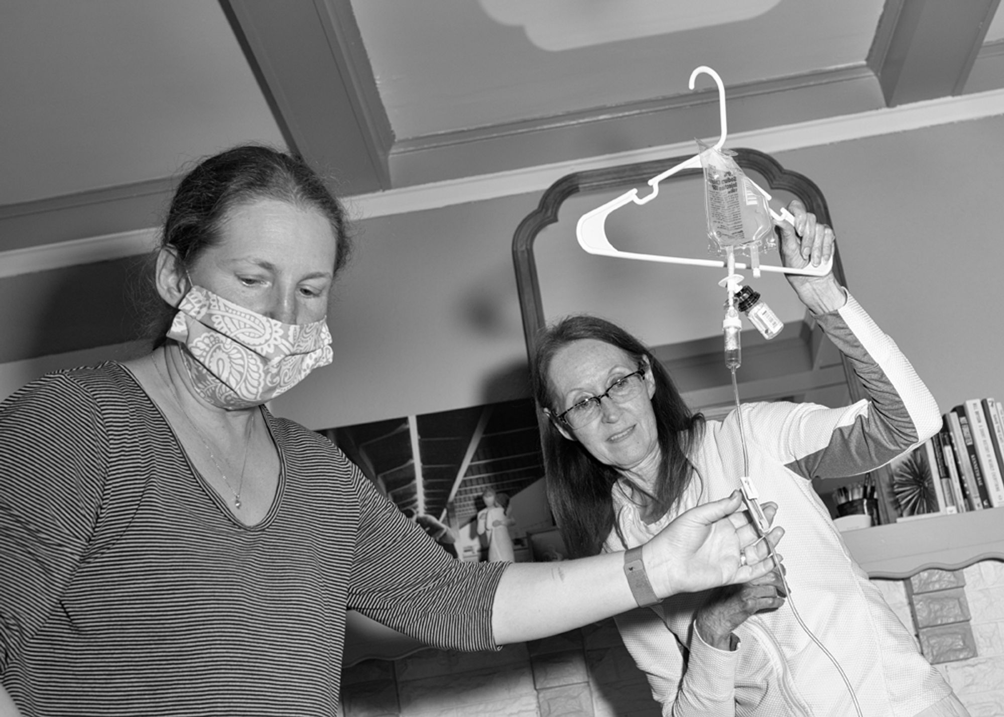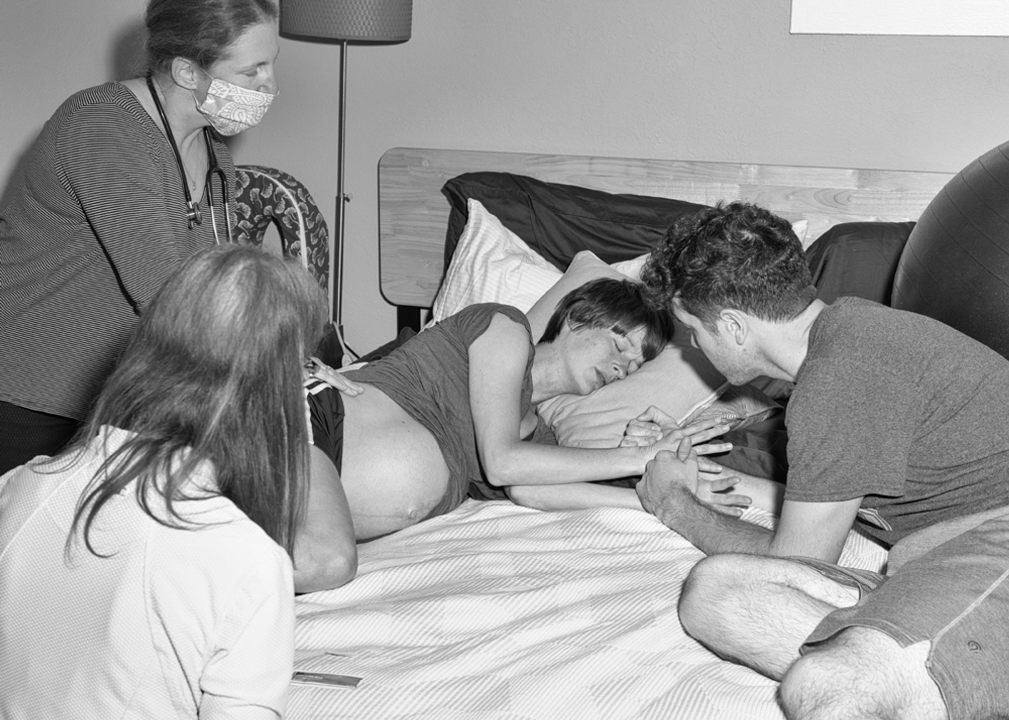 Midwife Naomi Drucker and Jes Anderson’s mother hold up her antibiotic IV drip as Jes moves into a more comfortable position during her labor at home in Los Angeles, California.