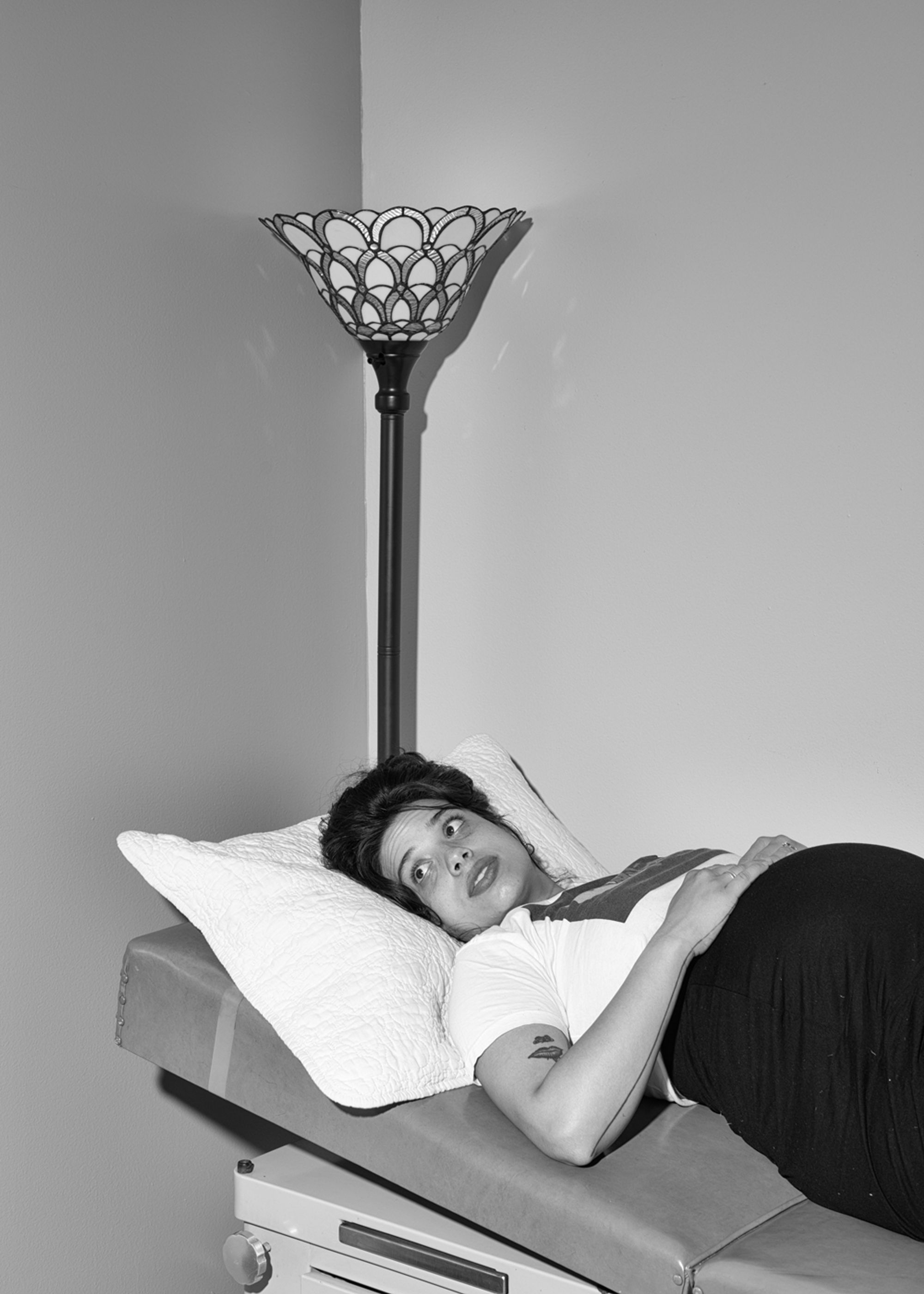 Taylor Almodovar lies on the examination table waiting for her prenatal checkup at a separate birth center in Arcadia, California run by midwife Chemin Perez.