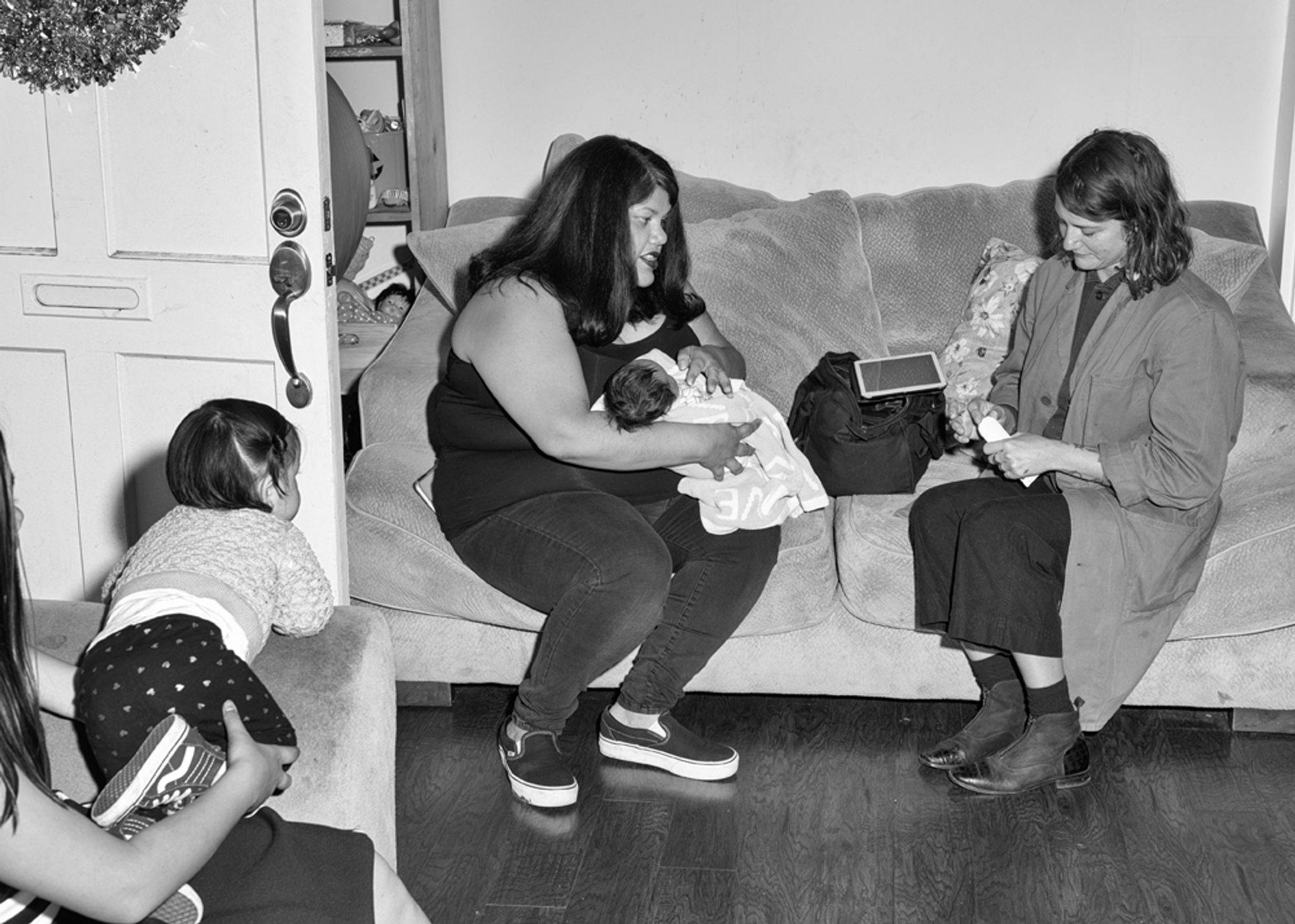 Midwife Christian Toscano performs a postpartum checkup on mother Roni Le and her infant daughter while her two other daughters watch nearby at Roni’s home in Temple City, California in early March. This was the last week Christian Toscano performed home visits before switching to telehealth due to the outbreak of Covid-19.