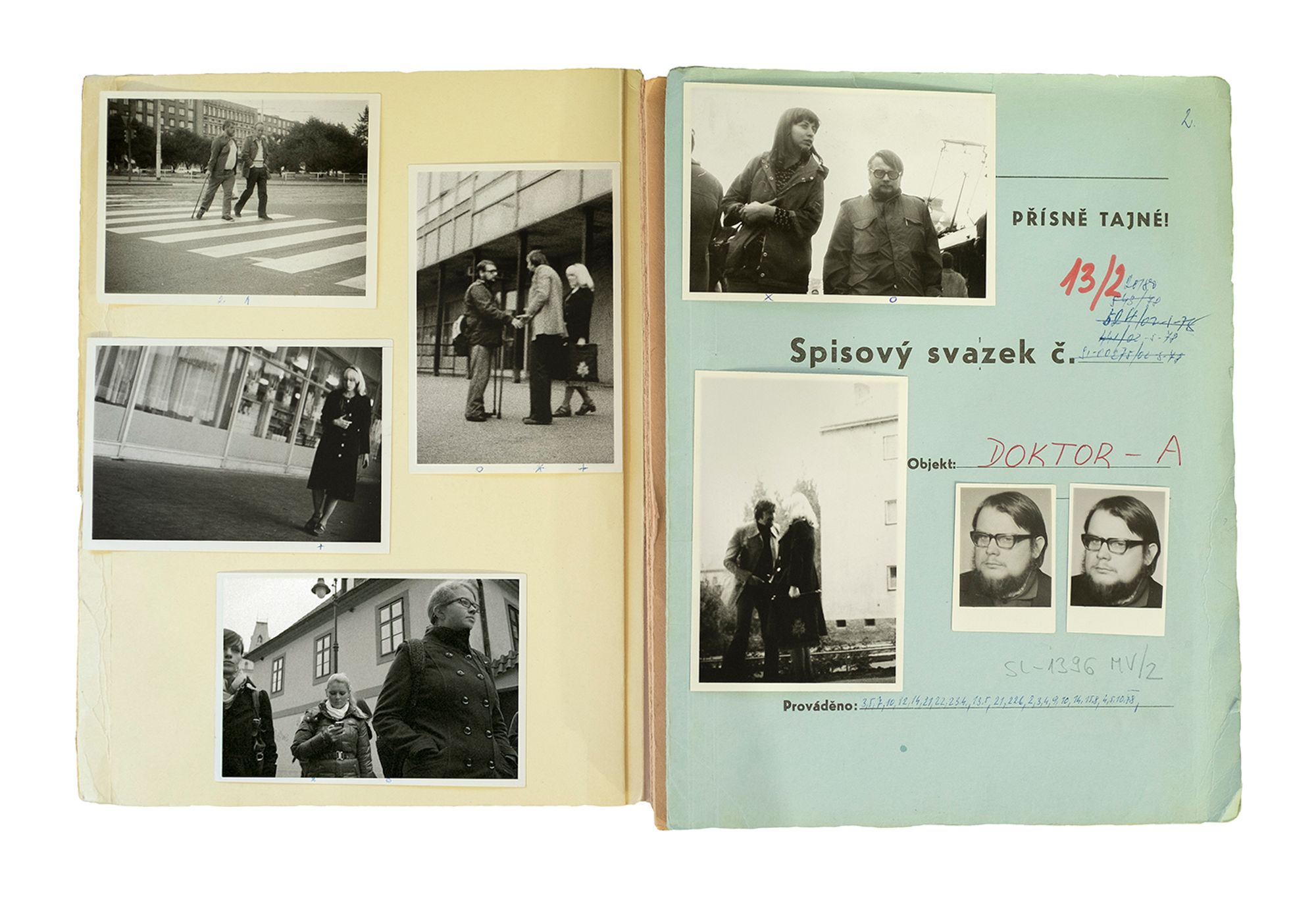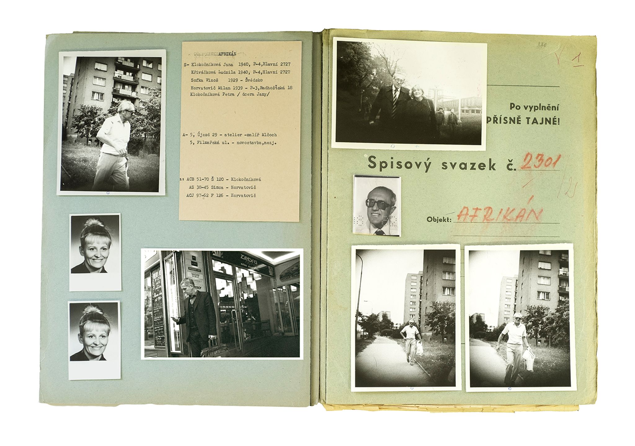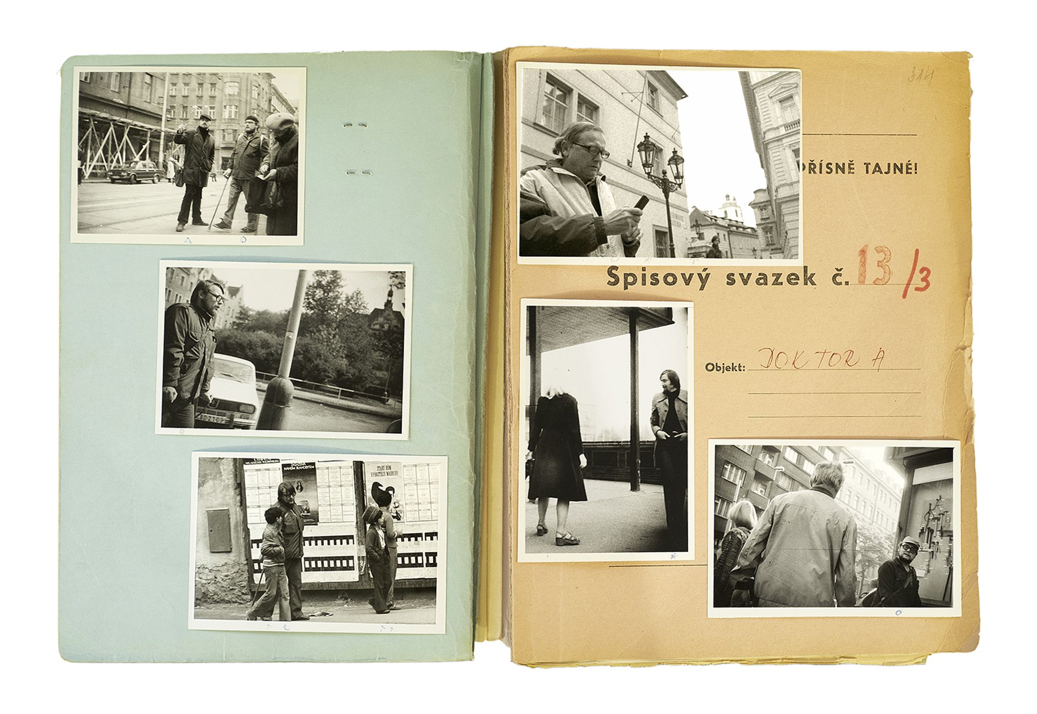 During the Communist period in Czechoslovakia (1948-89), the secret police followed indiscriminately thousands of citizens. Through a constant surveillance activity, they captured everyday moments and encounters that could potentially form a case for anti-revolutionary behaviour. The photographs were often captioned with detailed information on the place that they were taken, the date and time of day, and the people with whom the suspect had been seen.