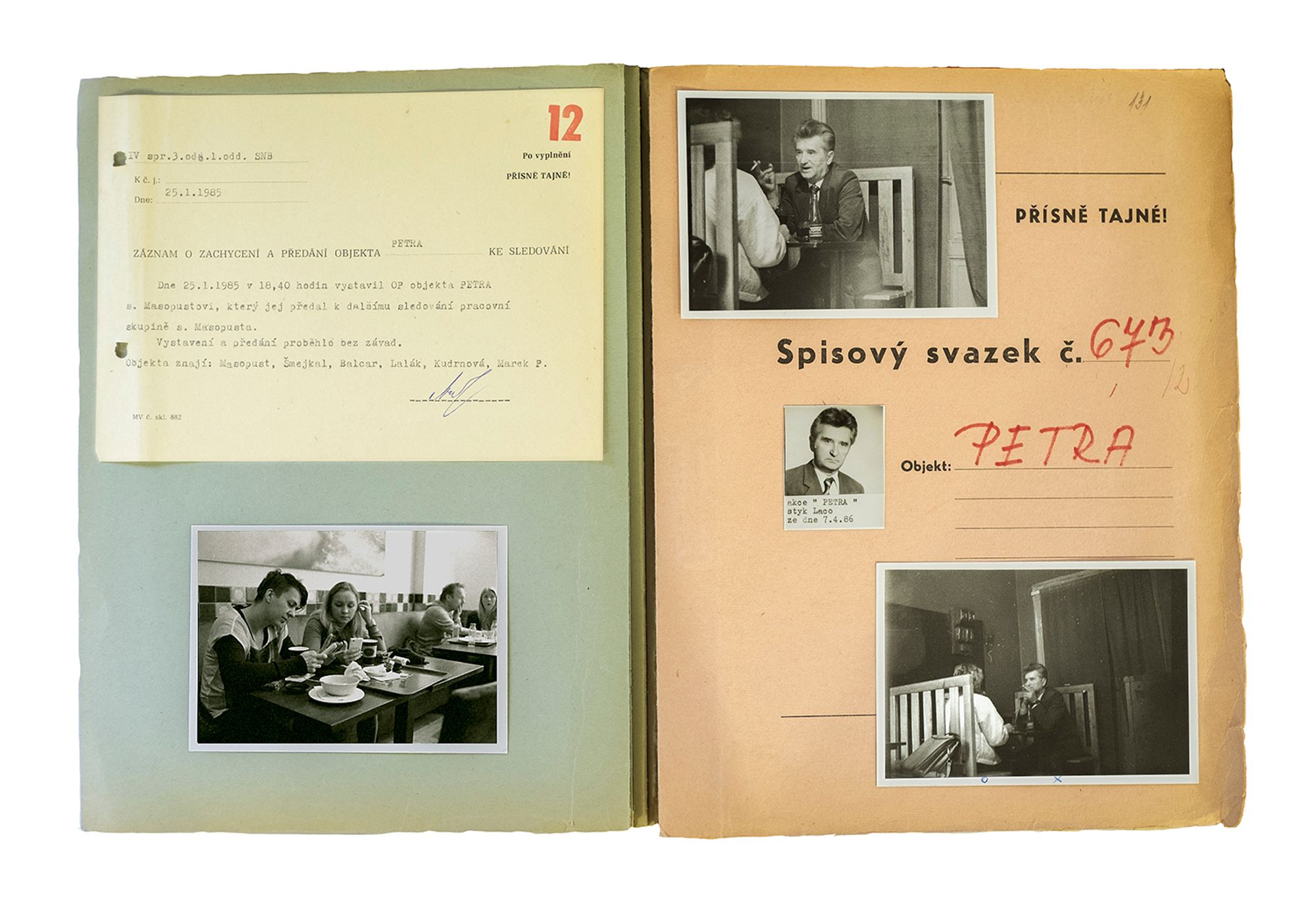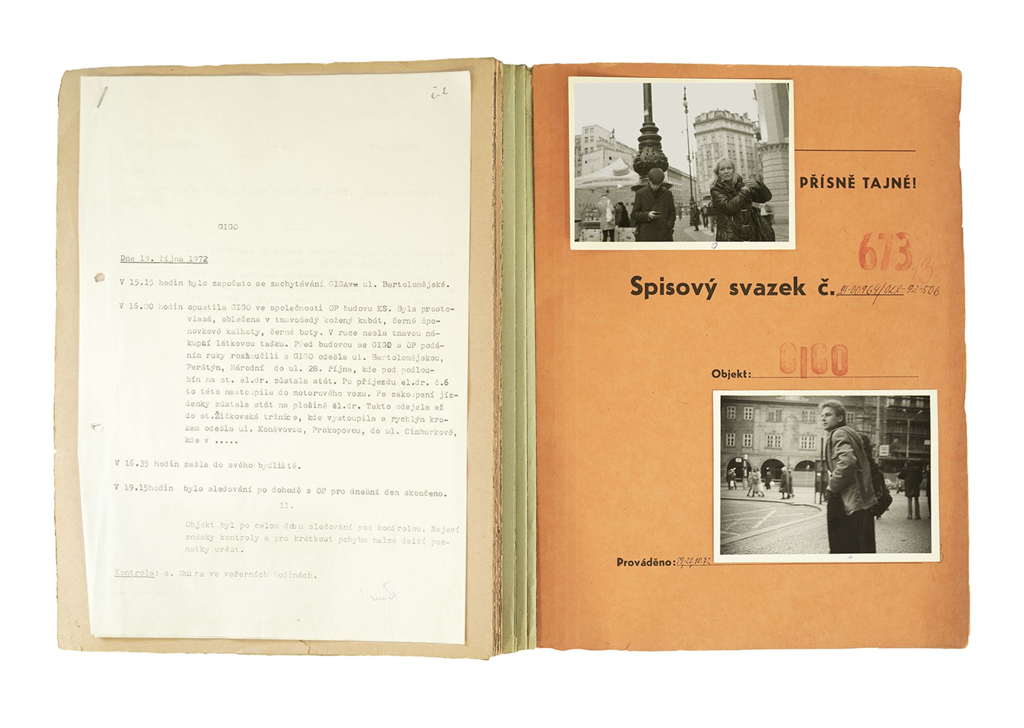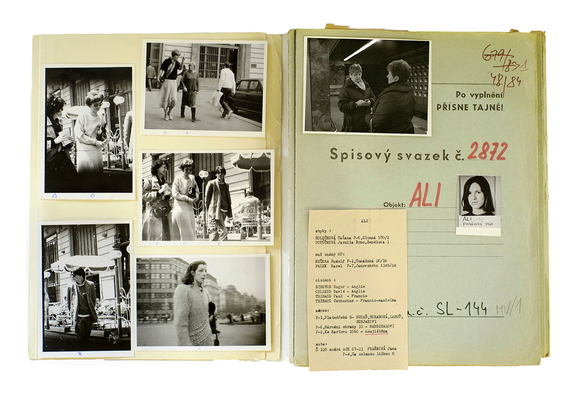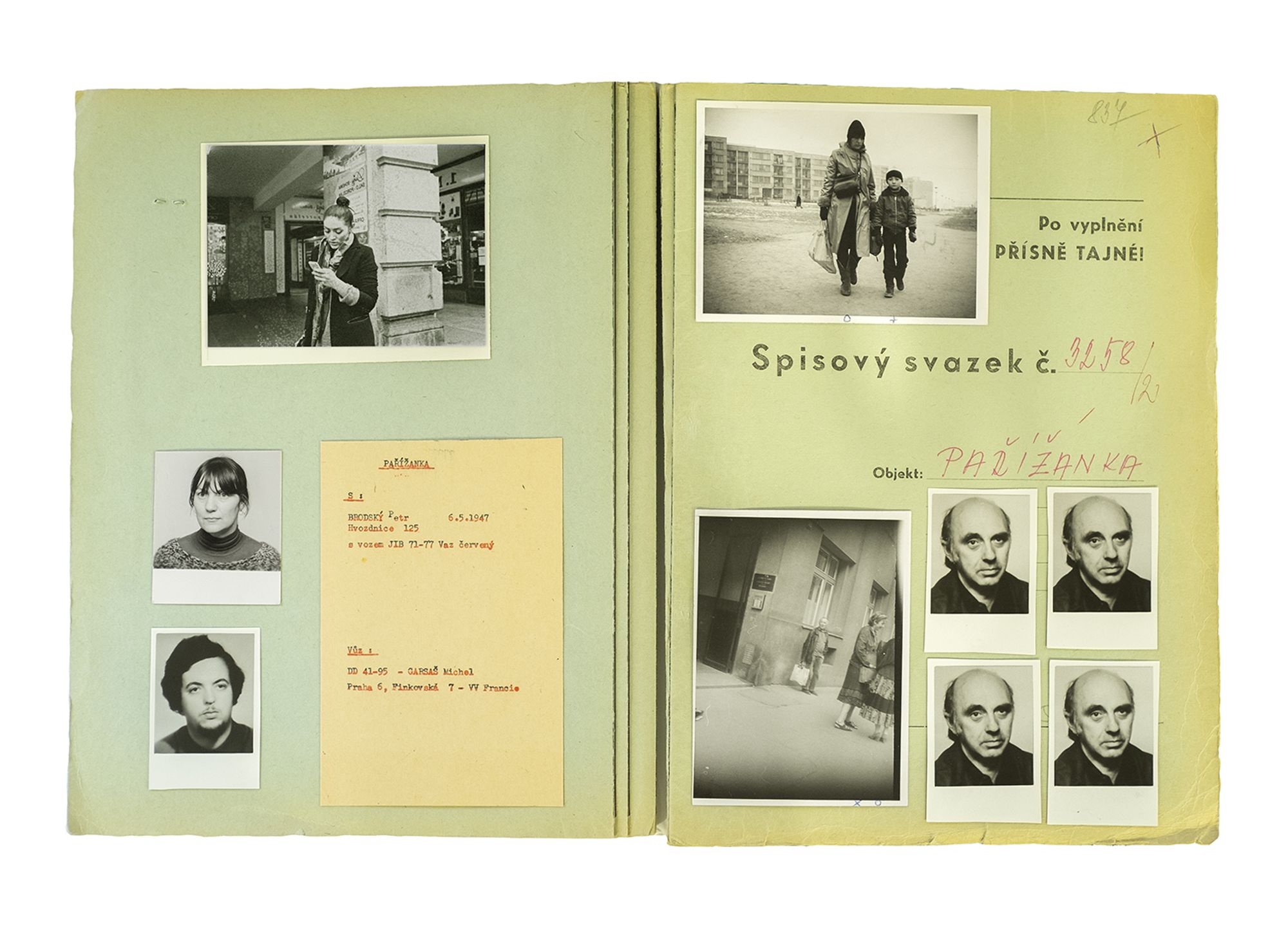 During the Communist period in Czechoslovakia (1948-89), the secret police followed indiscriminately thousands of citizens. Through a constant surveillance activity, they captured everyday moments and encounters that could potentially form a case for anti-revolutionary behaviour. The photographs were often captioned with detailed information on the place that they were taken, the date and time of day, and the people with whom the suspect had been seen.
