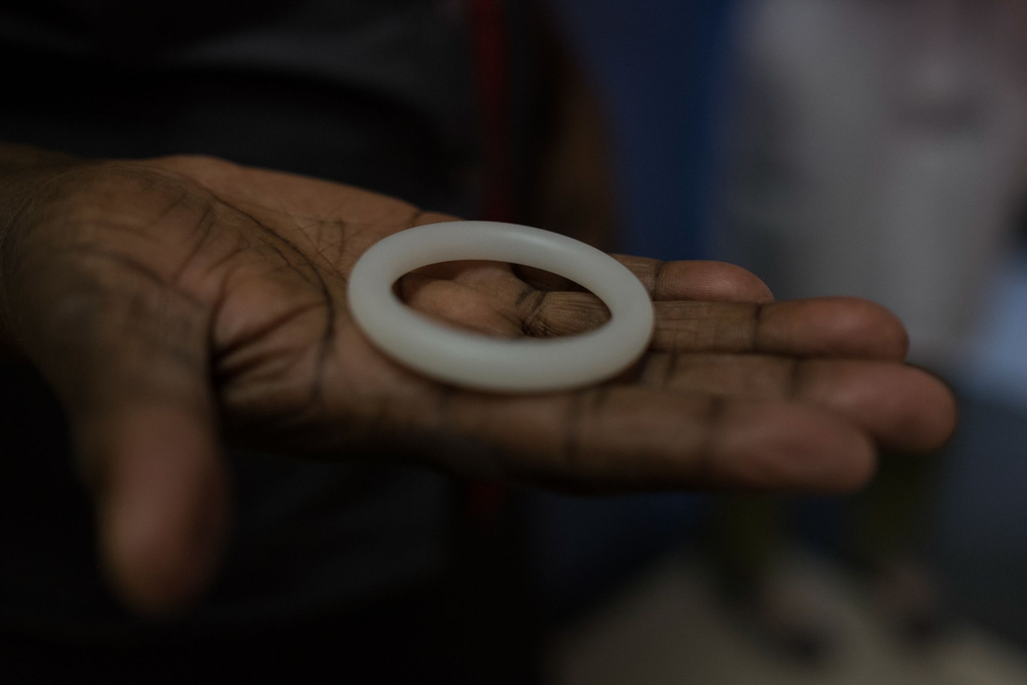 A nurse shows a dapivirine vaginal ring at the CAPRISA urban clinic in Durban. The ring is a new HIV prevention method that slowly releases ARV (anti retro viral) drug, and designed to remain in place for at least one month to provide sustained and easy-to-use protection against HIV. Durban, Soutjh Africa, 2017.