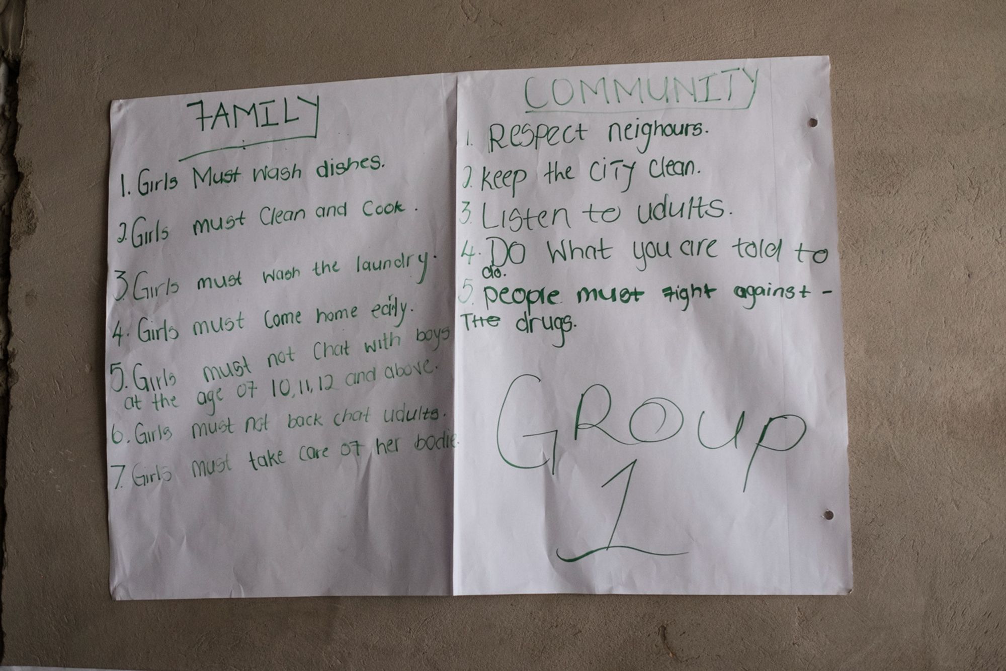 On a large piece of paper, girls from the township of Lamontville in Durban hace written how they think they should behave with their family and their community during a behavioural change communications workshop. Lamontville, Durban, South Africa, 2017.