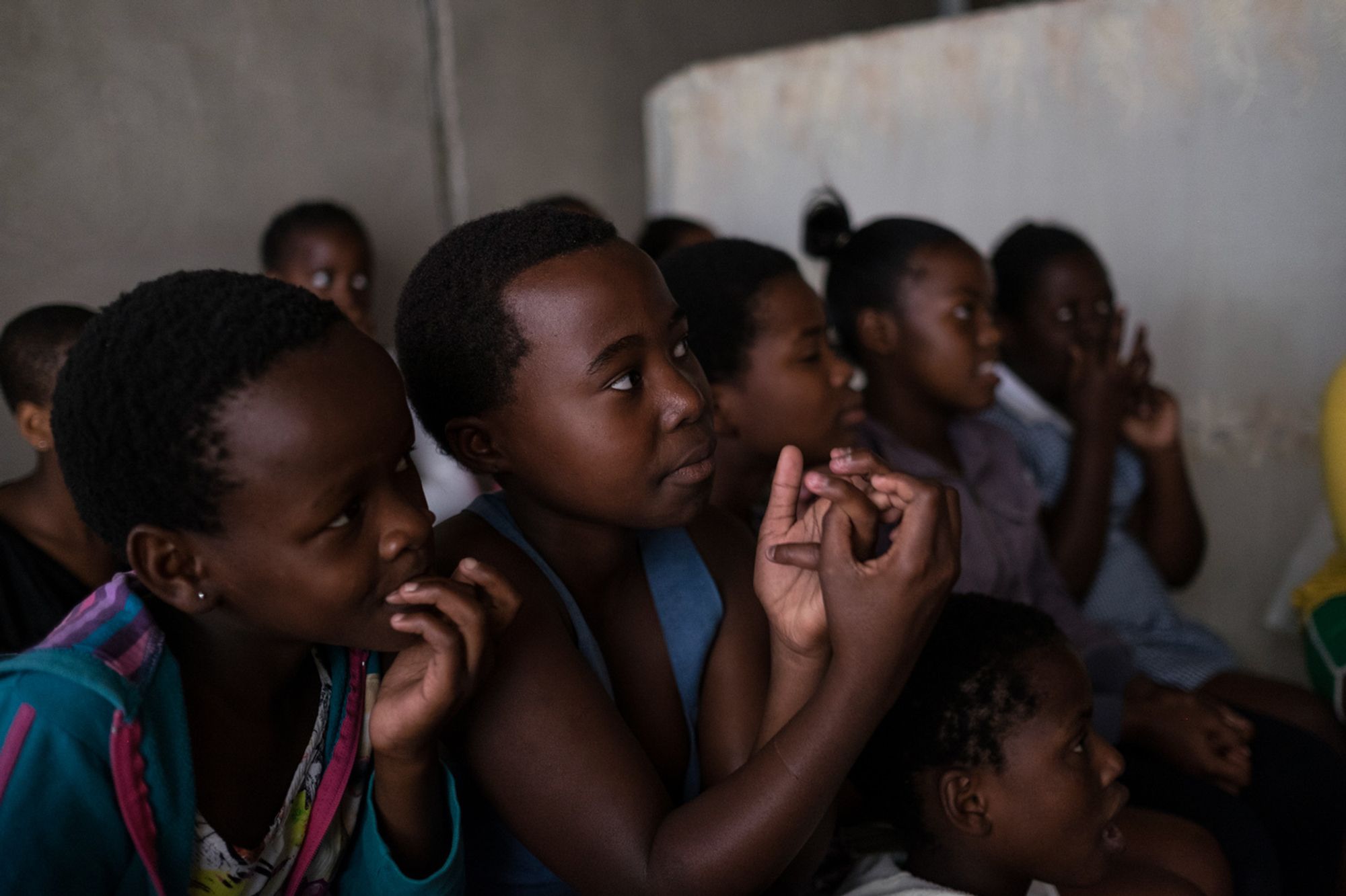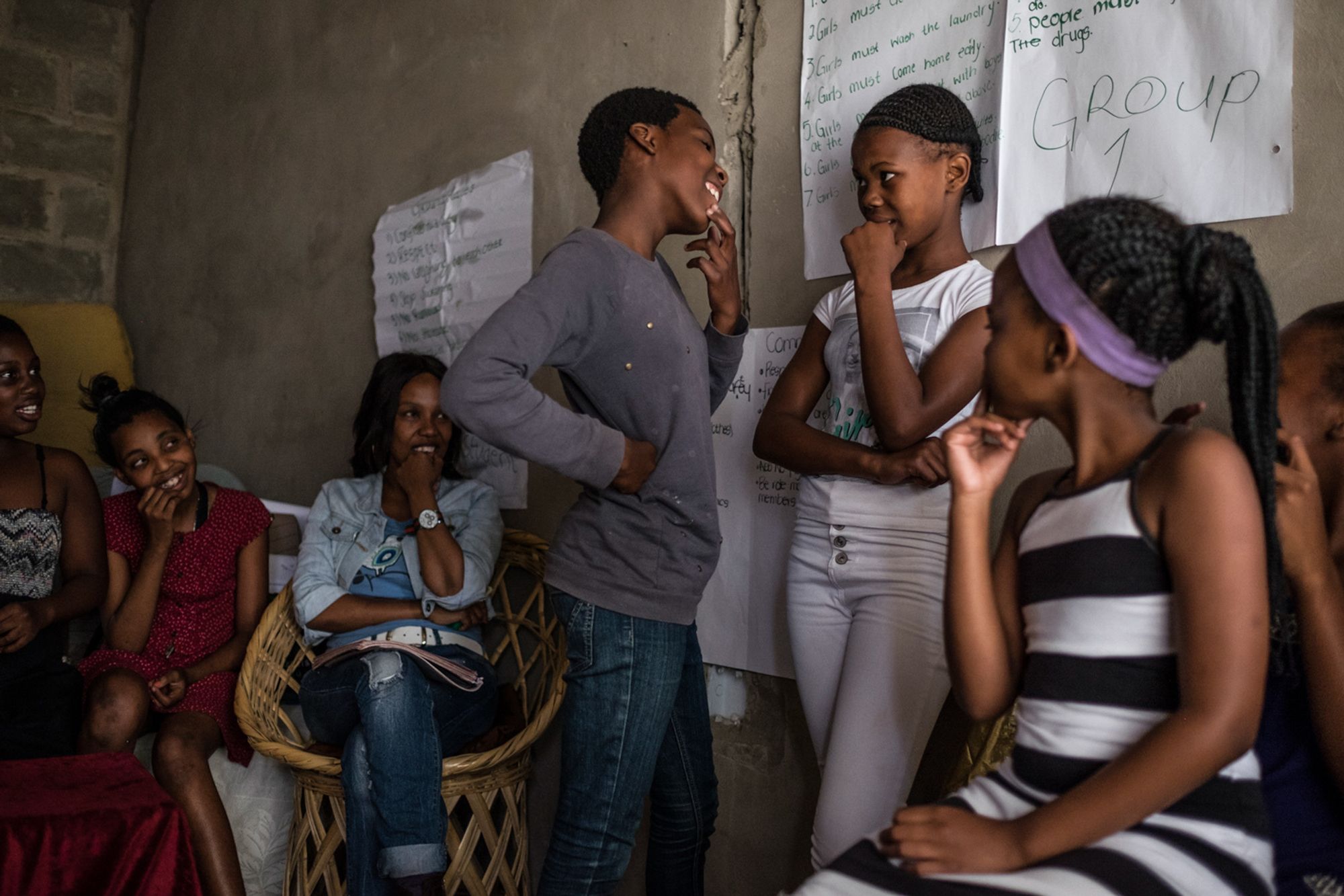 Girls aged 10-14 attend a behavrioral change communications workshop, designed to prevent intimate partner violence and HIV-risk behaviours, in the township of Lamontville in Durban. During the session, questions of gender, sexuality, HIV/AIDS, gender violence, communication and relationship skills are addressed. Lamontville, Durban, South Africa, 2017.