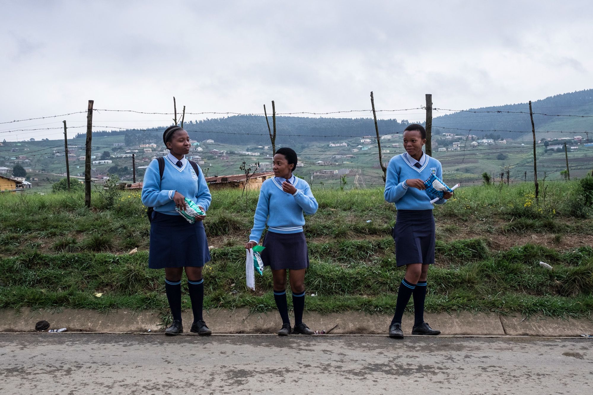 Young girls are walking in the streets after the end of their school day in Vilundlela, in KwaZulu Natal. Nearly a third of all new HIV infections in South Africa occur in 15-24 year olds with adolescent girls being up to eight times more likely to be infected with HIV that their male counterparts. An estimated 2000 South African young women between the age of 15-24 years get infected with HIV every week. Vulindlela, South Africa, 2017.