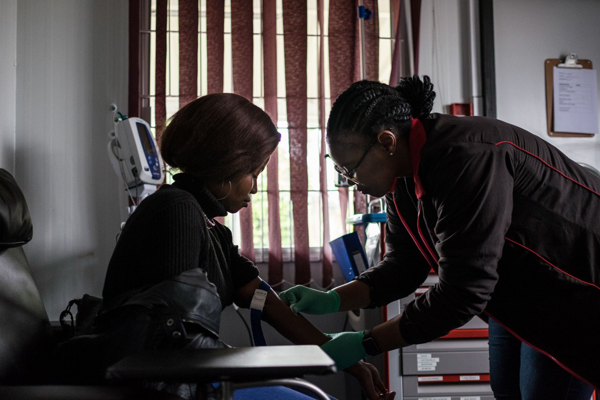 Siphile Madlola, 22 yo, is HIV negative. She is having a blood sample withdrawn at the CAPRISA clinic in the rural area of Vulindlela in KwaZulu Nataln during a safety visit, as part of a research study. She decided to join one of the research programmes led by CAPRISA in Vulindlela after having unprotected sex with a man she did not trust. Vulindlela, South Africa. 7 November 2017.
