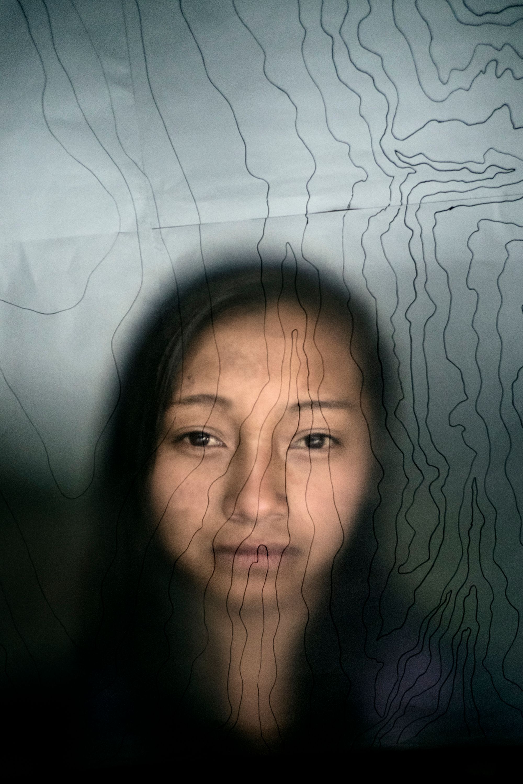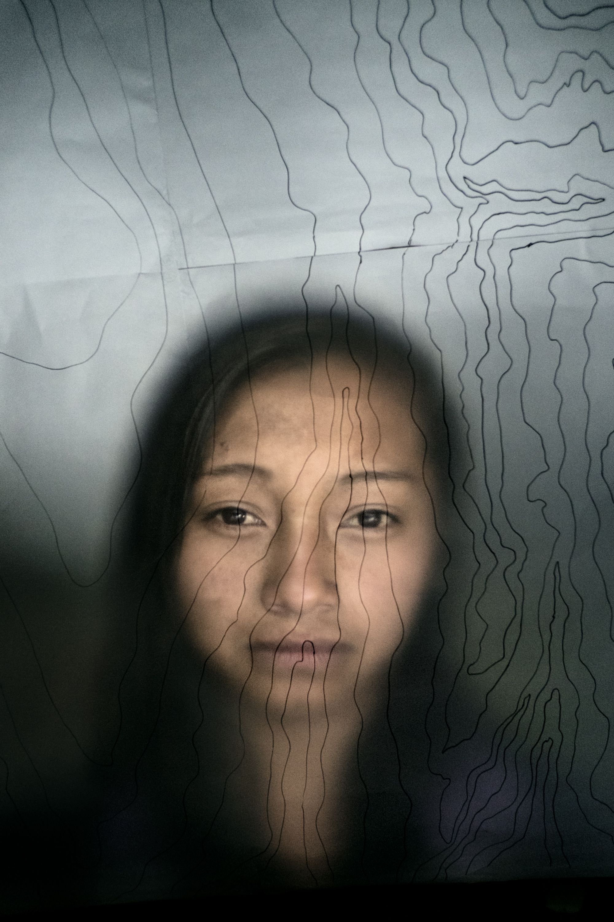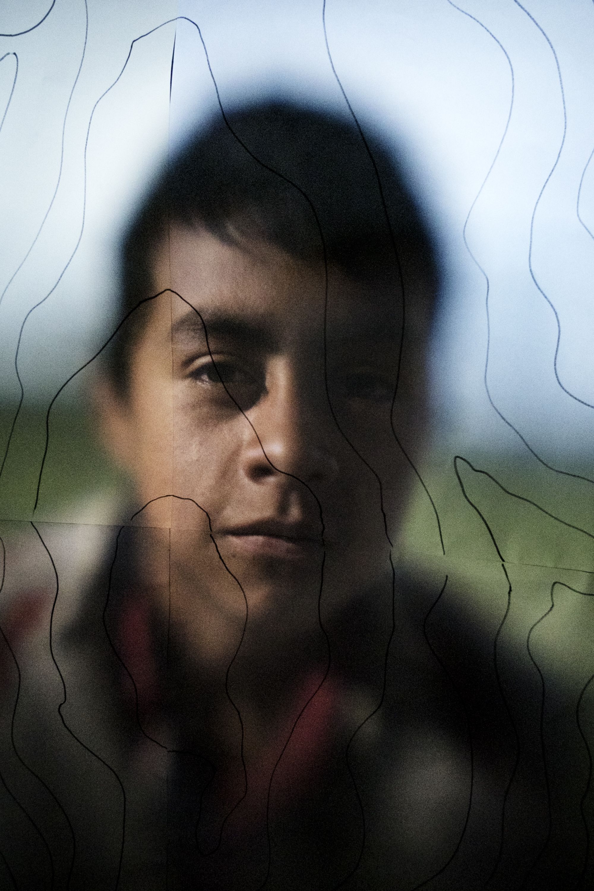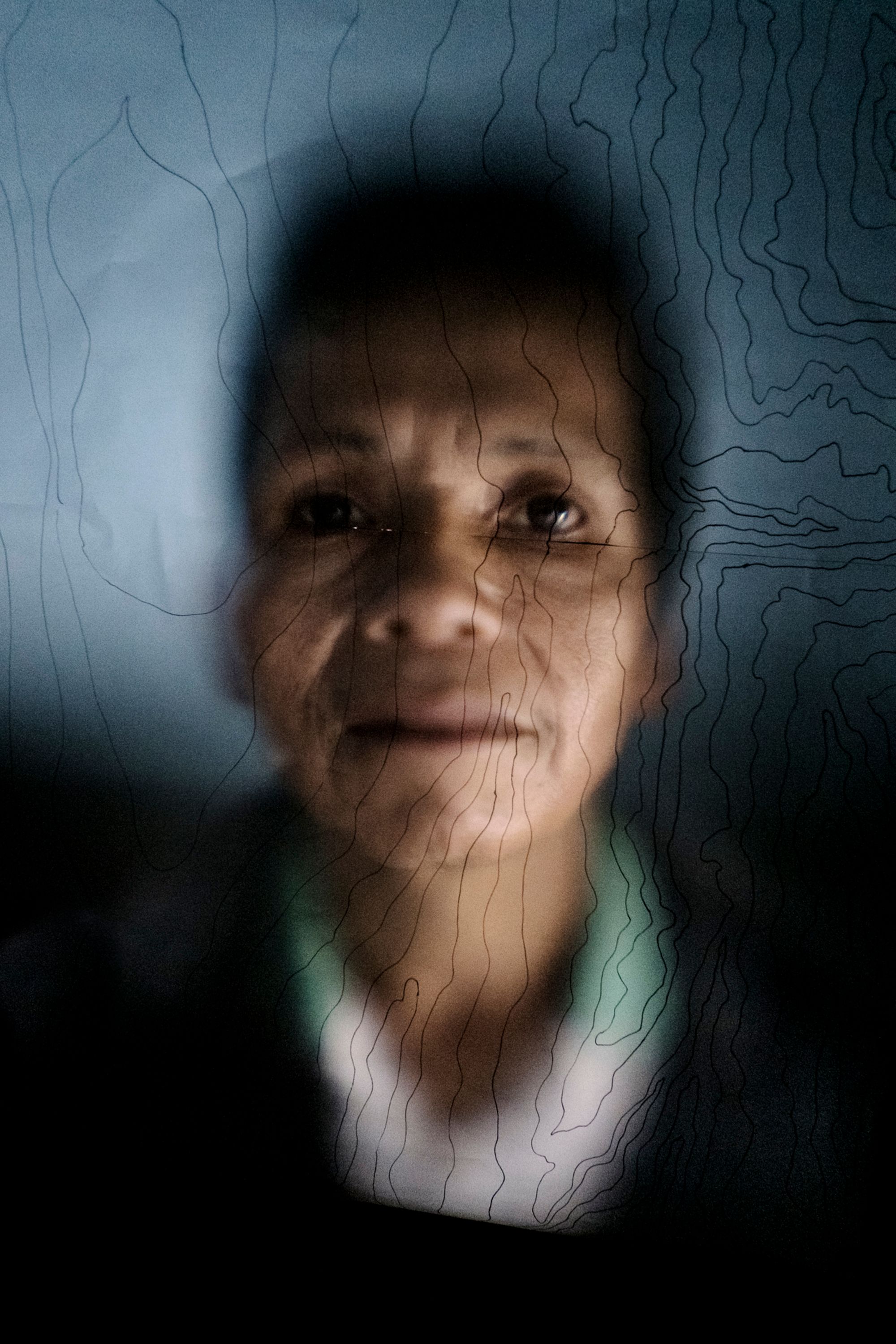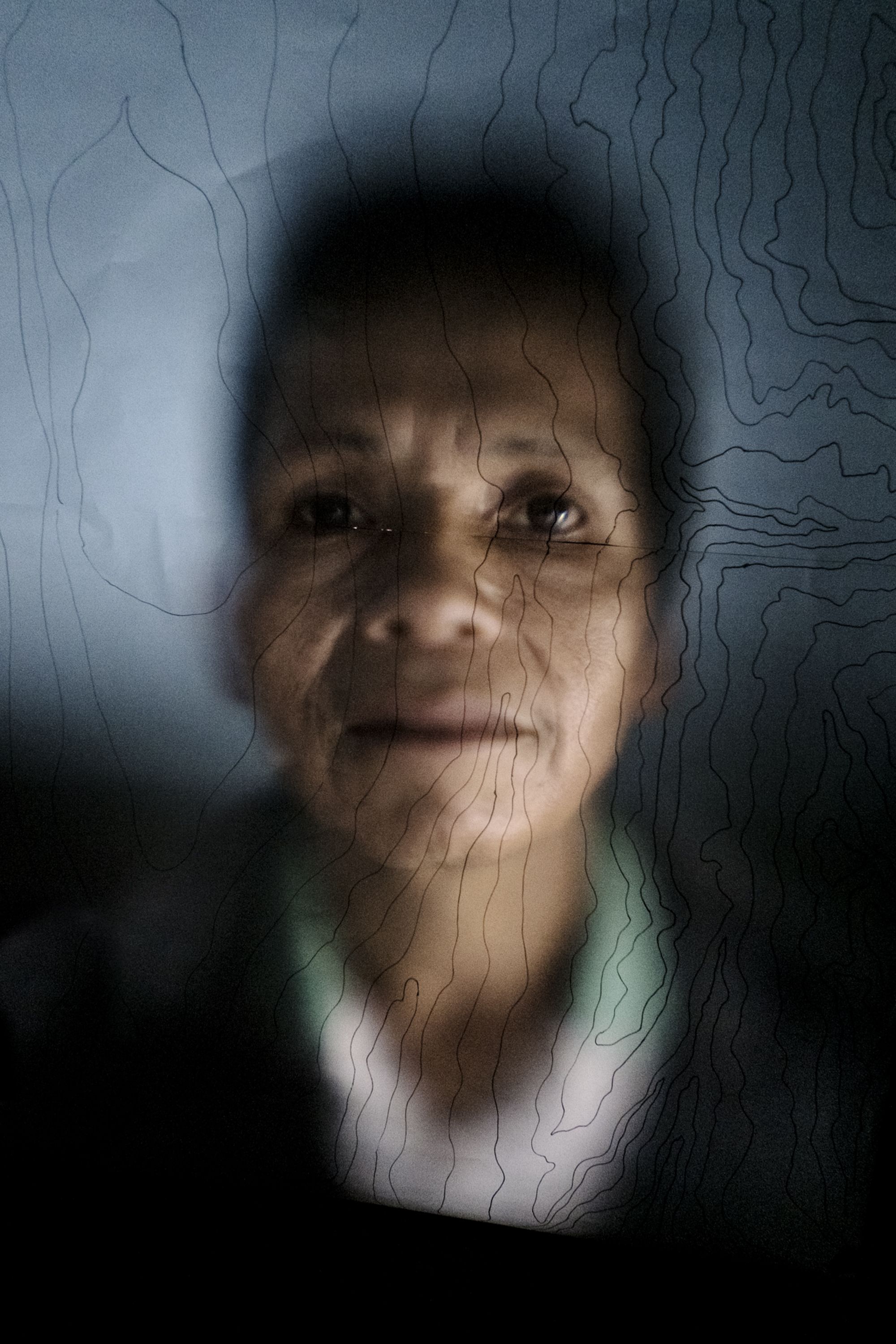 The lines that are part of the portrait are the geographic curves of the mountains where she lives each of these people. In the image identity and territory are united as they are in real life.
