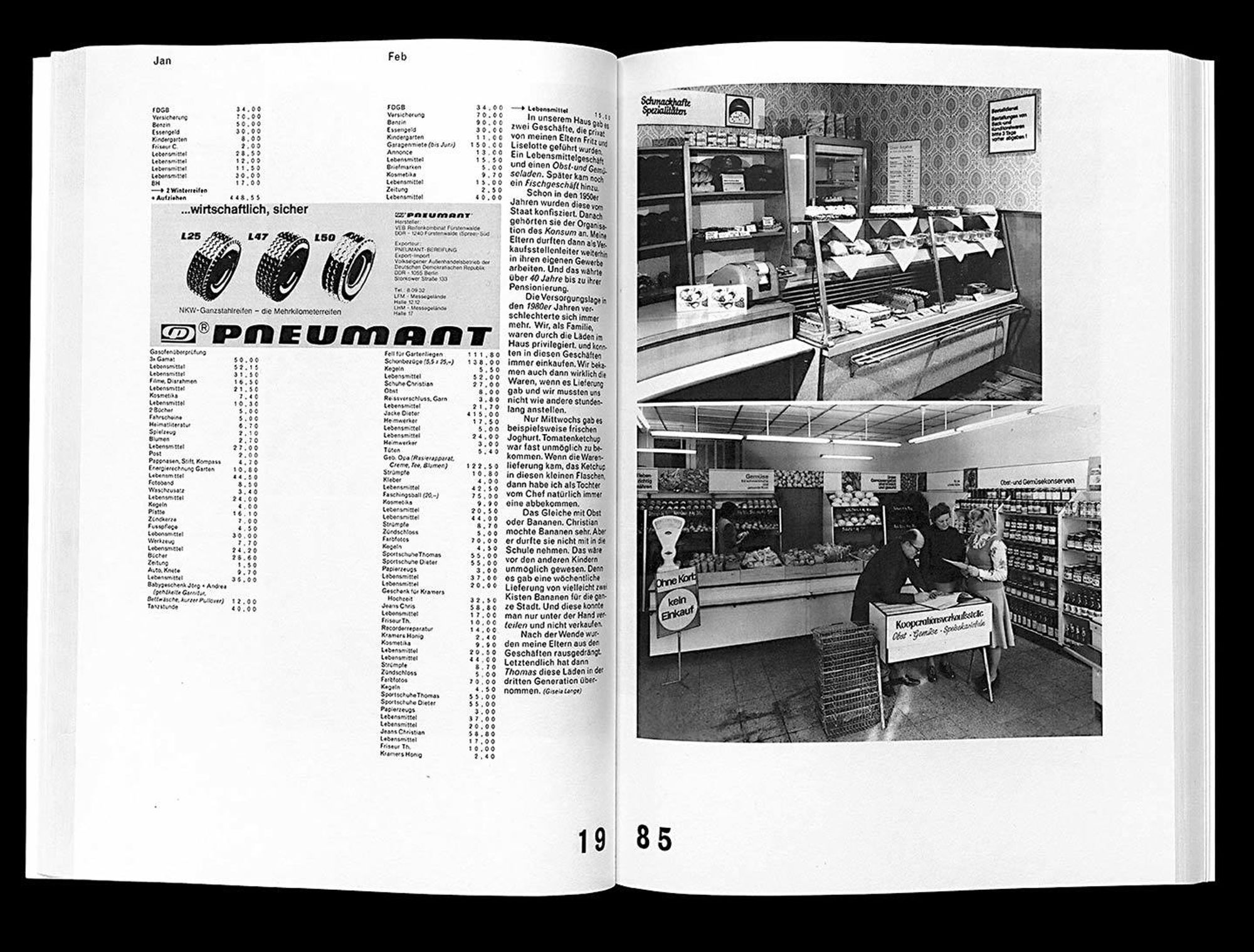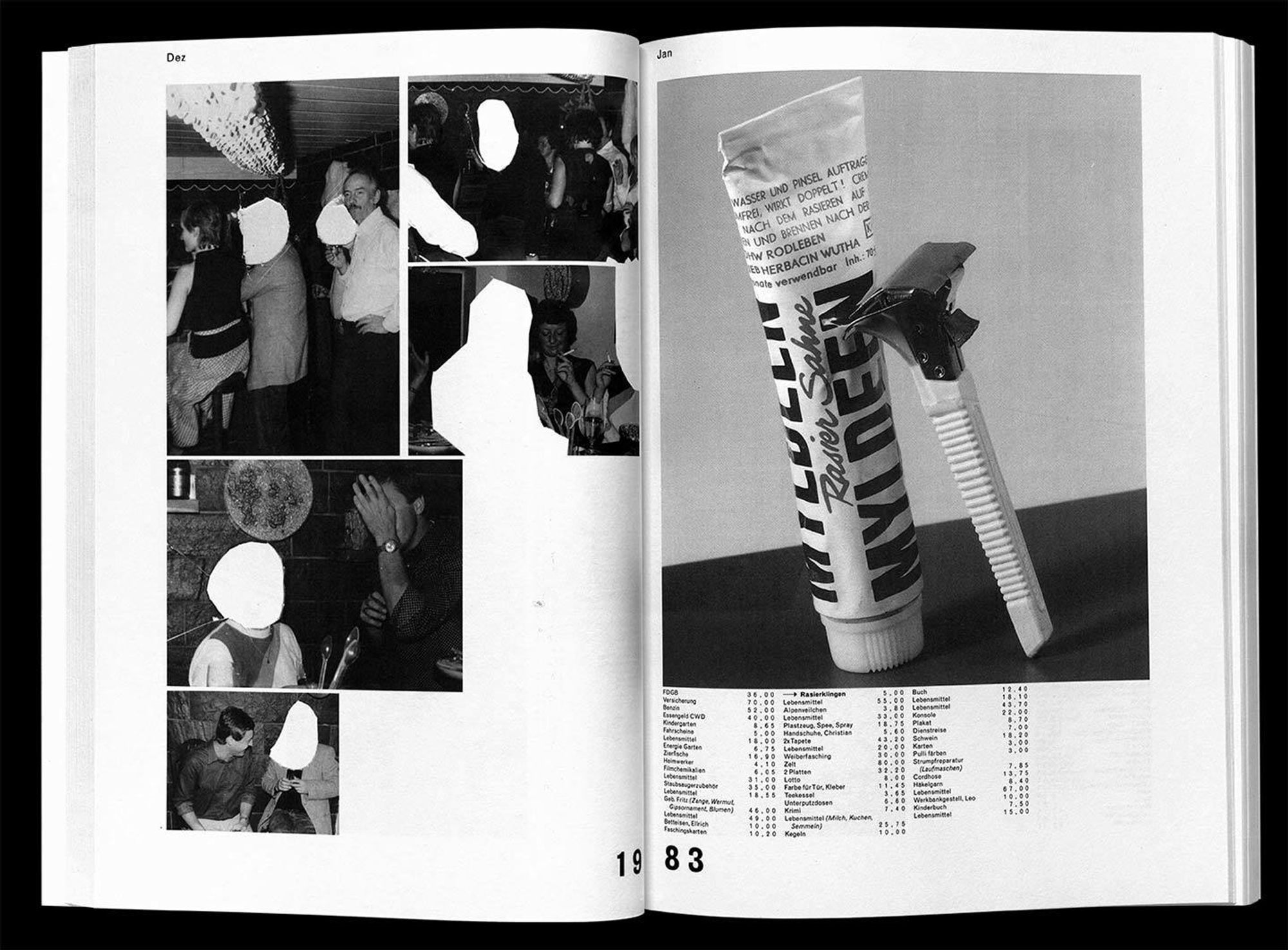 A series of family photos, pictures of products, certificates and receipts add to the family’s archive. With its 12,051 items, this book grants a detailed impression of the hidden desires, pleasures and losses of a family’s household kept in two different political and economic systems. It is the story of my childhood and youth in form of a housekeeping book. And it is a unique document covering everyday life during the late GDR and the German Republic shortly after unification.