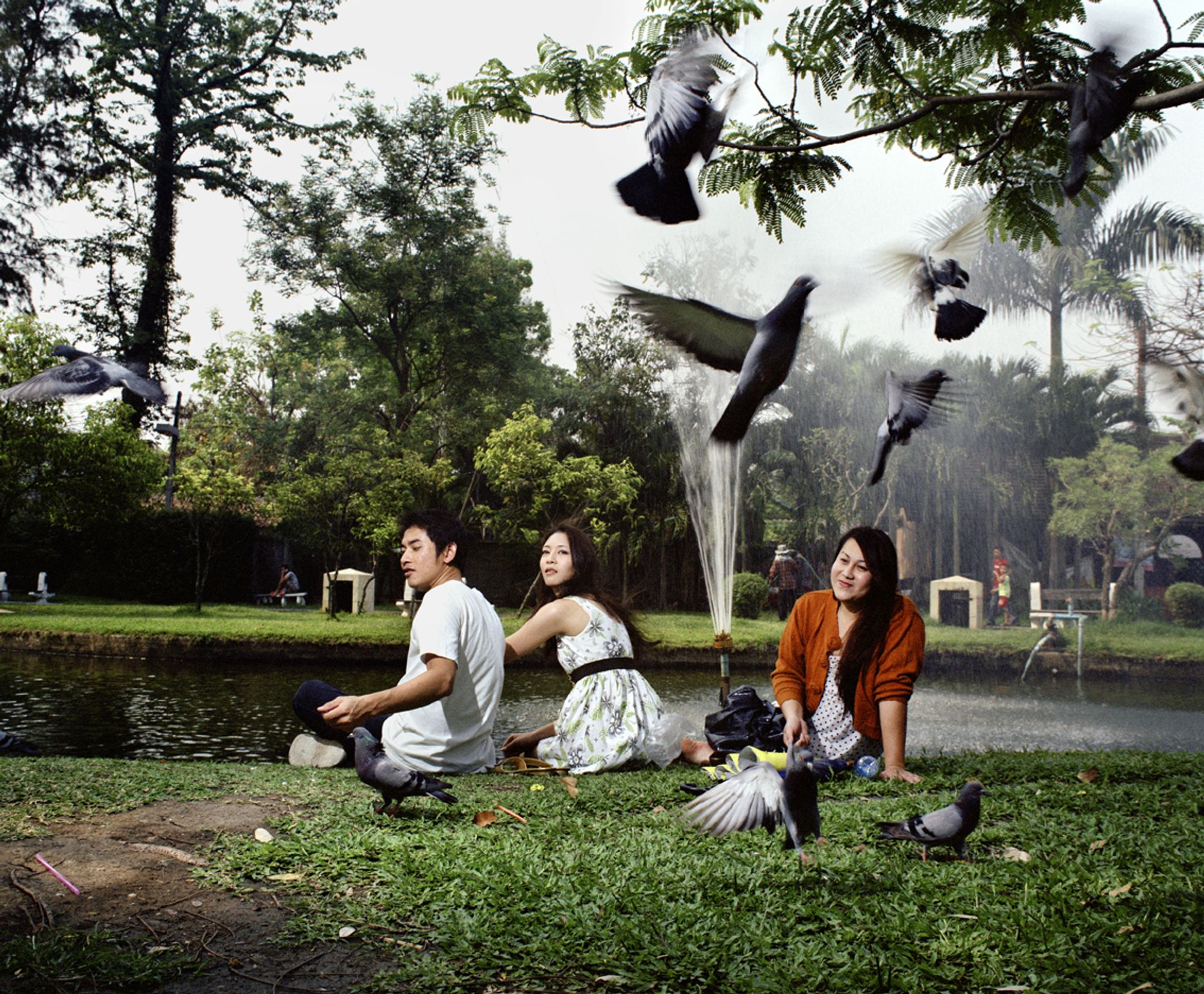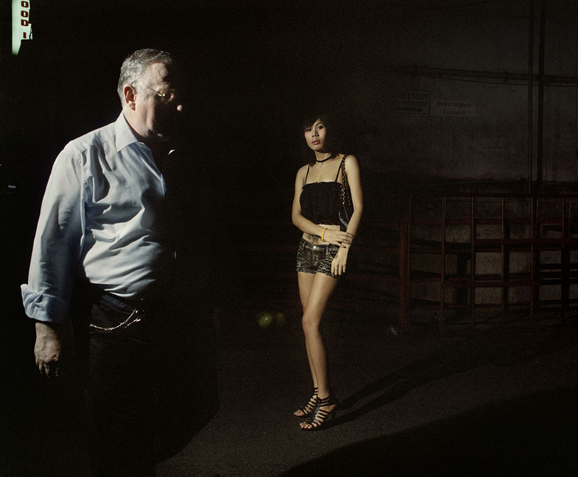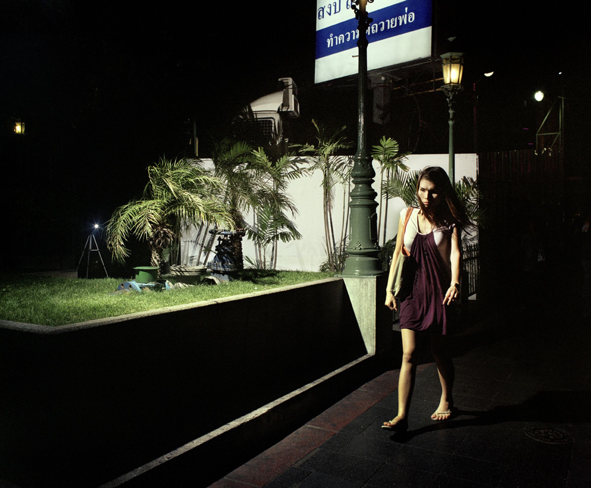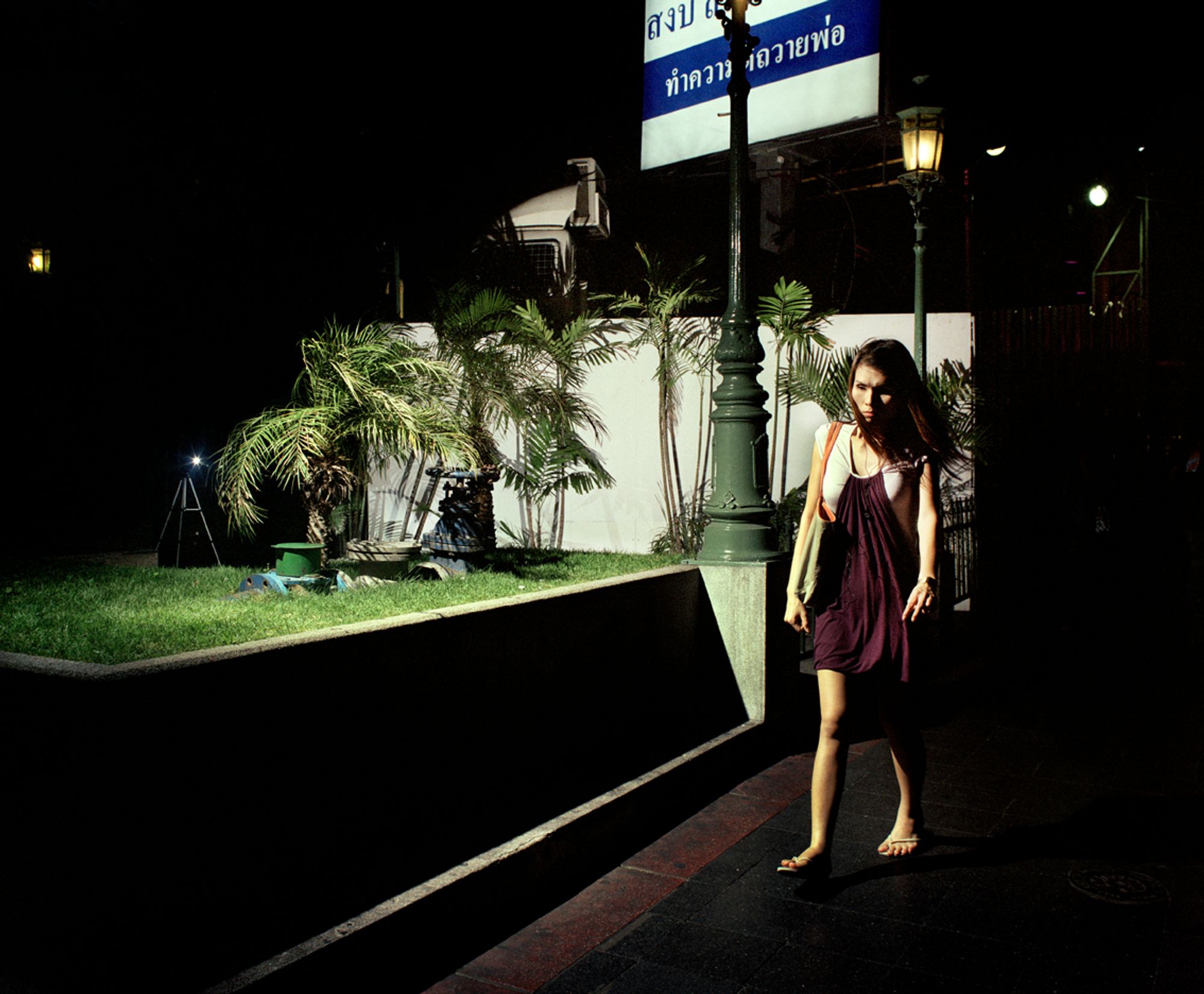 Provoking accidentsSometimes the photographs contain elements that seem to suggest a rapidity or improvisational quality, e.g. somebody who strokes a cat, the flying pigeons in the park or the ladyboy who seems to wipe her eyes. This peculiar quality adds a supplementary layer of ambiguity. Is the photograph staged? And if so, why? Of course, unpredictable or uncontrollable elements make a photograph come alive, but in this particular case the unpredictable elements are a means to approach real life despite the diligent set preparation, lighting and framing. If everything would be controlled, the photographs wouldn't be ambiguous: they would only depict a staged reality. Through working slowly and diligently, the photographers create a situation in which unexpected things can take place: birds can fly, a cat can pass or a person can pluck something from his or her eyelashes. The most powerful photograph in this respect is the one in which a partly lit sex tourist enters the dark but tender world of a perfectly framed portrait. Another photograph shows us a nocturnal setting. On the left we see a tripod that casts light on the background (the palm trees and the white wall), turning the scene into a theatrical setting, while an invisible spotlight lights the face of a person who actually happened to pass by. In the interview at the end of this text the photographers tell me: “The setting is controlled, but we try to capture the spontaneity of a special moment.” In this way, they obtain a playful tension, comparable to the special quality of the movies by John Cassavetes, who rehearsed intensively with his actors until their movements were exactly known to the cameramen, who were then invited to move freely around and shoot whatever they liked to shoot. As a result, the cameras move in an incredible free way and make the most extraordinary movements, while often capturing special acting moments because the cameramen exactly knew when these would take place.