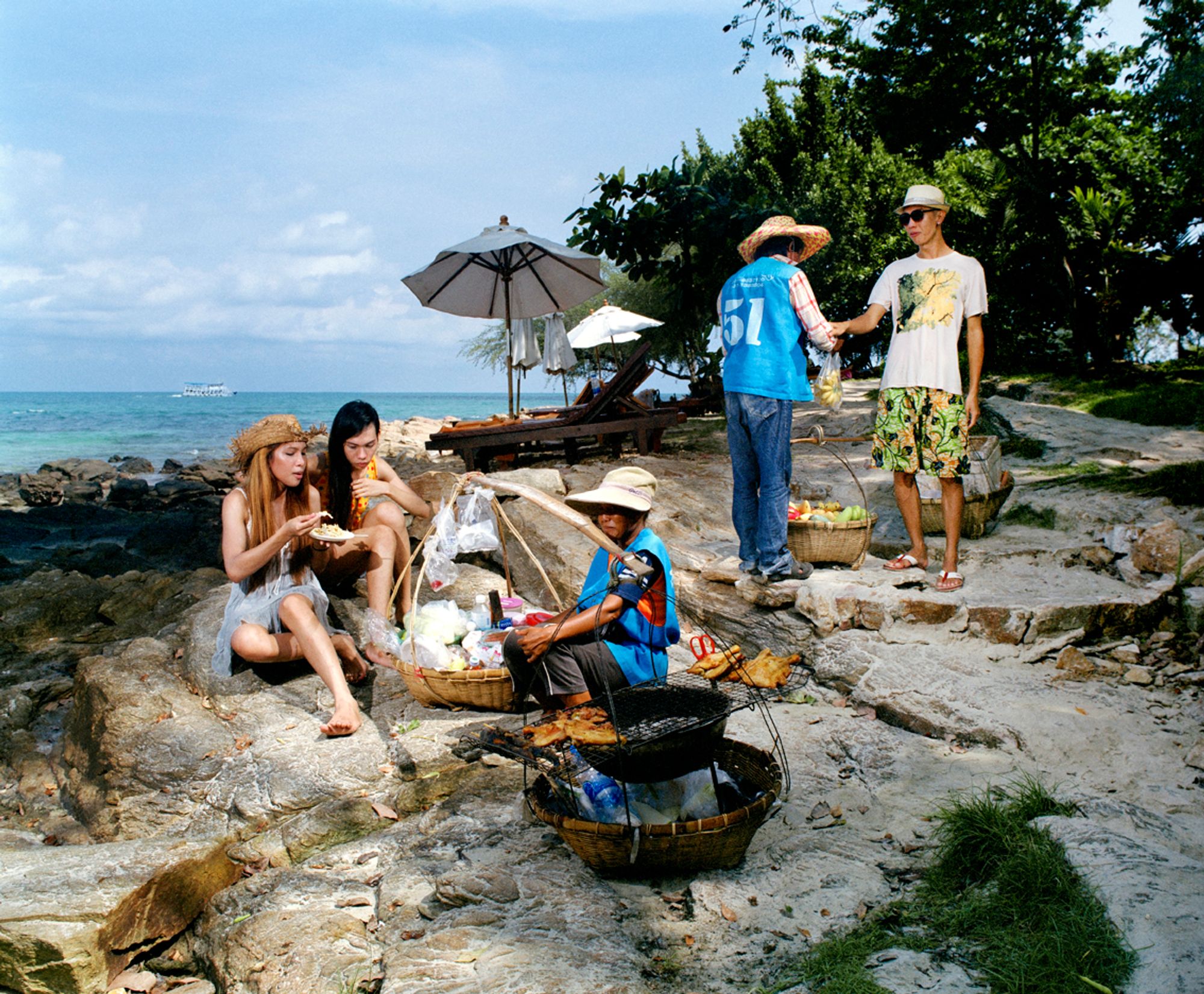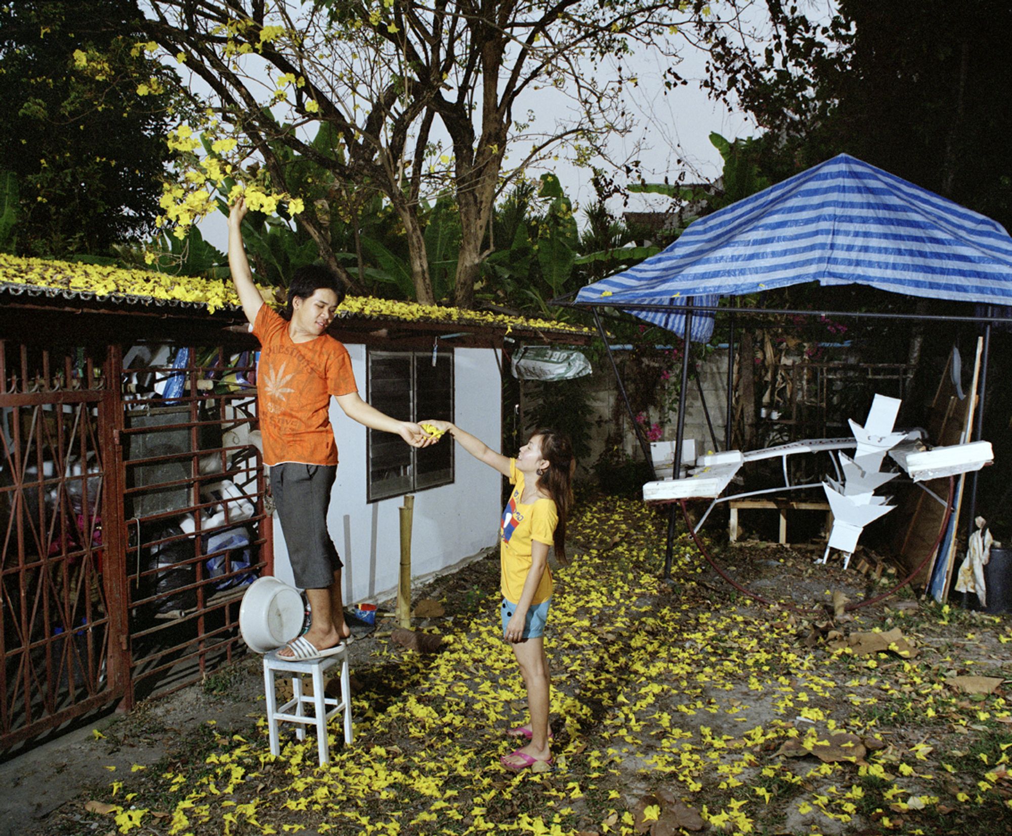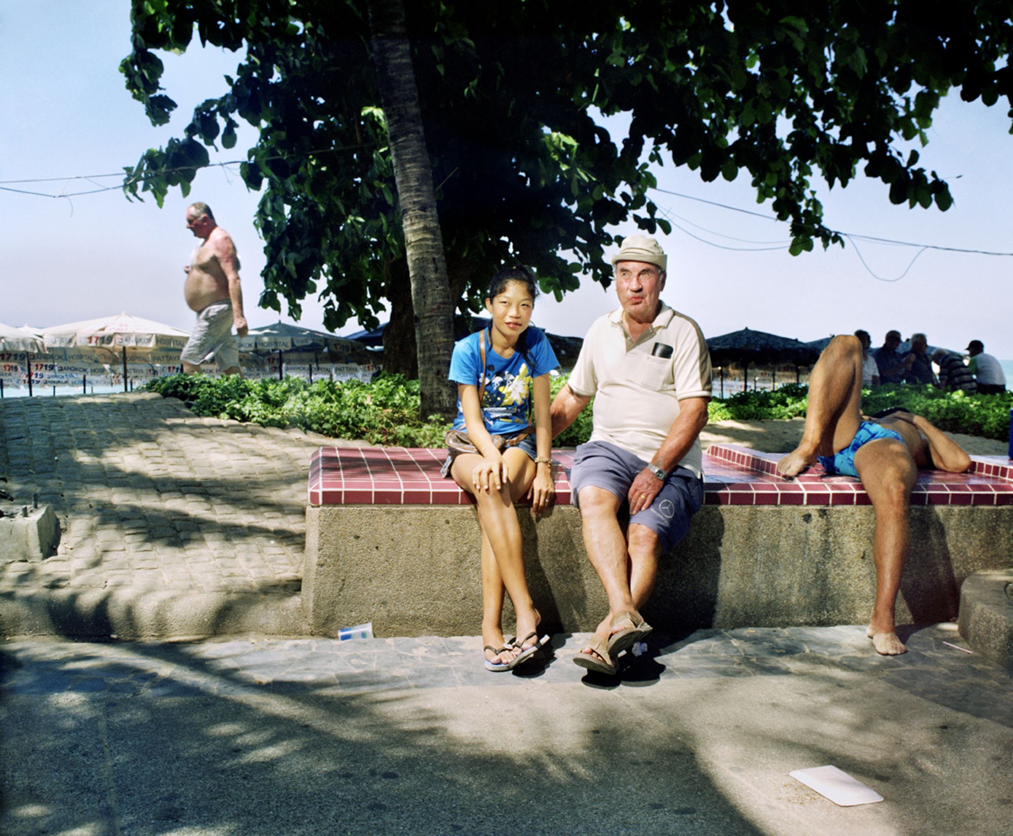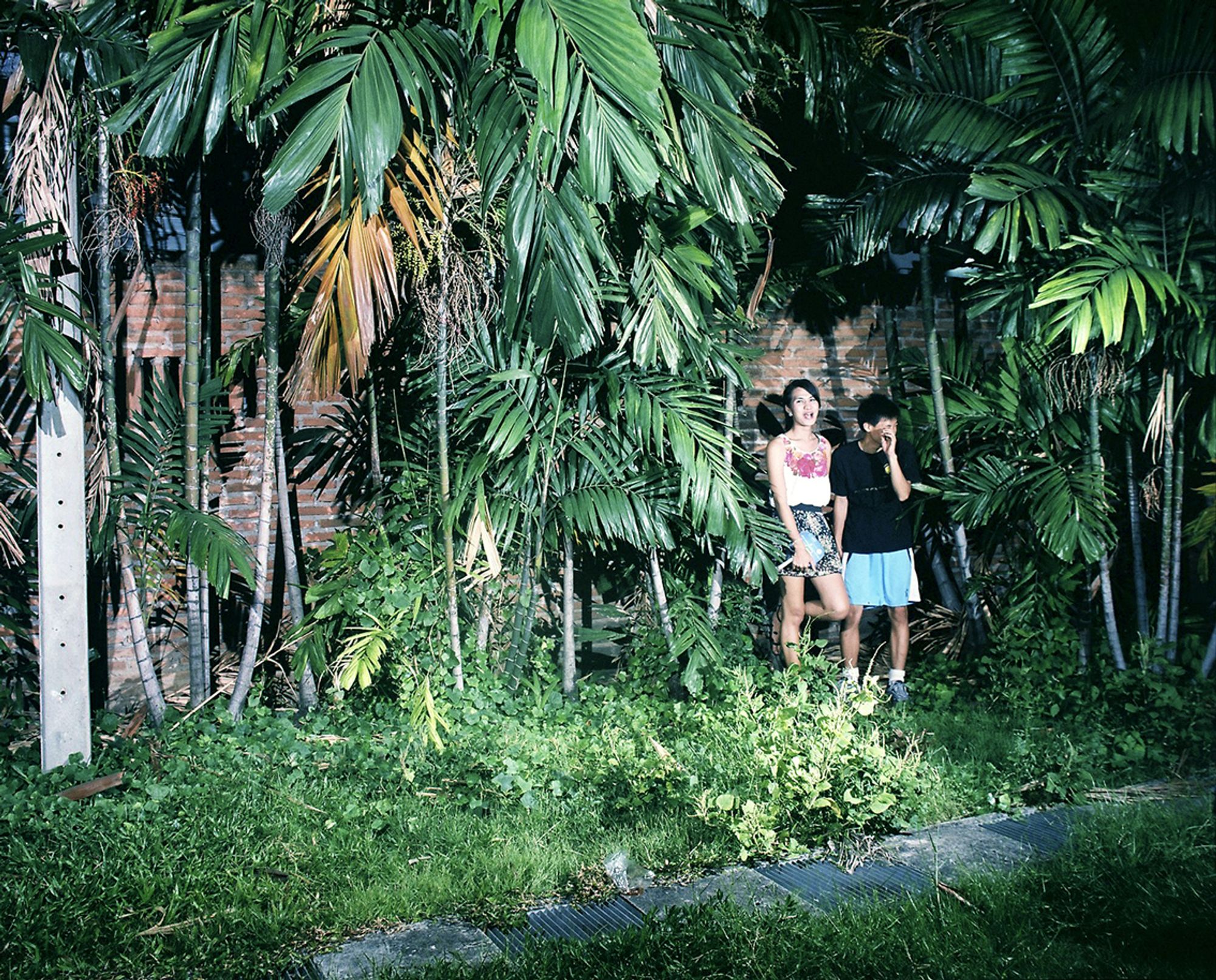 Provoking accidentsSometimes the photographs contain elements that seem to suggest a rapidity or improvisational quality, e.g. somebody who strokes a cat, the flying pigeons in the park or the ladyboy who seems to wipe her eyes. This peculiar quality adds a supplementary layer of ambiguity. Is the photograph staged? And if so, why? Of course, unpredictable or uncontrollable elements make a photograph come alive, but in this particular case the unpredictable elements are a means to approach real life despite the diligent set preparation, lighting and framing. If everything would be controlled, the photographs wouldn't be ambiguous: they would only depict a staged reality. Through working slowly and diligently, the photographers create a situation in which unexpected things can take place: birds can fly, a cat can pass or a person can pluck something from his or her eyelashes. The most powerful photograph in this respect is the one in which a partly lit sex tourist enters the dark but tender world of a perfectly framed portrait. Another photograph shows us a nocturnal setting. On the left we see a tripod that casts light on the background (the palm trees and the white wall), turning the scene into a theatrical setting, while an invisible spotlight lights the face of a person who actually happened to pass by. In the interview at the end of this text the photographers tell me: “The setting is controlled, but we try to capture the spontaneity of a special moment.” In this way, they obtain a playful tension, comparable to the special quality of the movies by John Cassavetes, who rehearsed intensively with his actors until their movements were exactly known to the cameramen, who were then invited to move freely around and shoot whatever they liked to shoot. As a result, the cameras move in an incredible free way and make the most extraordinary movements, while often capturing special acting moments because the cameramen exactly knew when these would take place.