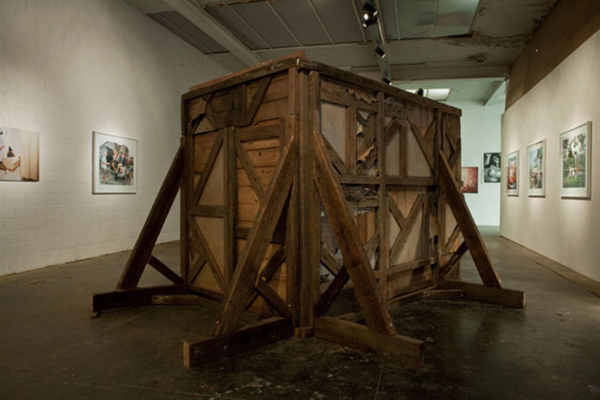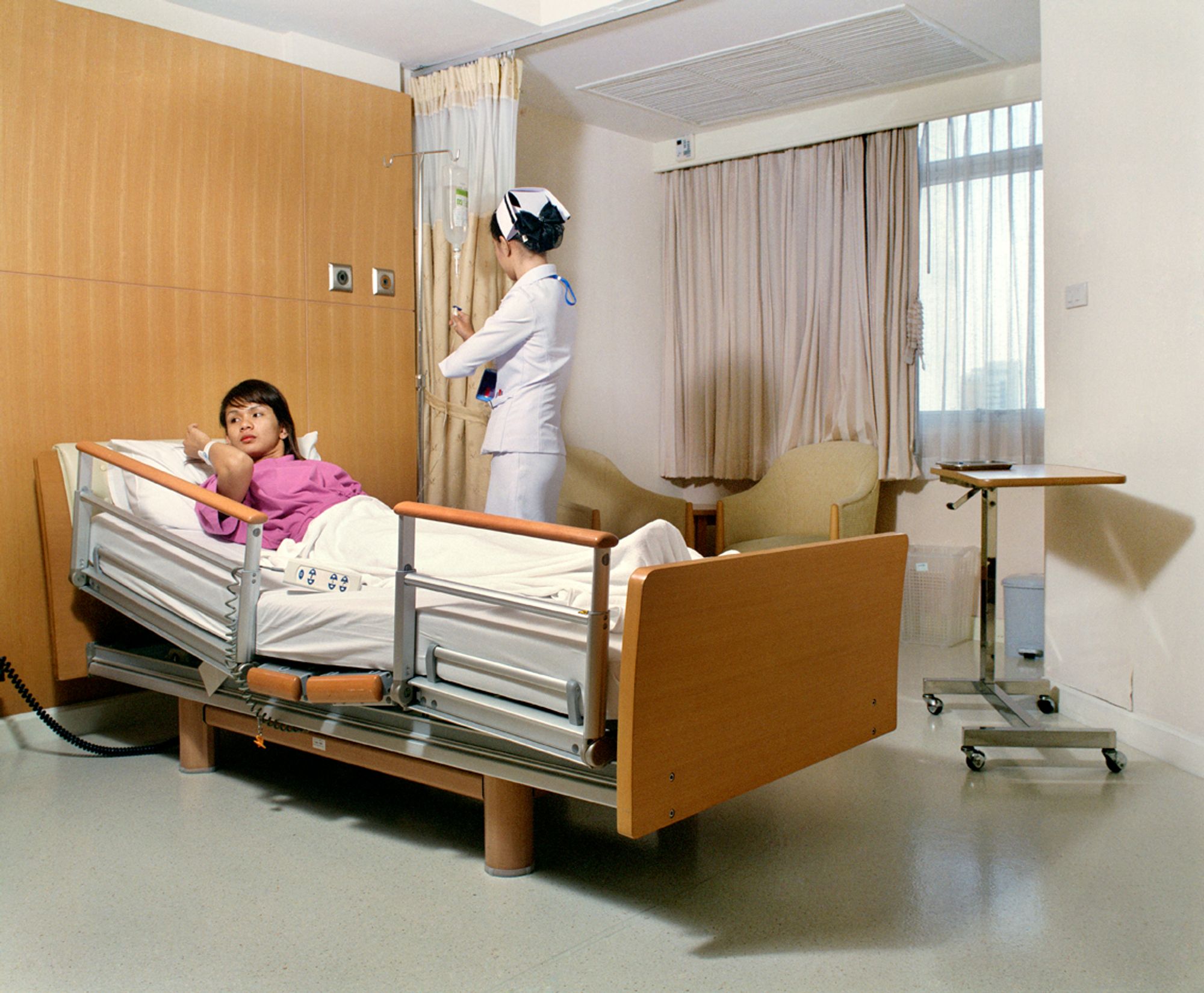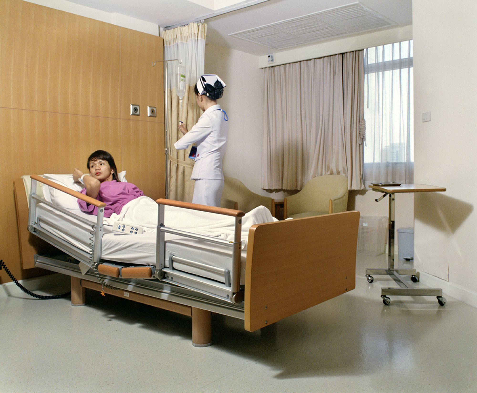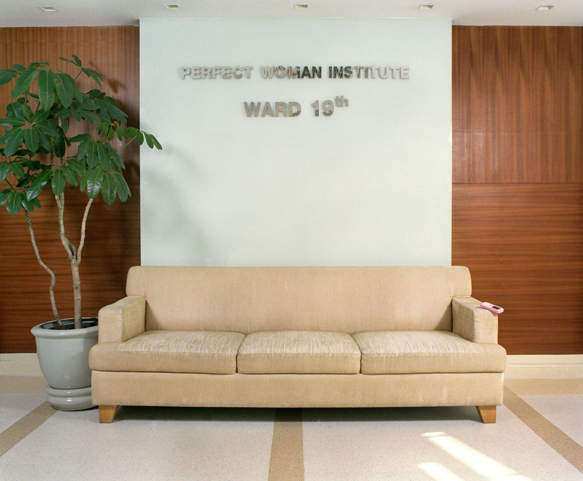 Compositions and theater setsA painter once told me that he wanted the onlooker of his paintings to wander around in them. I think this is what happens in these photographs. Due to the intricate lighting and compositions, Pinckers and De Bruyn create images with several layers of depth, or moments of depth, that present themselves as stepping stones for the eye of the beholder. Some photographers prefer to create an image that is parallel to the horizon or the back surface of the photographed object. Other photographers like to deviate slightly from the horizon. In the photographs we see here, perspective is used to create a varying range of folded, harmonica-like spaces. Sometimes the middle of a photograph shows us the corner of a room (but never without at least one possibility of escape on the border), sometimes this effect is reinforced by elements on the foreground (doors, curtains, armchairs etc.), sometimes a corner or another protruding element comes towards us in the middle of the photograph, sometimes two elements that come towards us divide the surface of the photograph into three vertical parts. As a result, the photographs seem to depict a space that is alive, like a forest, but also a space that functions as a theater set or the set of a photo studio. The effect of these compositions is double: they reinforce the impression of an artificially arranged space, but at the same time they enhance a feeling of poor housing and entrapment. In both cases they seem to reveal the mechanics behind the decoration of lobbies, hotel rooms, hospital wards, cabinets of medical doctors, night clubs and, finally, nearly every public and private space: they are sets, theater stages, decorated with useless, meaningless and ugly props, ordering people what to do or not to do. On the other hand, the repetition of similar compositions in different situations creates new relationships between different photographs and depicted situations, e.g. between the photograph of the man who seems to be the owner of a clinic (with the two armchairs on the foreground), the photograph of the post-operation diapers and the photograph of the grave.