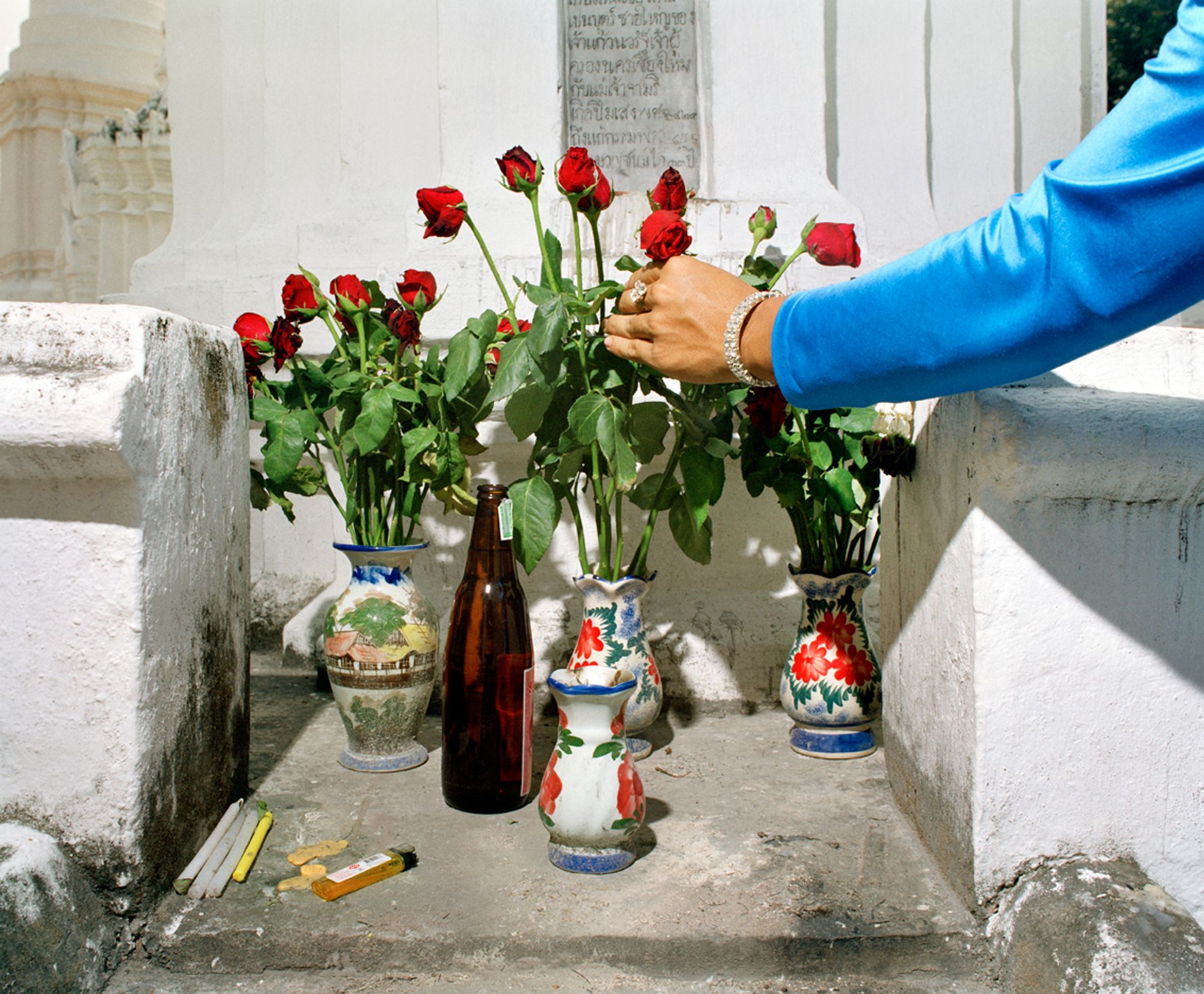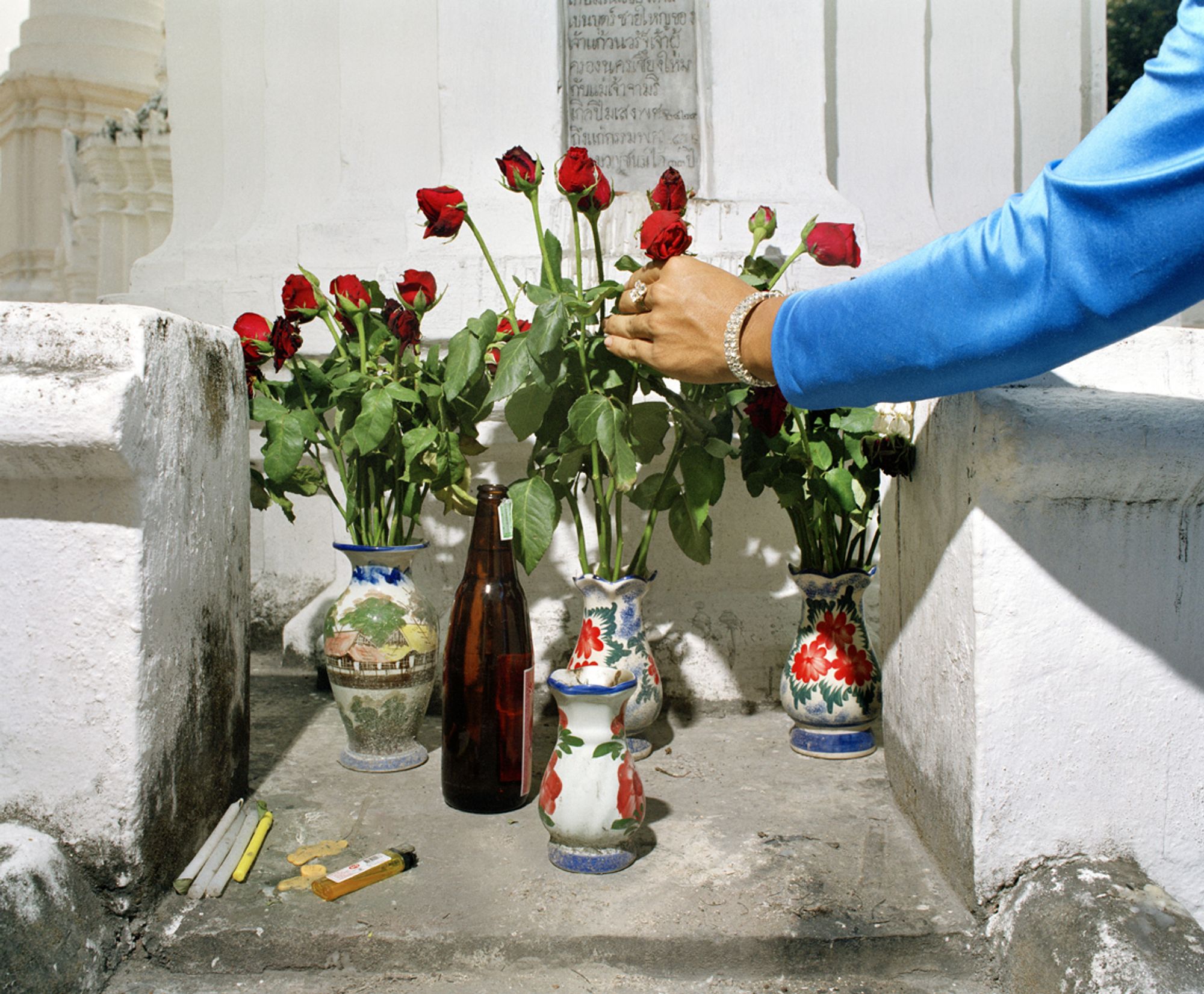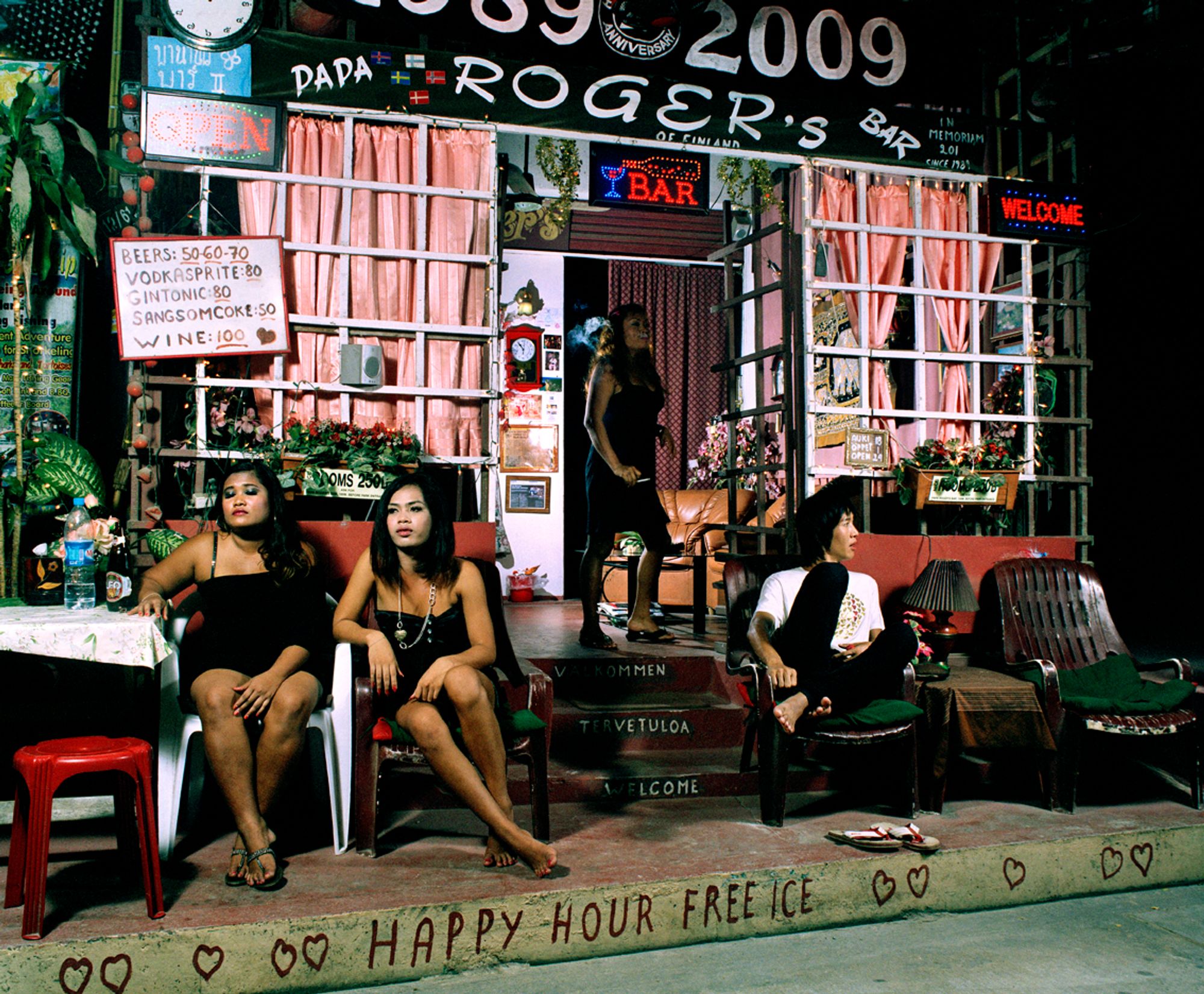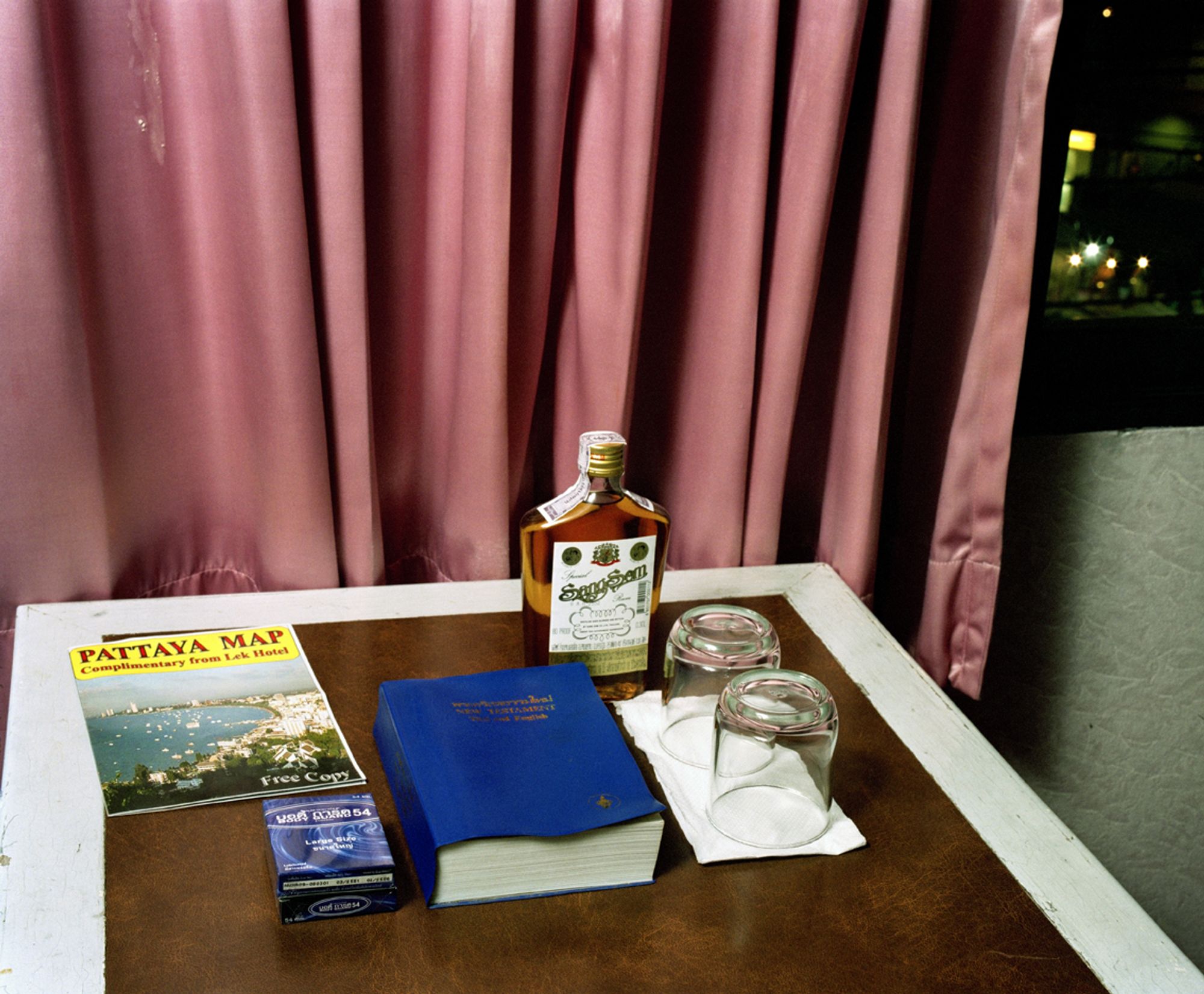 Mass tourismThe photographs of Lotus were made in Thai cities such as Chiang Mai, Bangkok, Lamphun, Petchabun, Koh Samet and Pattaya. This last city is a typical destination for sex tourists, some of which have sex with so-called ladyboys. This book opens with a photograph that shows us a basic set of objects tourists receive upon arrival in certain hotels: a pack of “large size” condoms, a city guide, a bottle of Thai whisky and a copy of the New Testament. This photograph sets the tone of the series. It shows us a sordid reality, camouflaged or rationalized by a minimal, orderly setting. A pink curtain, bearing a repelling stain, suggests a theater and an aspiration to glamour or luxury. The askew composition of the photograph shatters the lie of the lined up objects. Apparently the map of Pattaya was moved. Now it breaks the white border of the table, which seems to function as a frame or a passe-partout. The curtain casts a dark shadow that leads us to the actual focus point of the photograph: the nocturnal life in the city.
