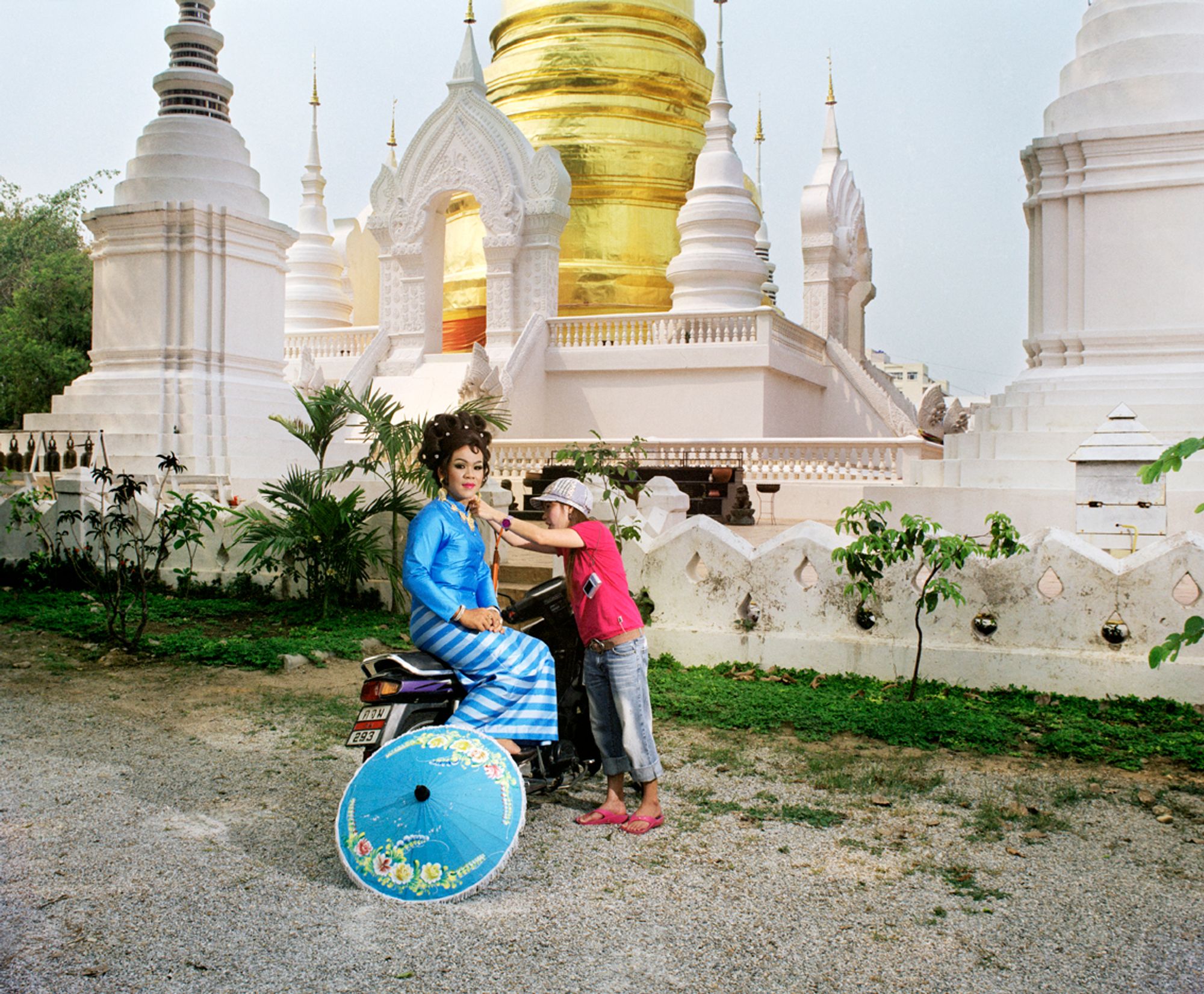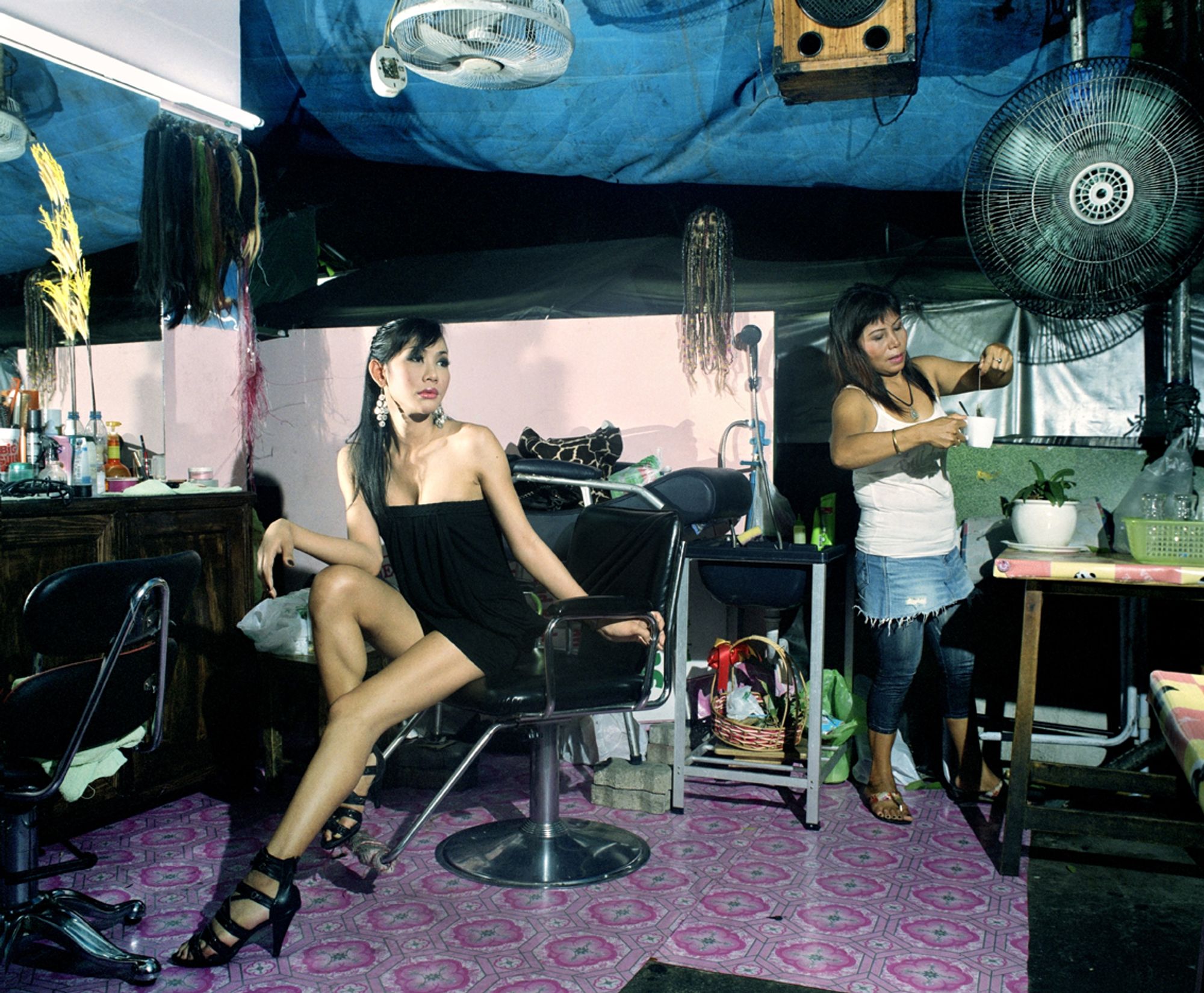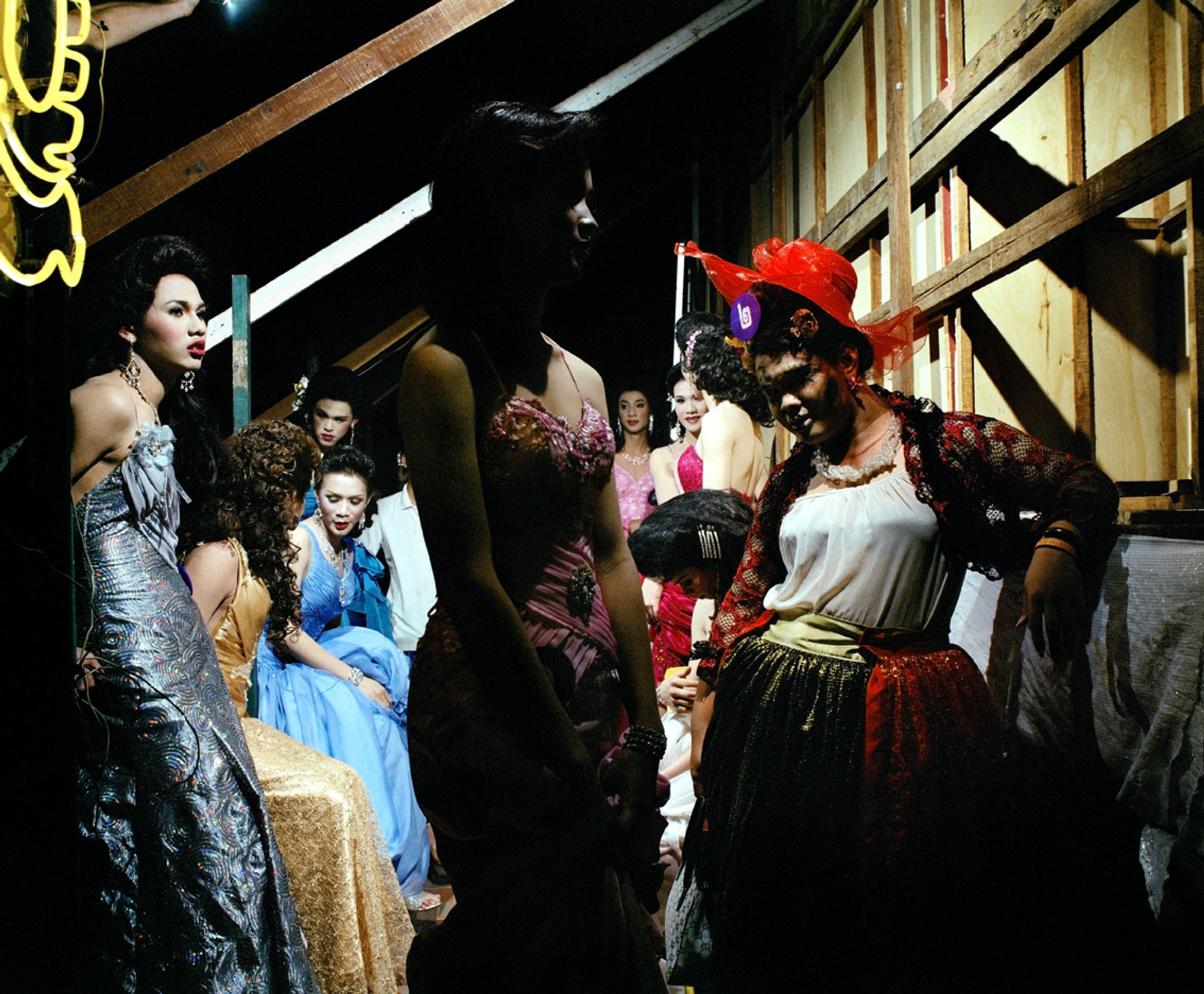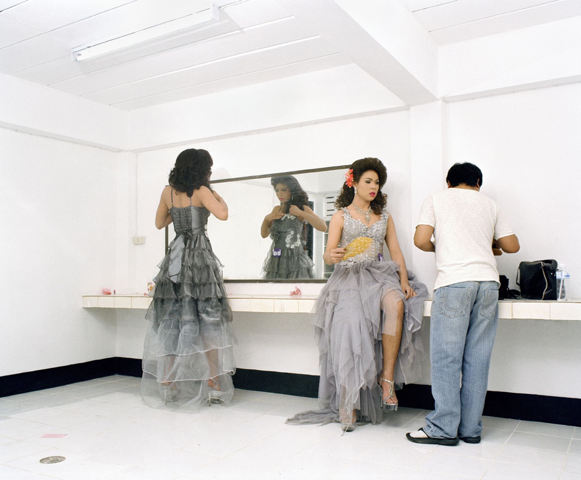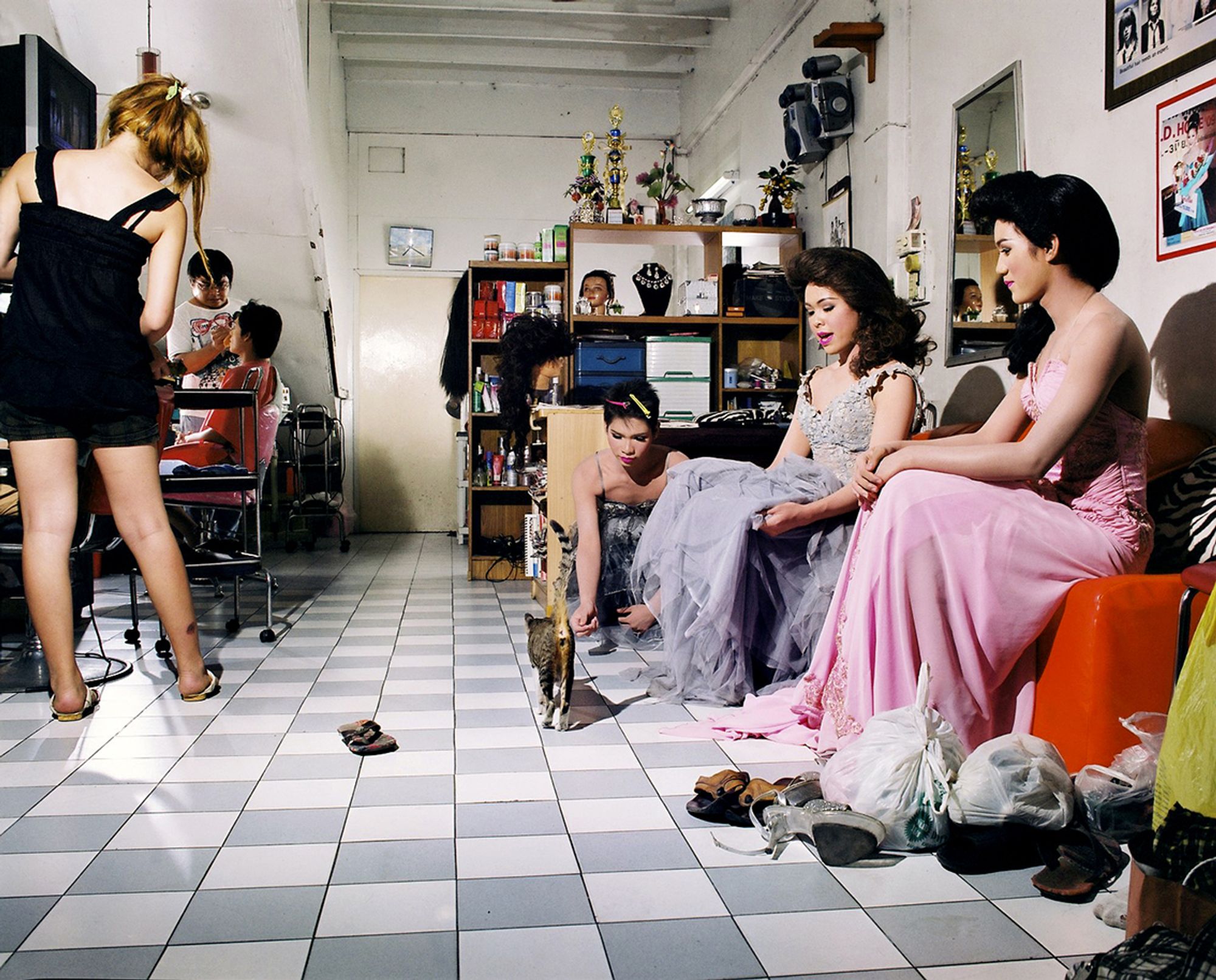 Finally, I would like to say something about the numerous instances in these photographs where we see people touching each other. Also due to these elements, the general feeling generated by these photographs is a feeling of tenderness. Never do we feel a judgmental attitude. The photographers make us think of investigators with an open mind, revealing aspects of our reality we wouldn't know without their attempts to register them. One of the main ideas that underlie this adventure seems to be the awareness that reality cannot be documented without artificial means or without constructing an image. This awareness shows itself in the decision to document the lives of ladyboys, who try to construct a new image of themselves, but also in the surfacing of all the people who help each other getting dressed, who take care of each other’s make-up etc. When Jimmy Stewart in Vertigo dresses Judy, he mirrors Hitchcock himself, as a movie director, but also every boy who wants to find a girl resembling somebody he knew in his childhood.