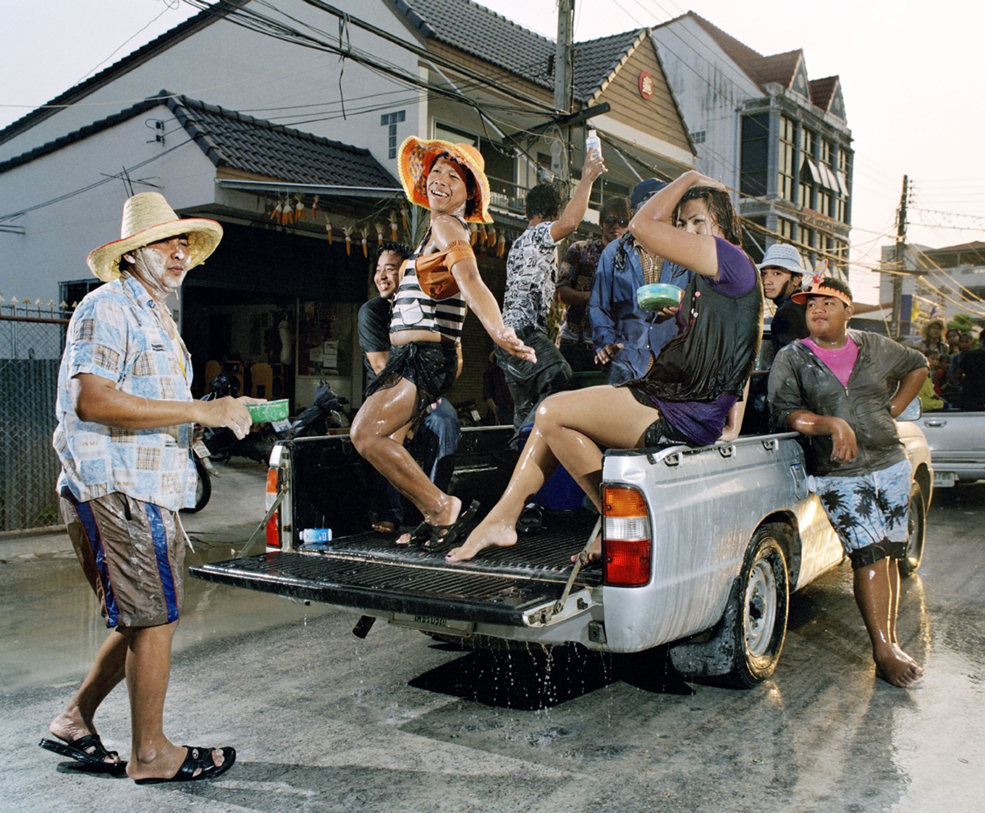 In the photographs by Pinckers and De Bruyn this meta-level is introduced by similar strategies (the presence of a tripod, the presence of a painting next to a constructed breast, people participating in the photographic act or people making photographs of others) but also through the use of set decoration, sophisticated framing and artificial lighting. Furthermore, several photographs in this series shed some light on their construction. In one photograph we see flying water or wet people, in another we meet people with buckets who seem to have acted as assistants of the photographers by throwing the water. In one photograph we see a living room decorated as a set, in another photograph we meet our protagonists behind a real stage. In one photograph we see somebody making a picture of a person wearing a bikini, in another photograph we see a close up of the same person, revealing her damaged skin.