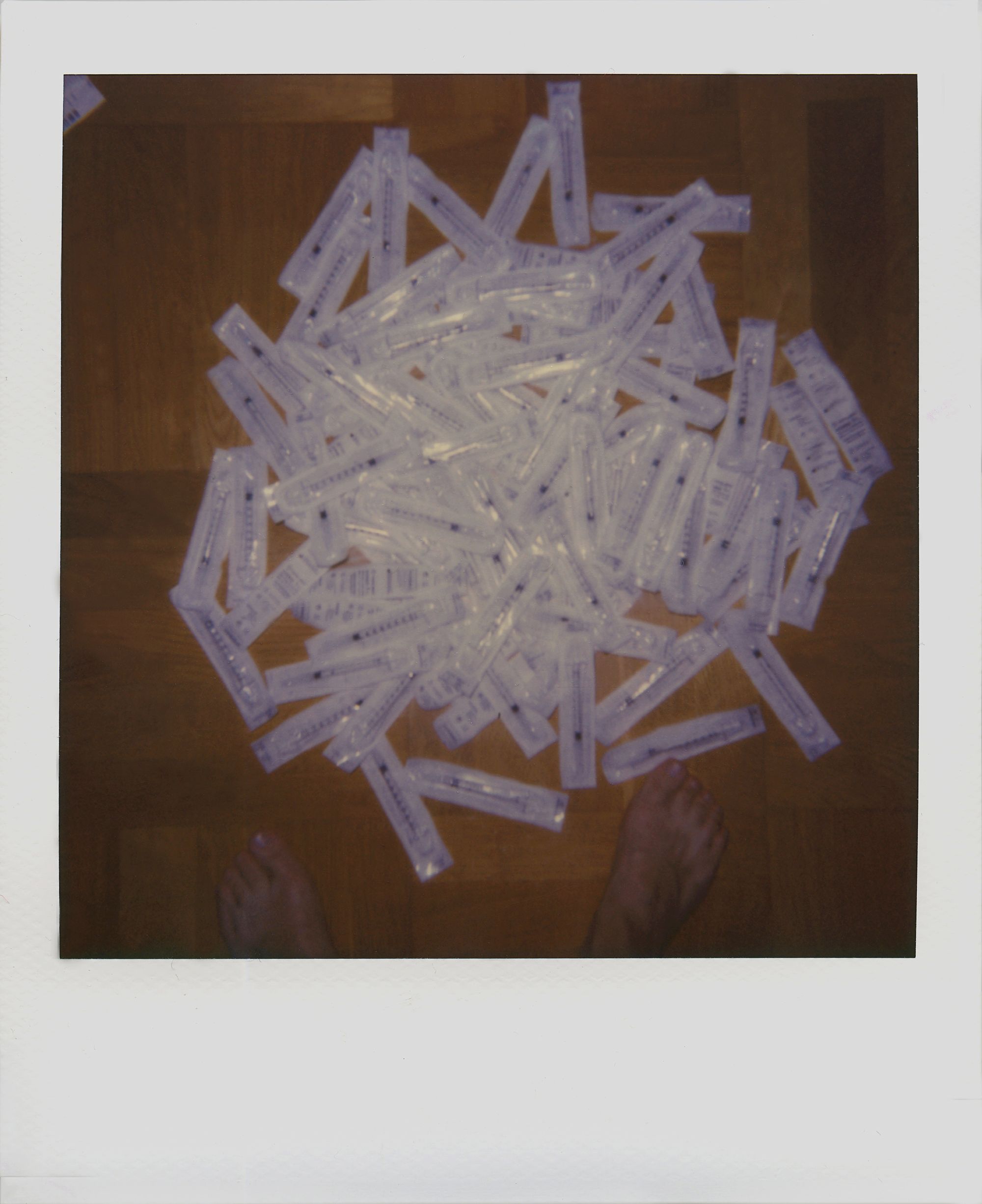 Malin takes a picture of the syringes on her living room floor. They are a part of the medical kit she needs to prepare her hormones for an upcoming IVF. The clinic later cancelled her IVF appointment since she did not produce enough eggs for an outtake.