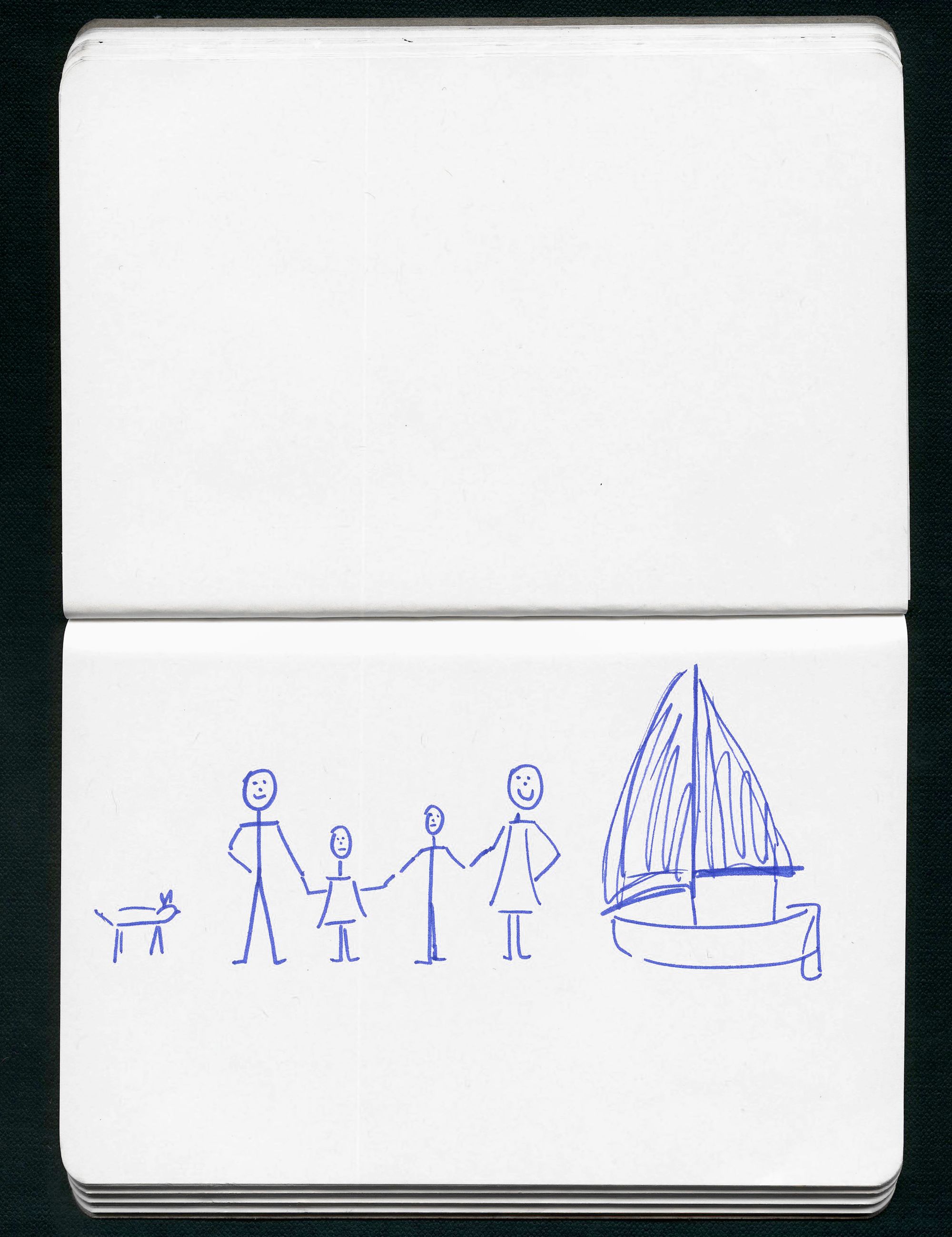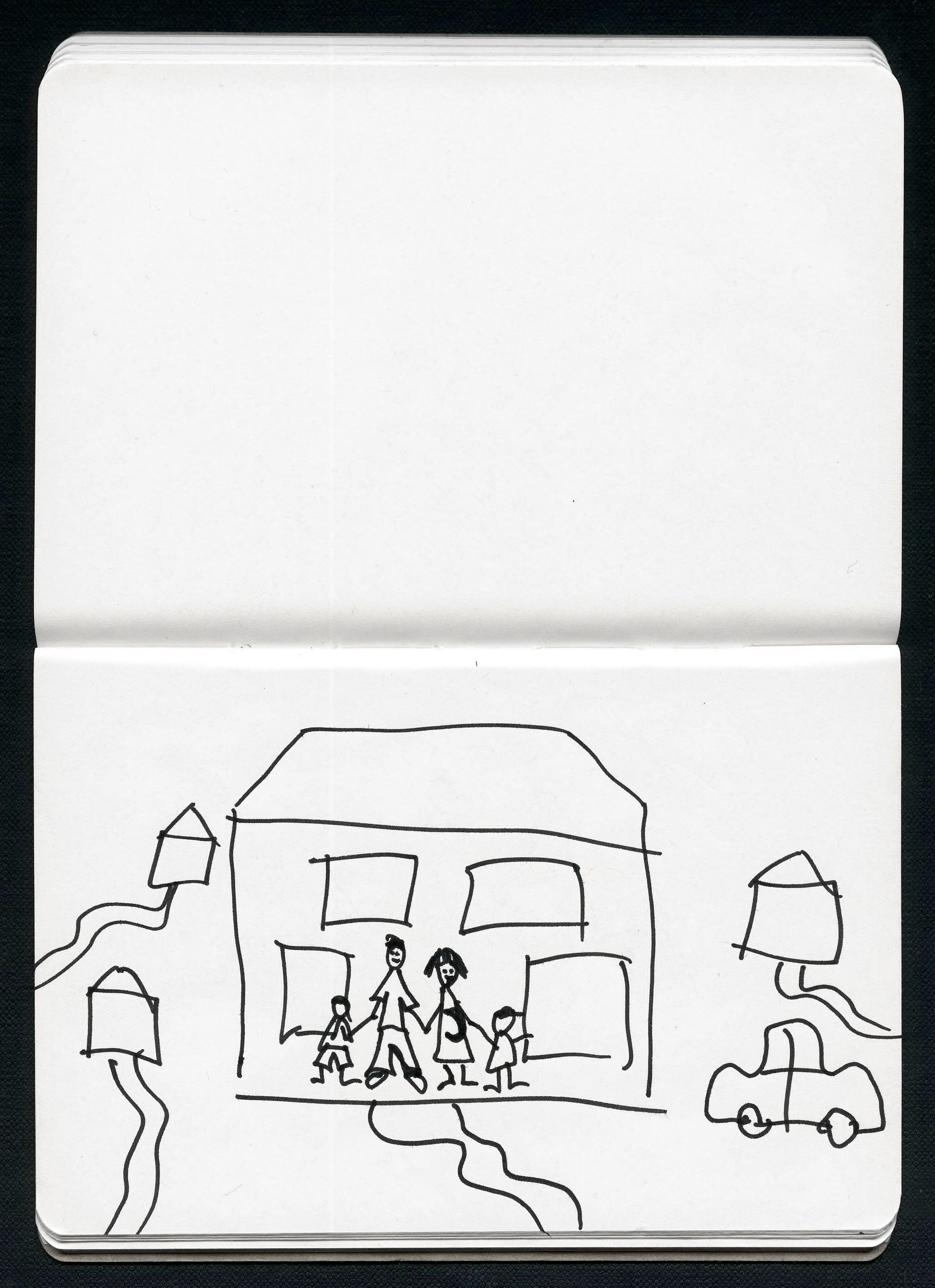 Jenny's sketch of her family, the way she imagined it when growing up. She lives with her son in central Stockholm.