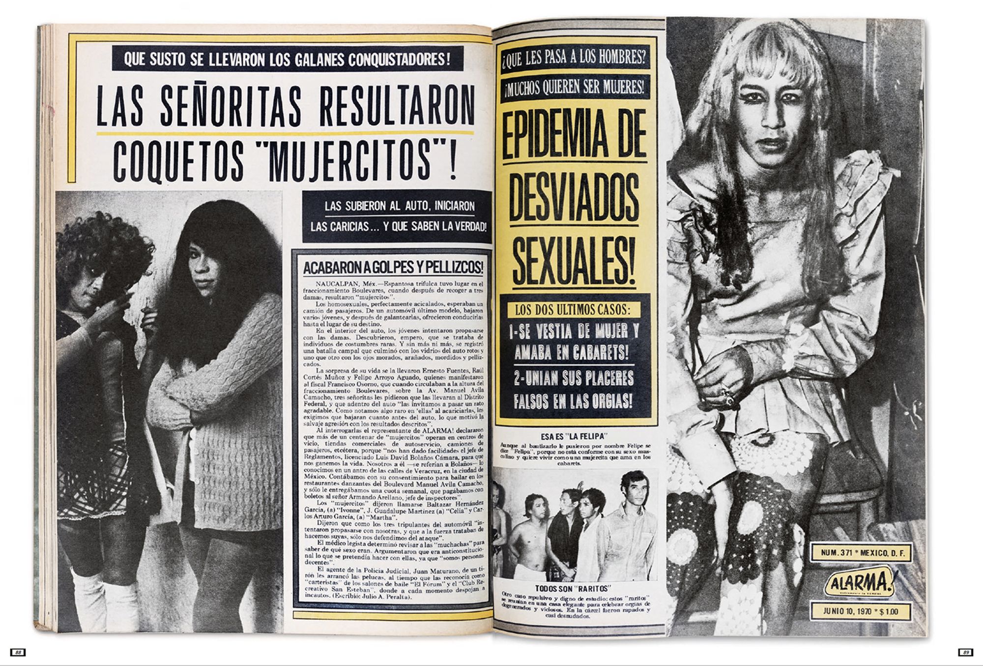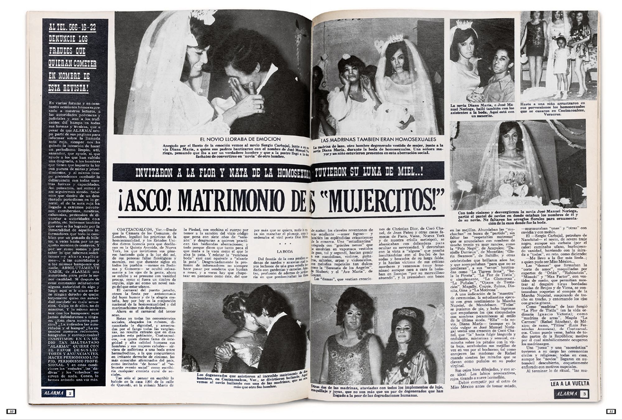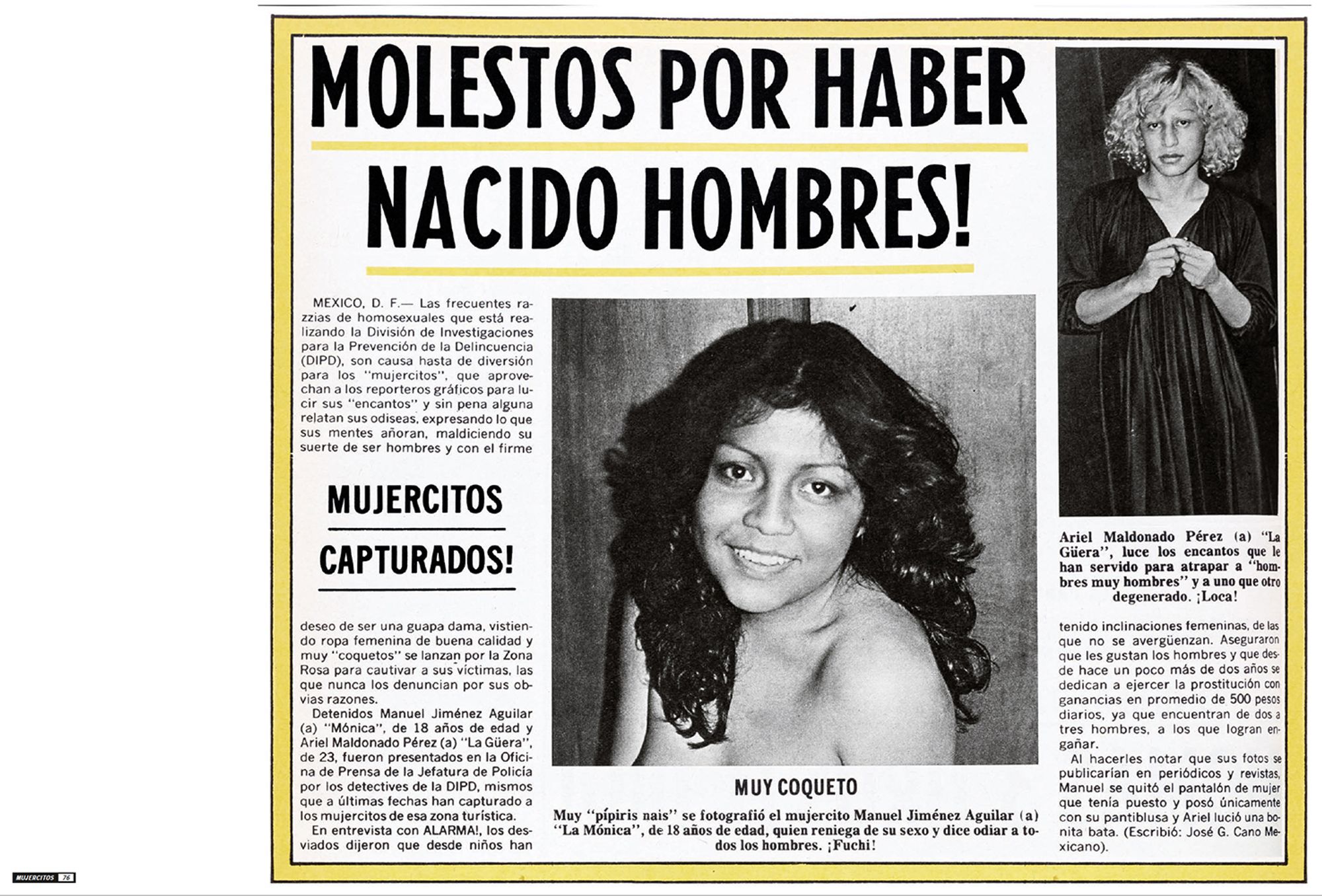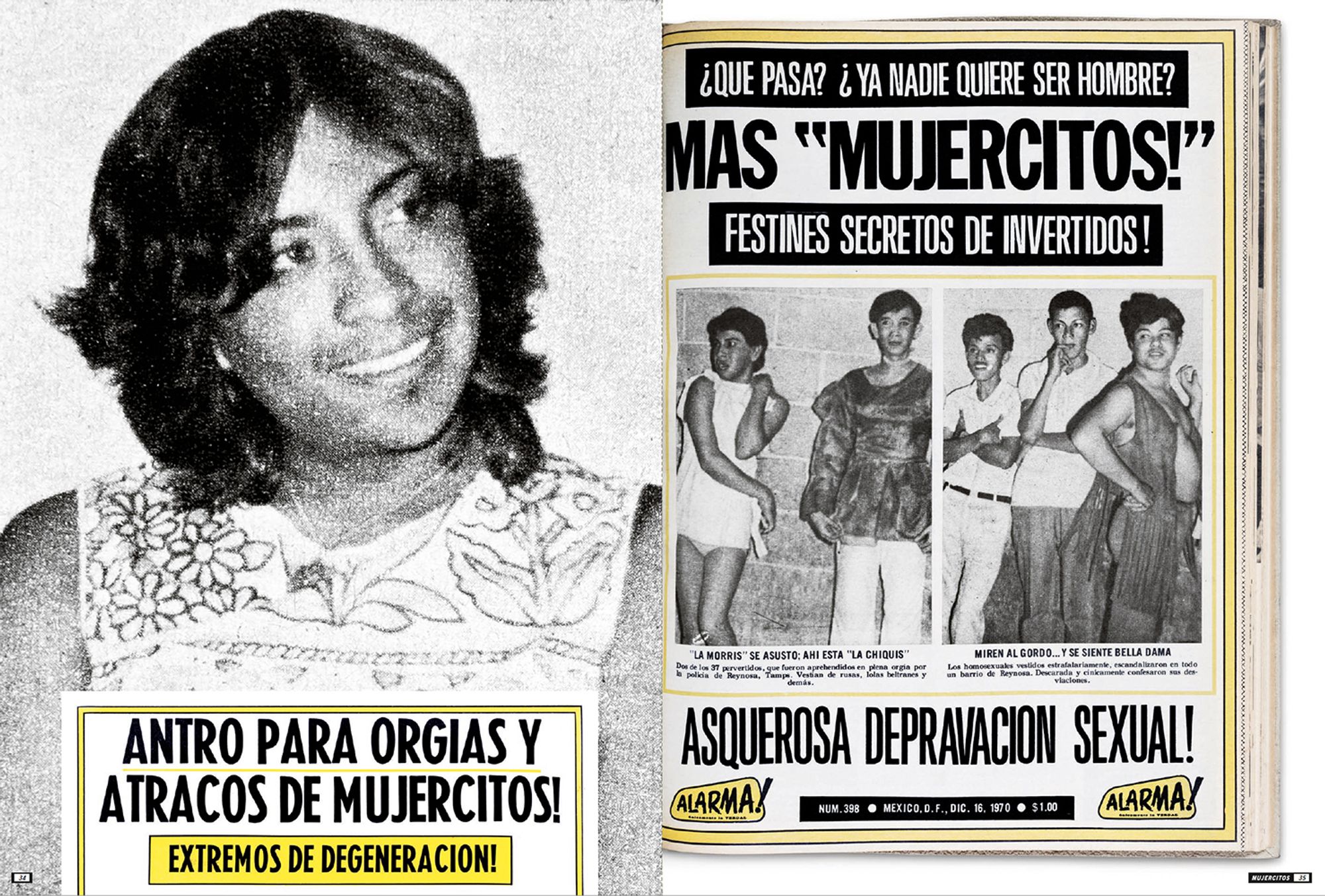 The photographs presented here portray highly sexualised subjects taking centre stage within the images, smiling provocatively at the photographer, and reversing the power dynamics between the photographer and the photographed. These photographs were shown in the magazine Alarma! Únicamente la Verdad! (Hereafter Alarma) during the 1970s. Alarma is the definitive example of the Nota Roja, published weekly since 1963 and finally ending its publication in 2014. Nota Roja designates periodical publications with gruesome textual and photographic content, newspaper sections that deal with violent events, or sensationalist television, tainted with morbidity. Mujercitos, the term coined during the mid-1960s by Carlos Zamayoa, Alarma’seditor-in-chief at the time, was used as a synonym for “effeminate man,” playing with the notion of gender through a grammatical feminisation of the male subject by adding a comedic pun.