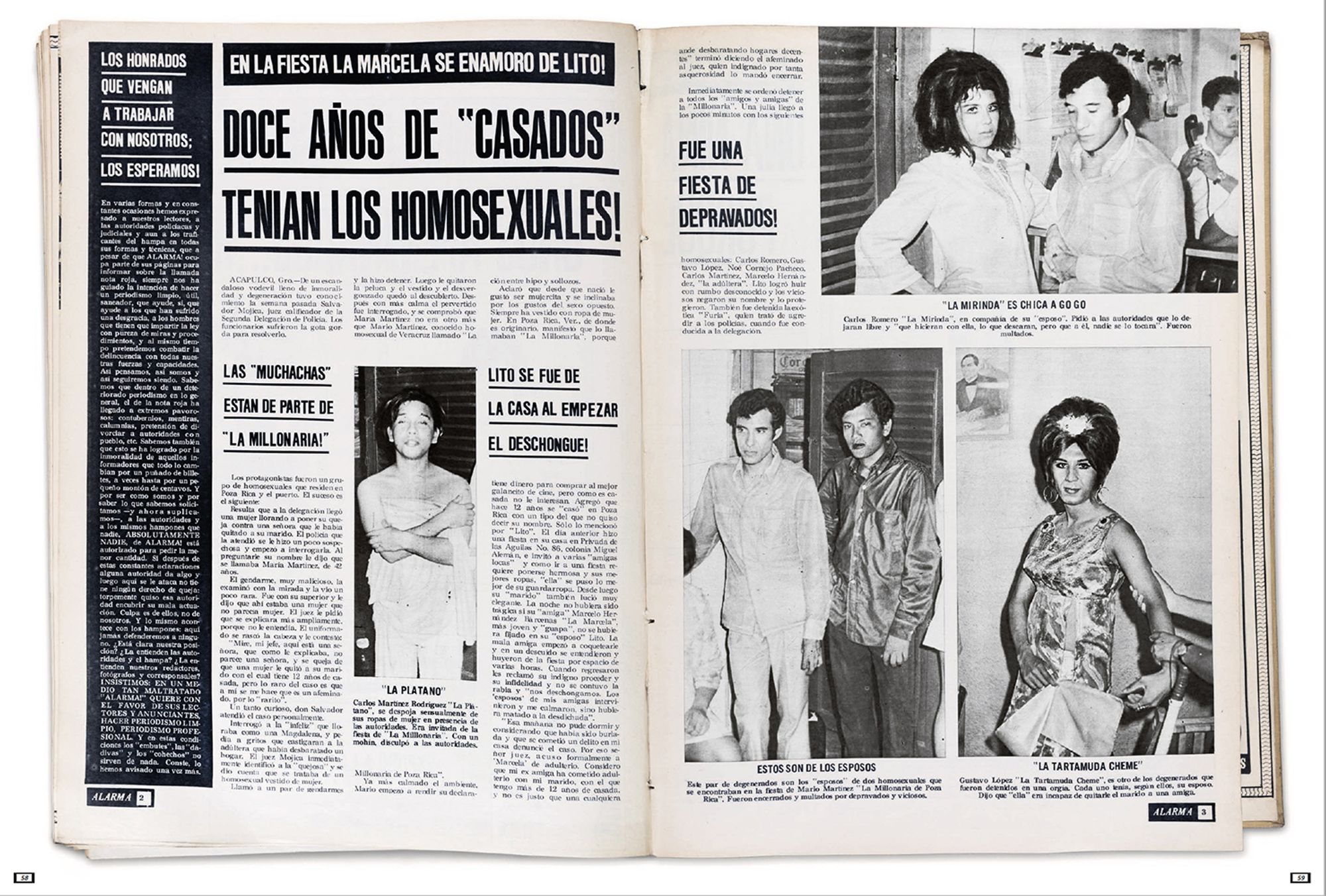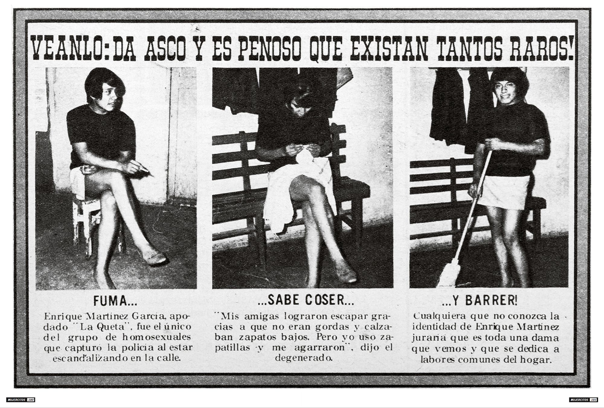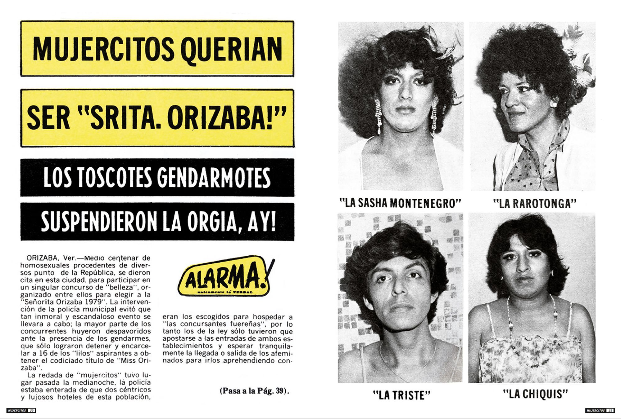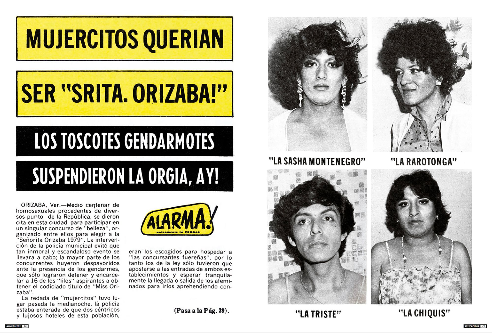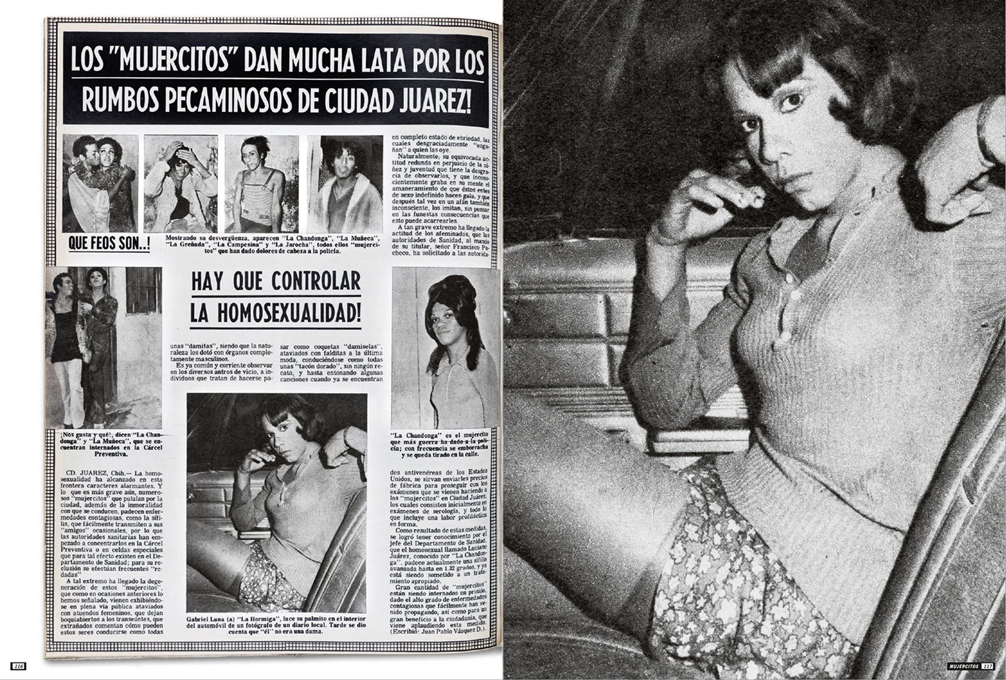 The photographs presented here portray highly sexualised subjects taking centre stage within the images, smiling provocatively at the photographer, and reversing the power dynamics between the photographer and the photographed. These photographs were shown in the magazine Alarma! Únicamente la Verdad! (Hereafter Alarma) during the 1970s. Alarma is the definitive example of the Nota Roja, published weekly since 1963 and finally ending its publication in 2014. Nota Roja designates periodical publications with gruesome textual and photographic content, newspaper sections that deal with violent events, or sensationalist television, tainted with morbidity. Mujercitos, the term coined during the mid-1960s by Carlos Zamayoa, Alarma’seditor-in-chief at the time, was used as a synonym for “effeminate man,” playing with the notion of gender through a grammatical feminisation of the male subject by adding a comedic pun.